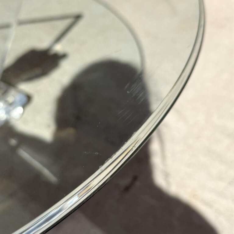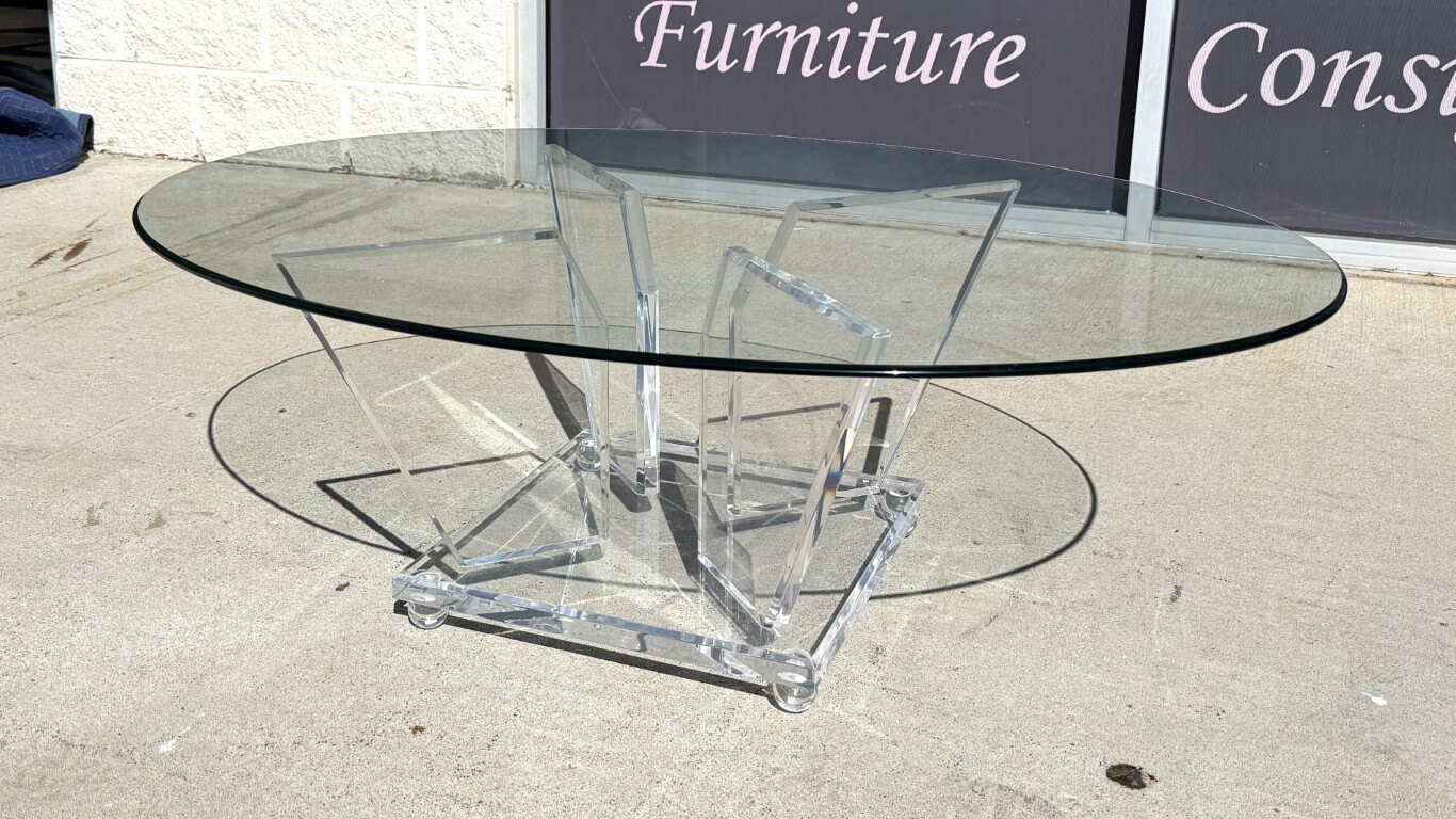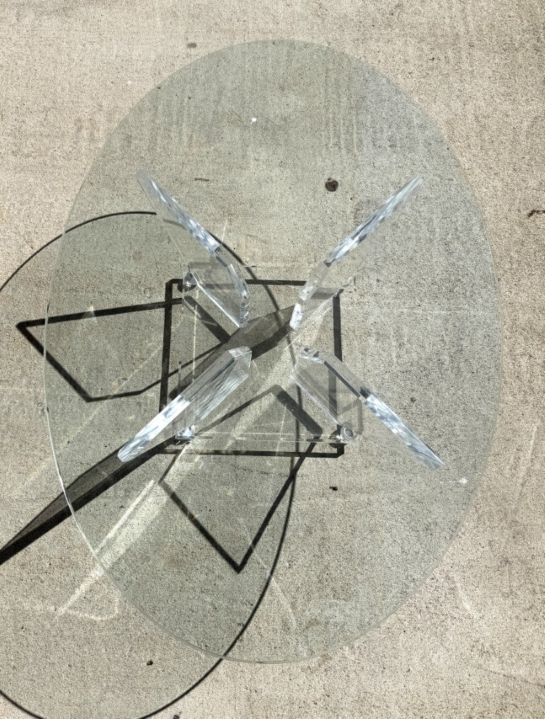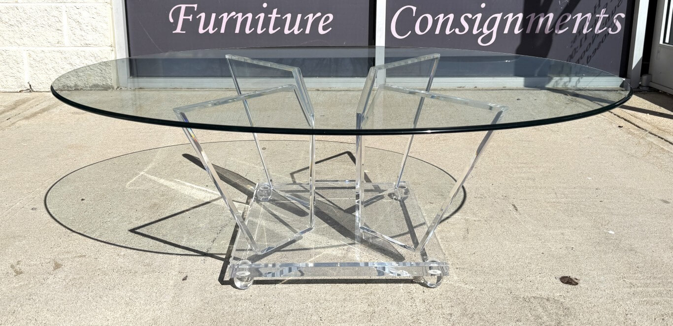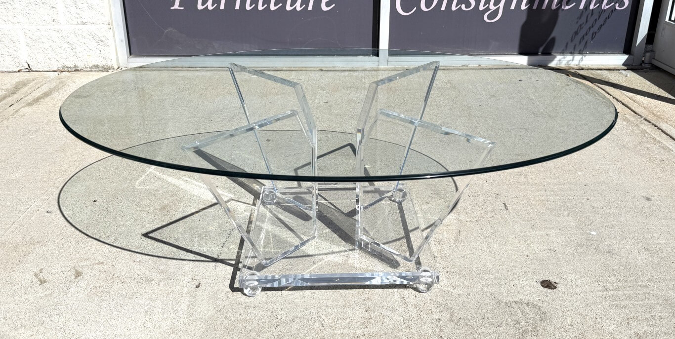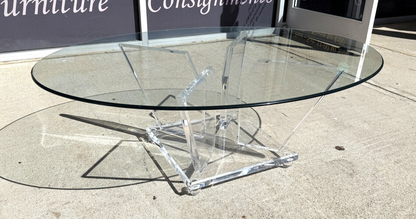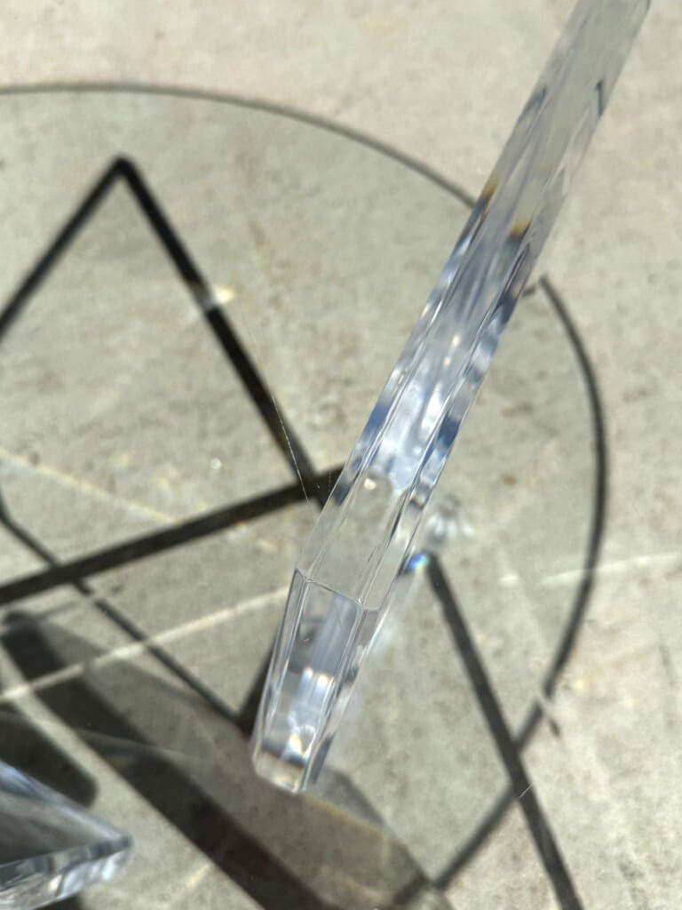 This contemporary glass-top table features a sleek, beveled circular surface resting on a striking sculptural acrylic base, creating a light and airy presence. The transparent design adds modern sophistication while allowing it to seamlessly complement a wide range of interiors without overwhelming the space.