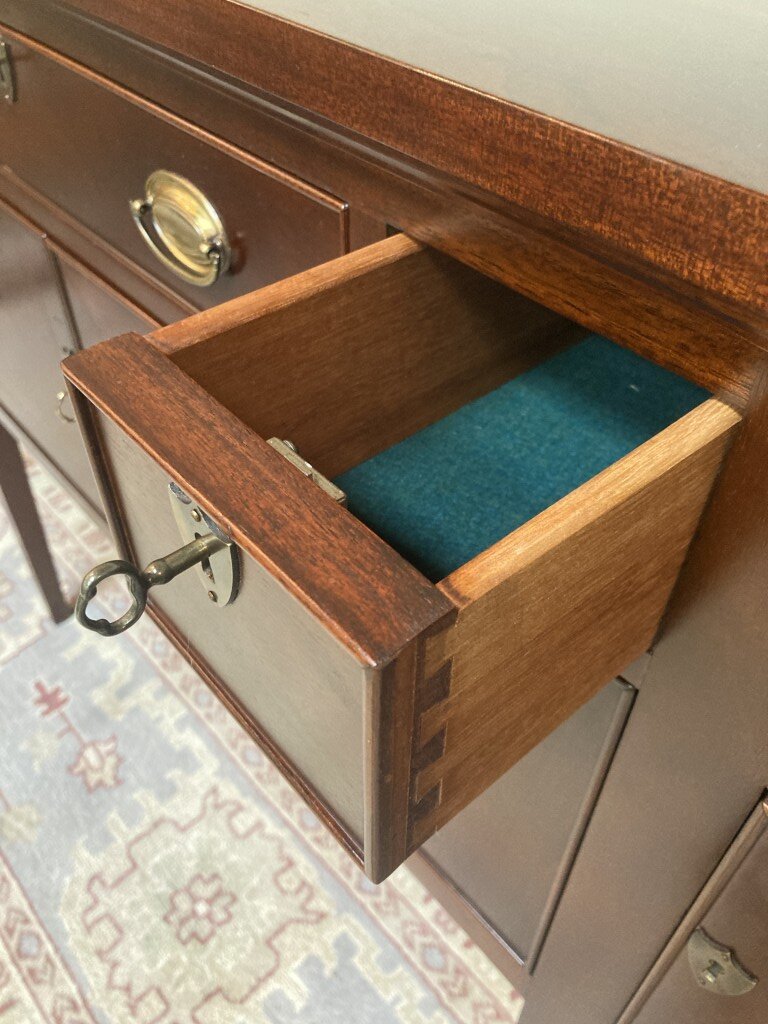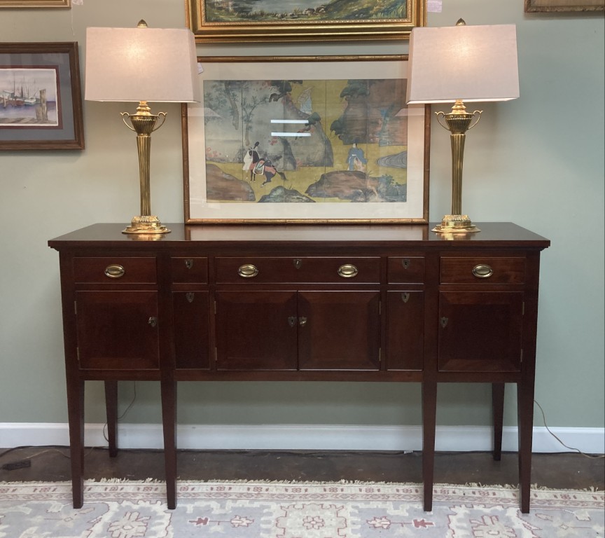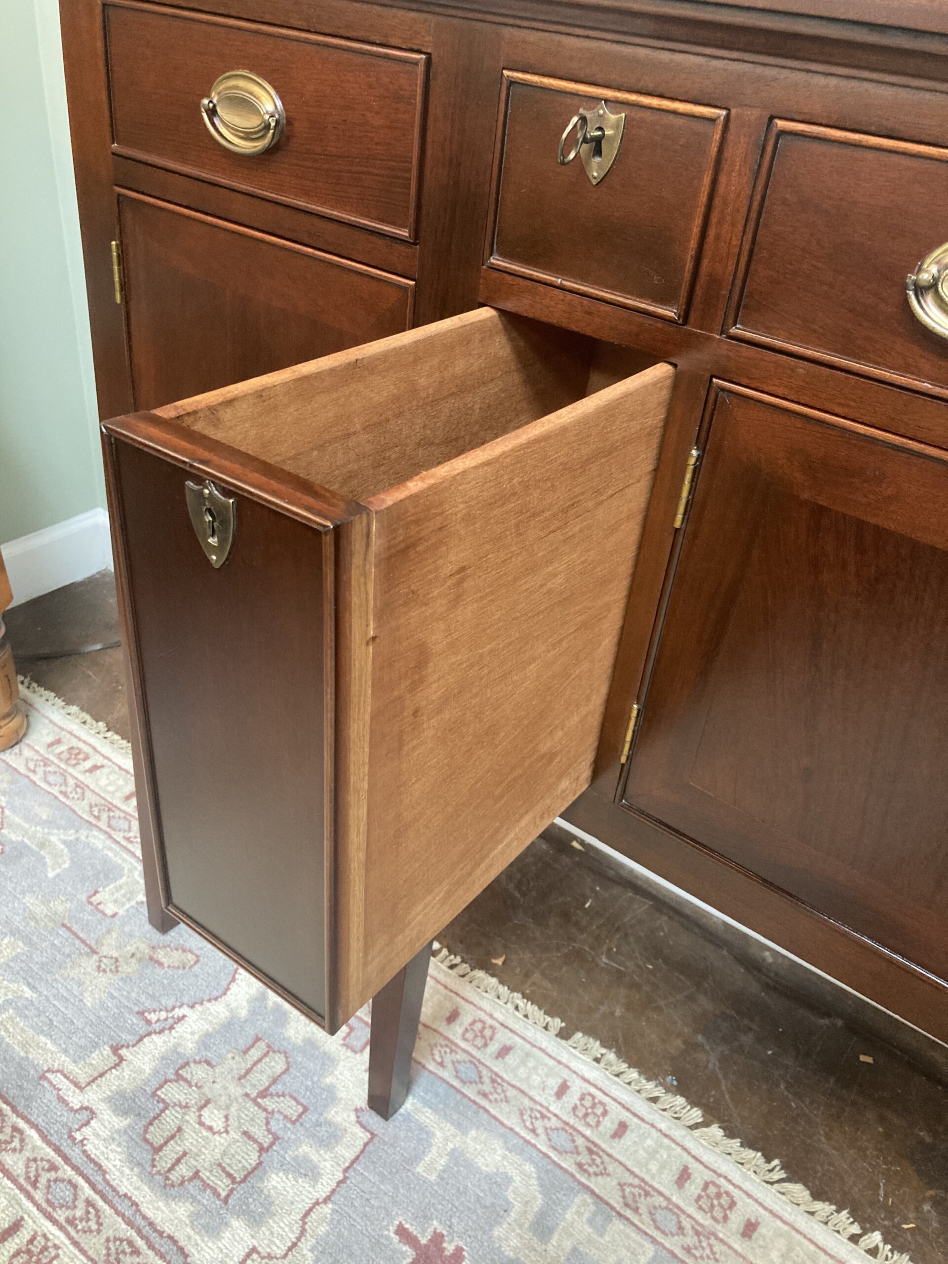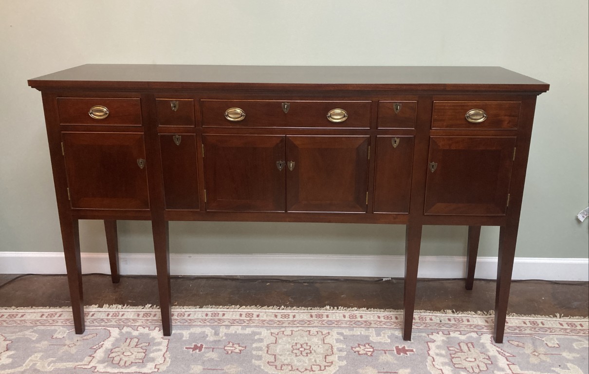 Made in Mebane, NC, this beautiful sideboard features 5 felt lined drawers of varying sizes across the top, with two very deep narrow lower drawers and 4 doors opening to cabinet storage. Brass hardware, banded drawer fronts, and straight tapered legs. Multiple keys that work for all drawers and doors that feature locks. This is a very handsome, stately piece with ample storage space.