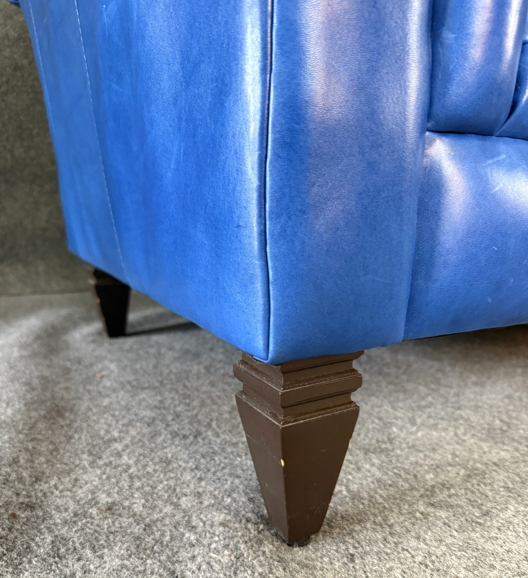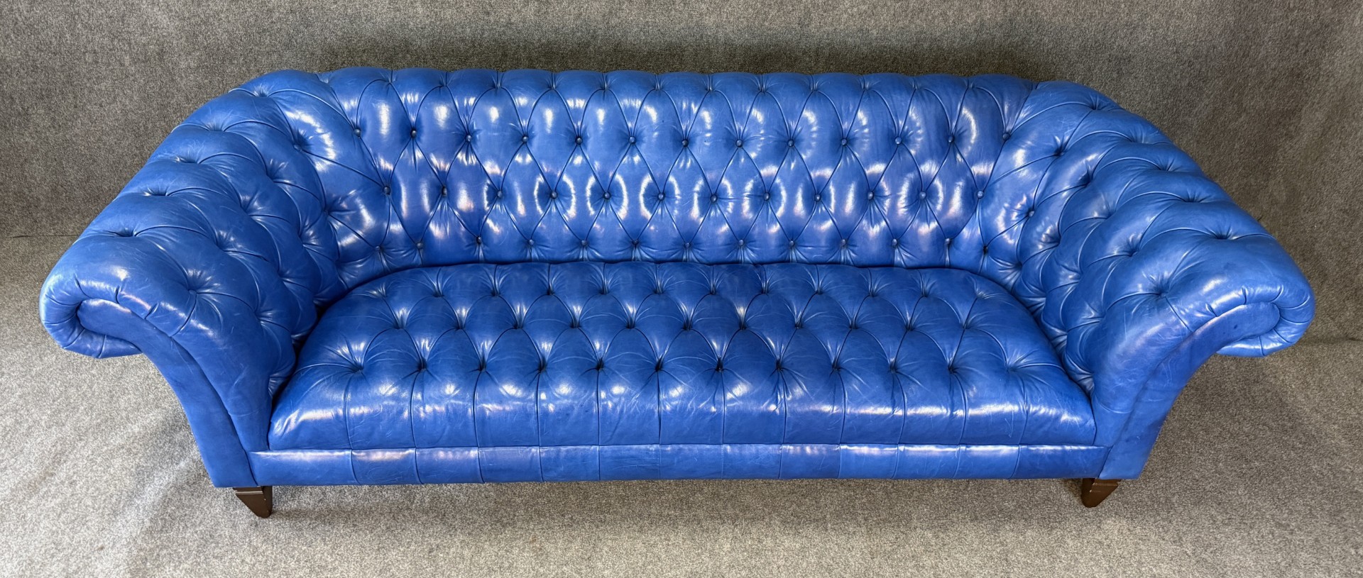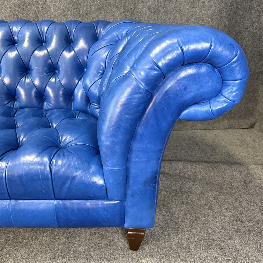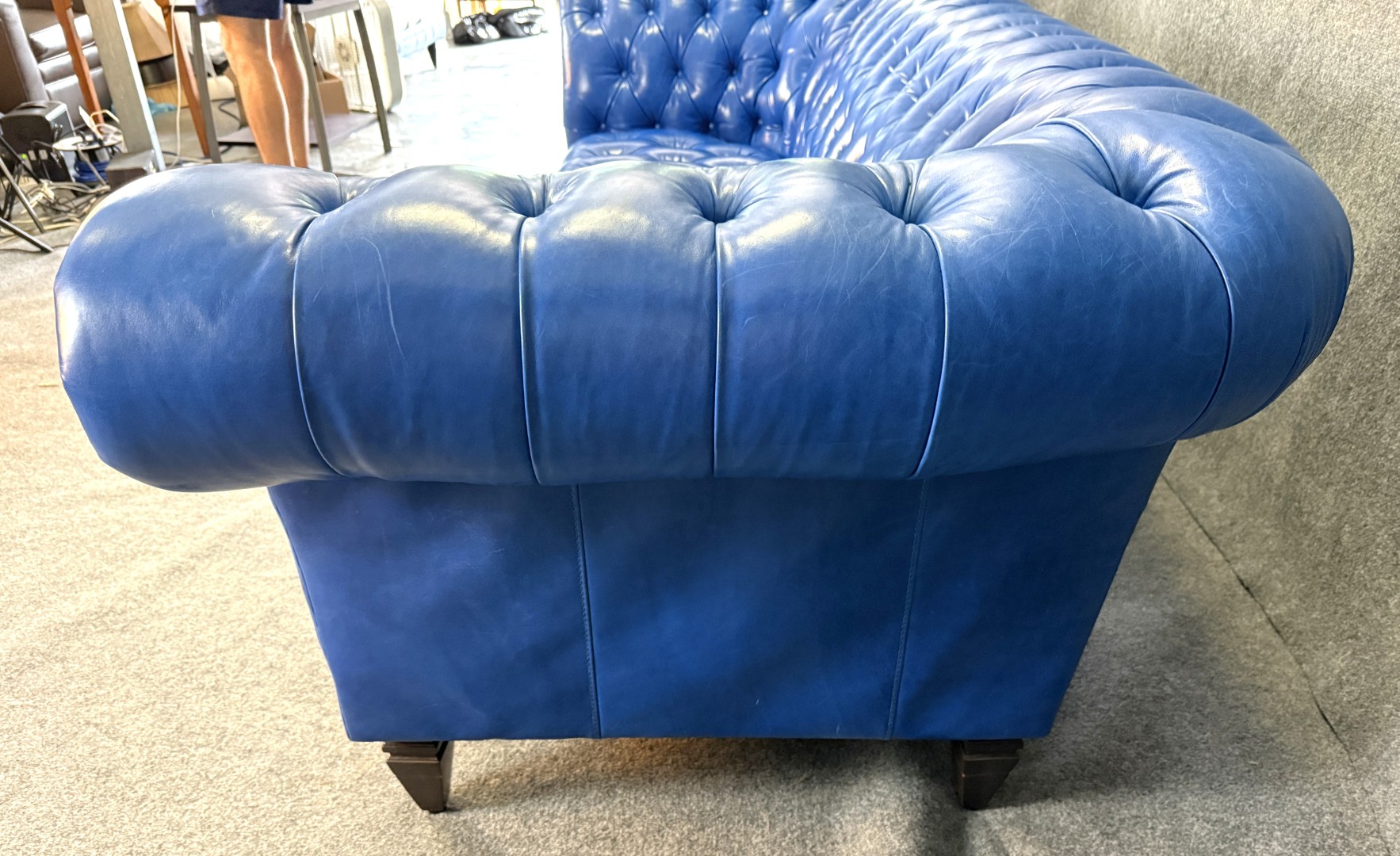 This Custom COCOCO Home blue Chesterfield sofa showcases deep diamond tufting, gracefully rolled arms, and a vibrant saturated leather that instantly commands attention. Its full-length silhouette and plush bench-style cushioning offer both luxurious presence and inviting everyday comfort. COCOCO Home is a respected North Carolina furniture maker known for handcrafted, customizable pieces built with premium materials and traditional bench-made construction.