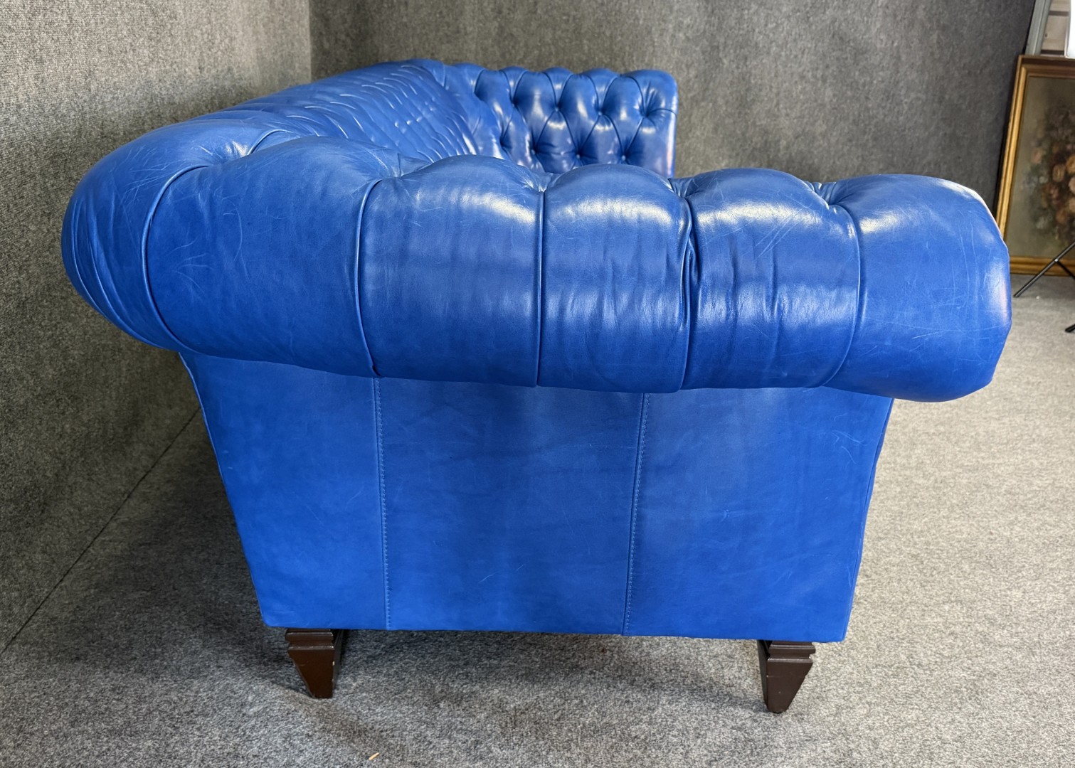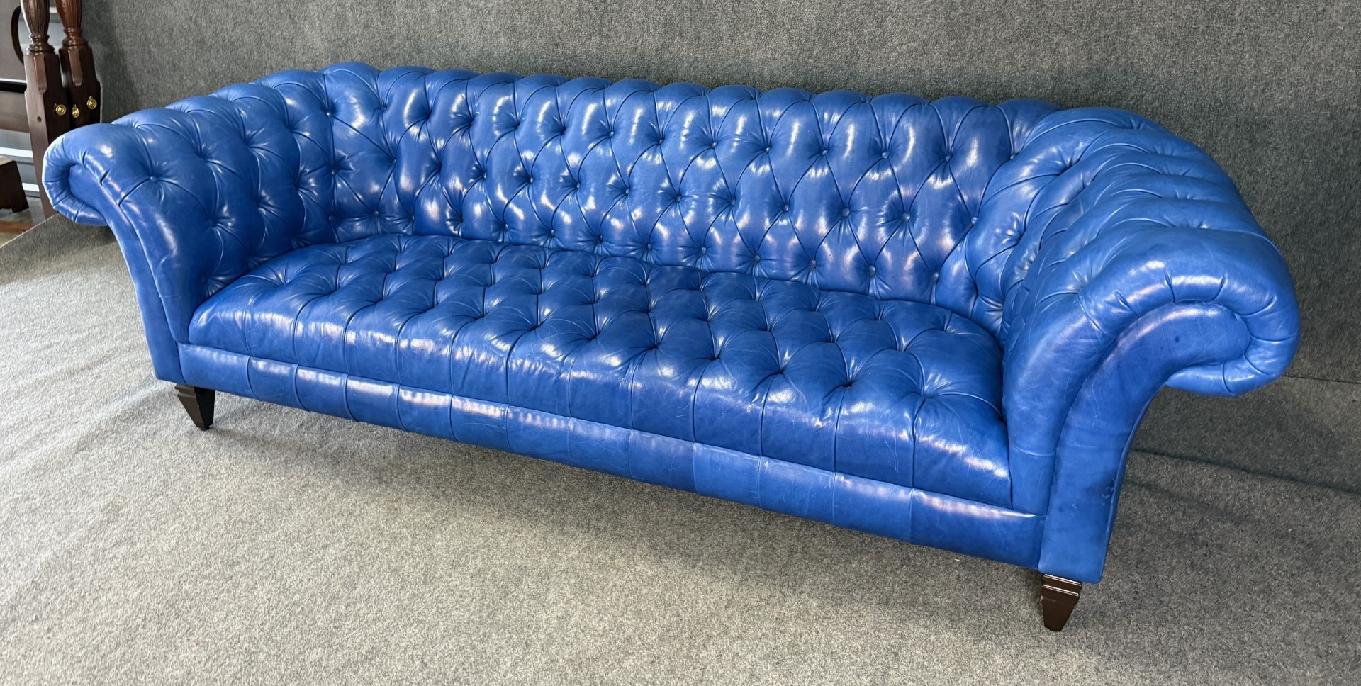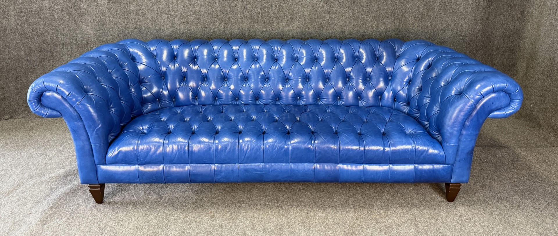 This Custom COCOCO Home blue Chesterfield sofa showcases deep diamond tufting, gracefully rolled arms, and a vibrant saturated leather that instantly commands attention. Its full-length silhouette and plush bench-style cushioning offer both luxurious presence and inviting everyday comfort. COCOCO Home is a respected North Carolina furniture maker known for handcrafted, customizable pieces built with premium materials and traditional bench-made construction.