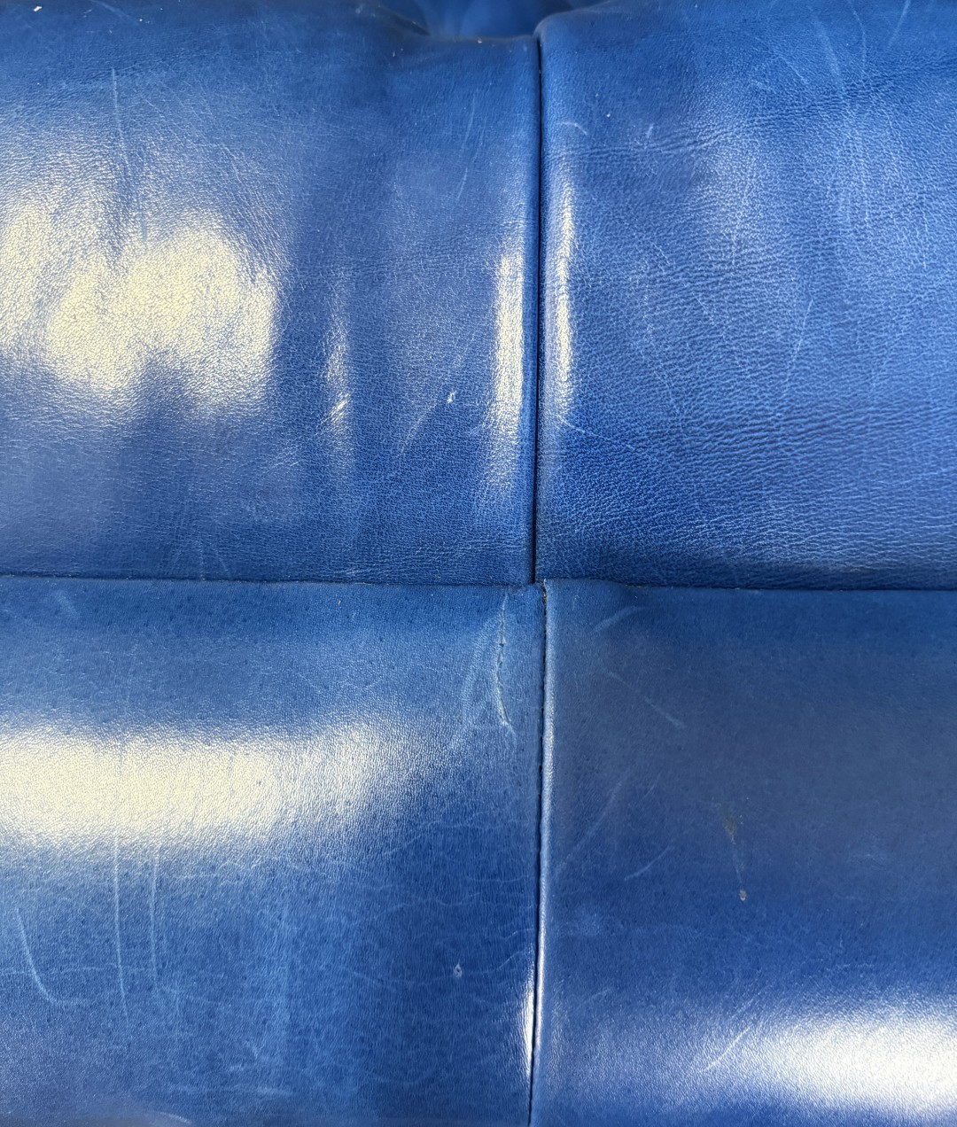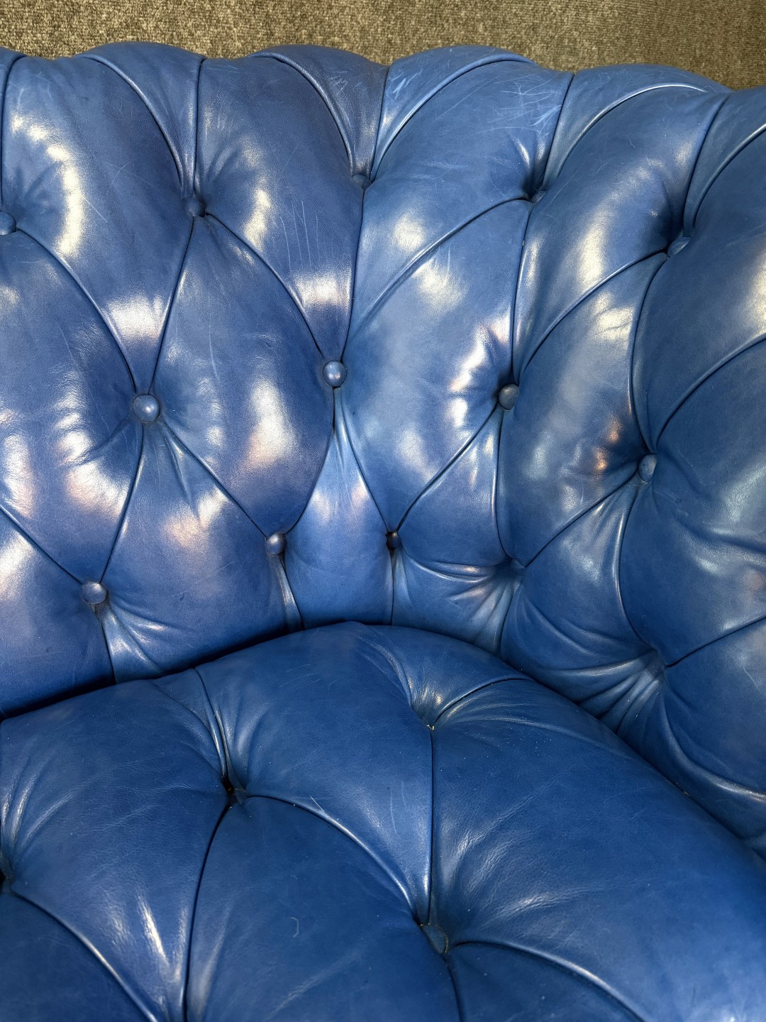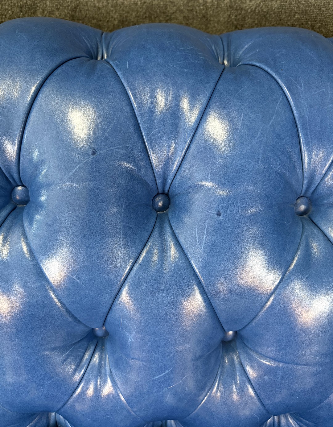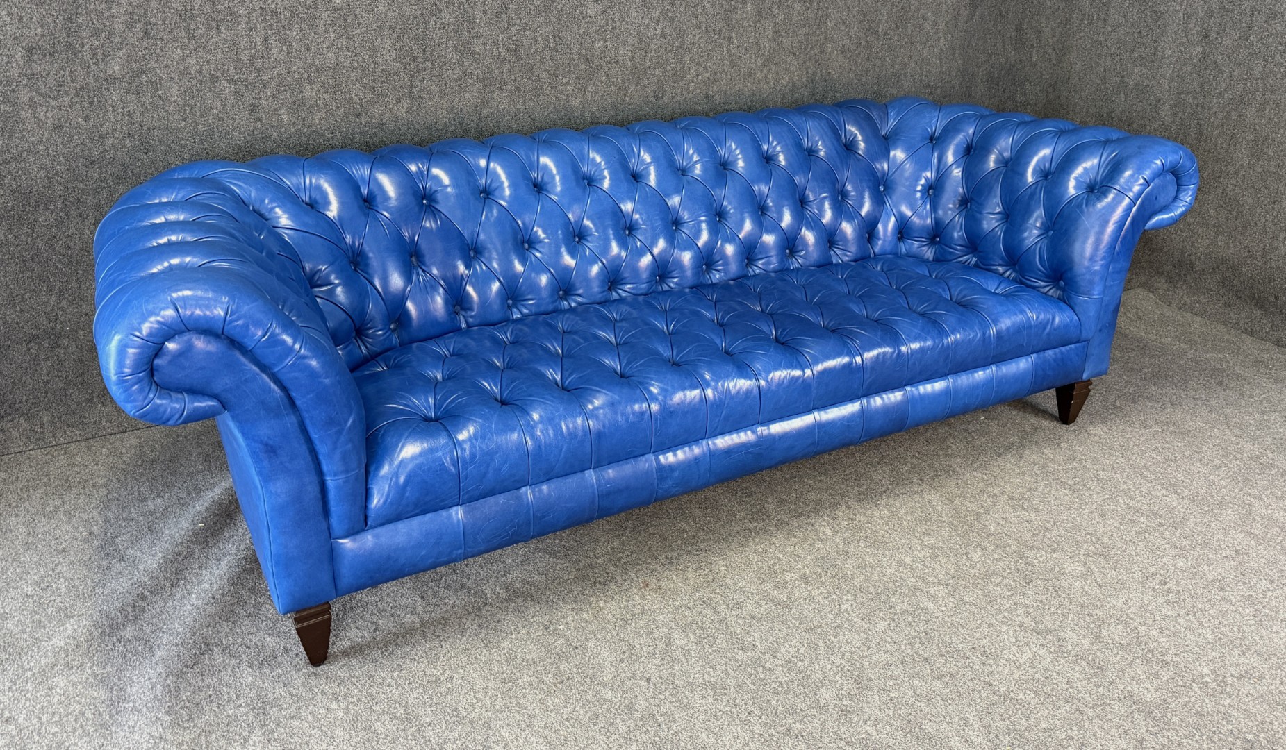 This Custom COCOCO Home blue Chesterfield sofa showcases deep diamond tufting, gracefully rolled arms, and a vibrant saturated leather that instantly commands attention. Its full-length silhouette and plush bench-style cushioning offer both luxurious presence and inviting everyday comfort. COCOCO Home is a respected North Carolina furniture maker known for handcrafted, customizable pieces built with premium materials and traditional bench-made construction.