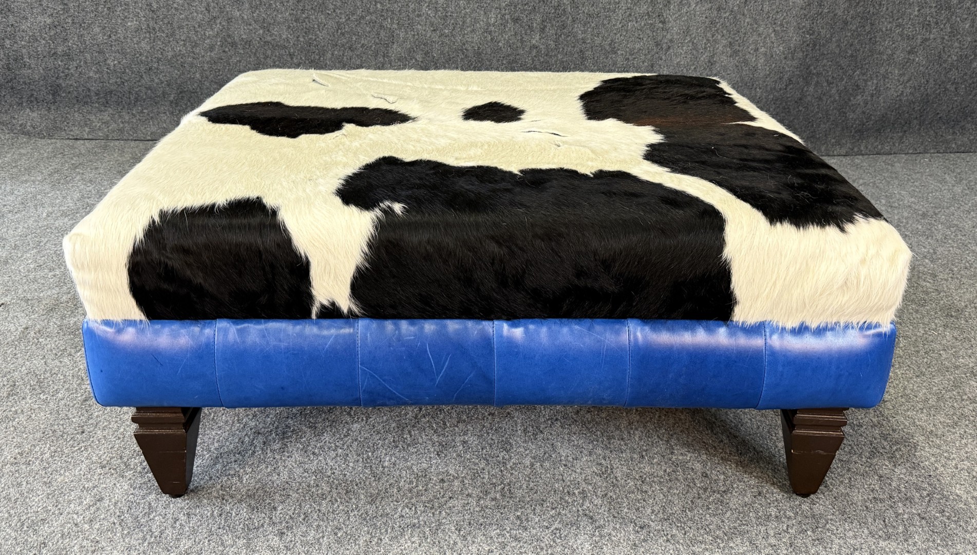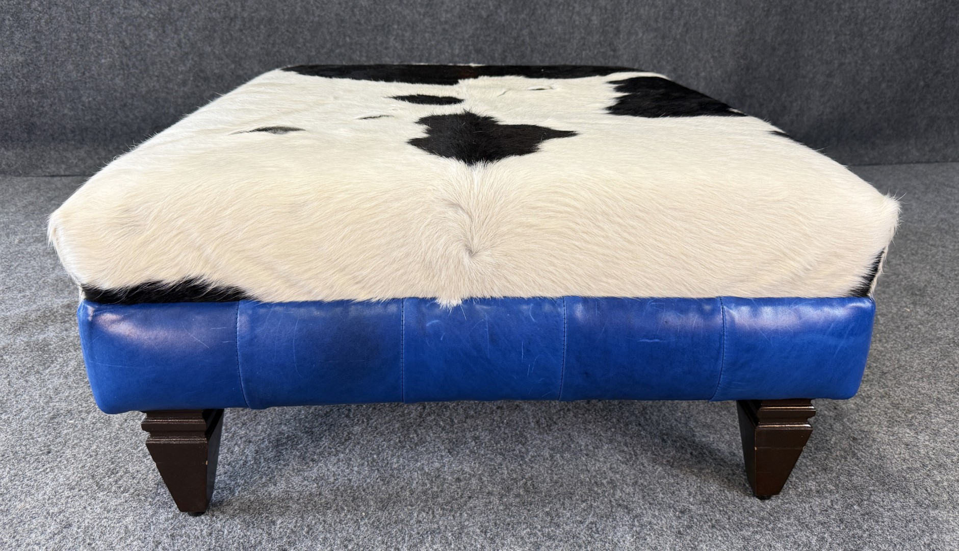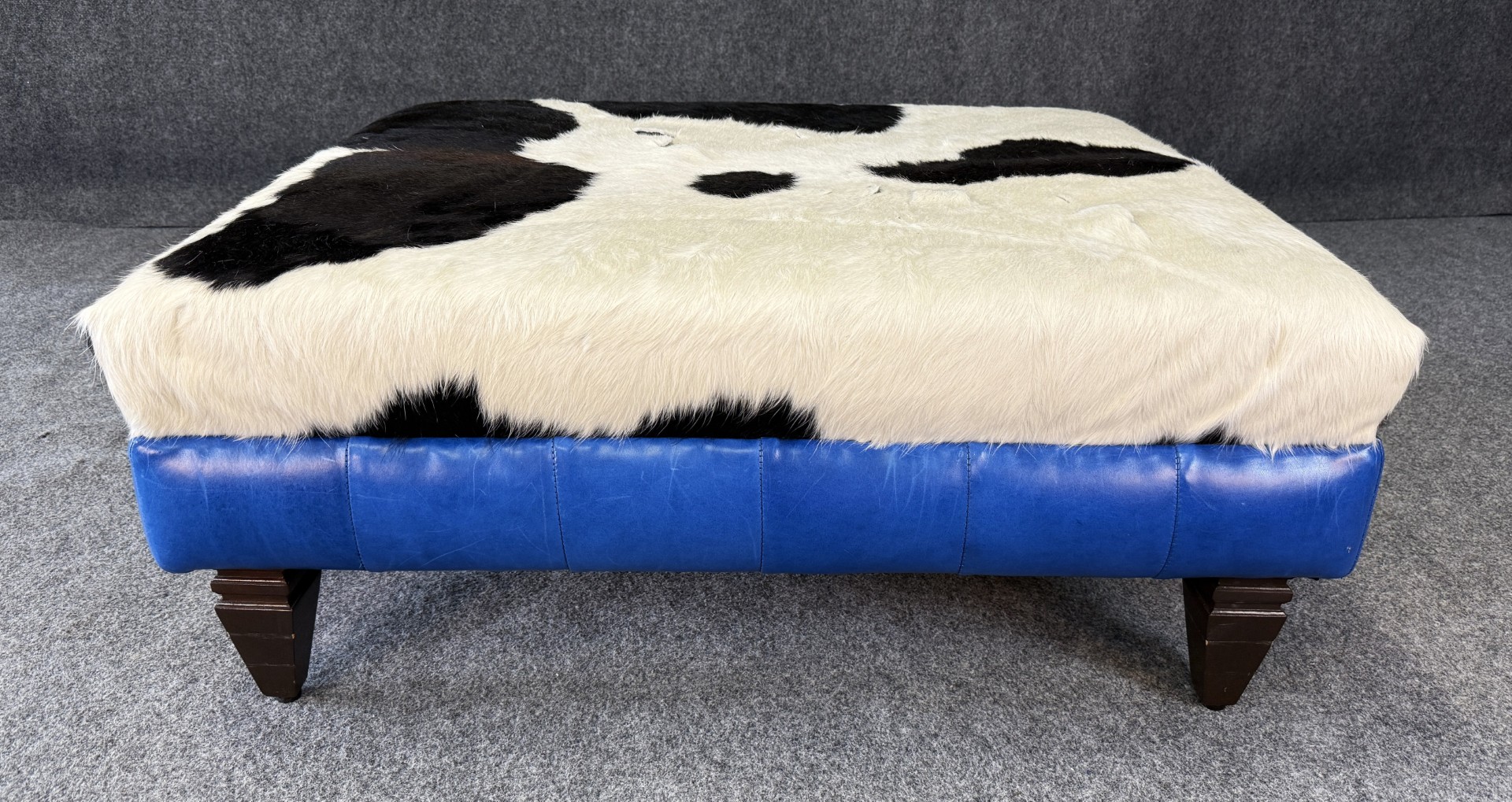 This Custom COCOCO Home Chesterfield ottoman features a bold black-and-white cowhide top paired with vibrant blue leather sides, creating a striking blend of rustic and modern design. Its generous scale and sturdy carved wooden legs make it an eye-catching statement piece perfect for living rooms, great rooms, or boutique commercial spaces. COCOCO Home is a highly regarded North Carolina maker known for handcrafted, customizable furniture built with premium materials and timeless construction.