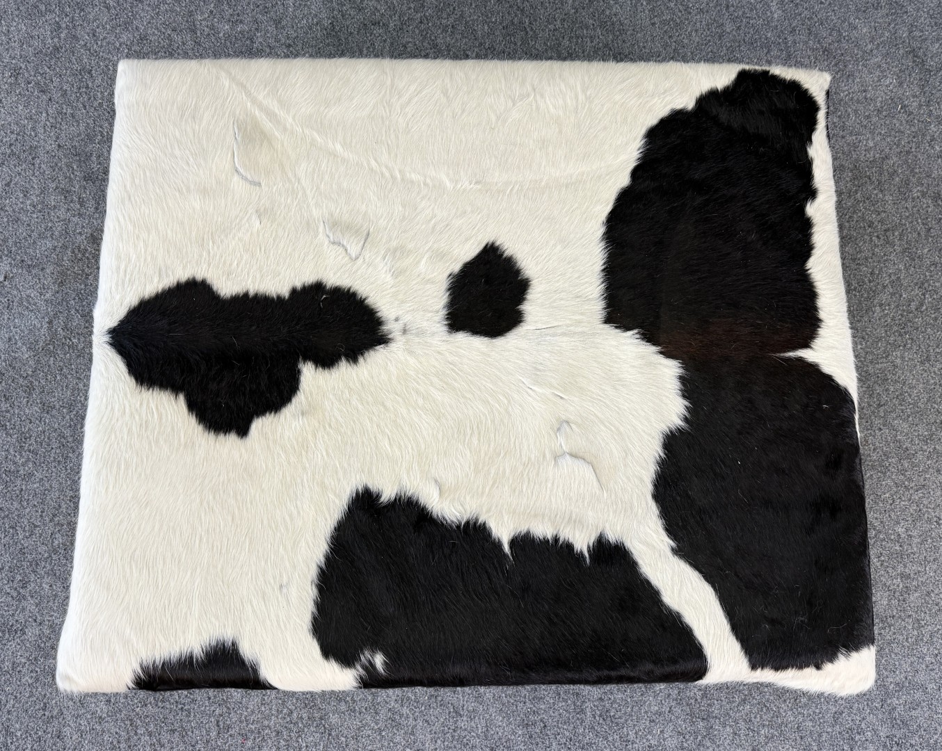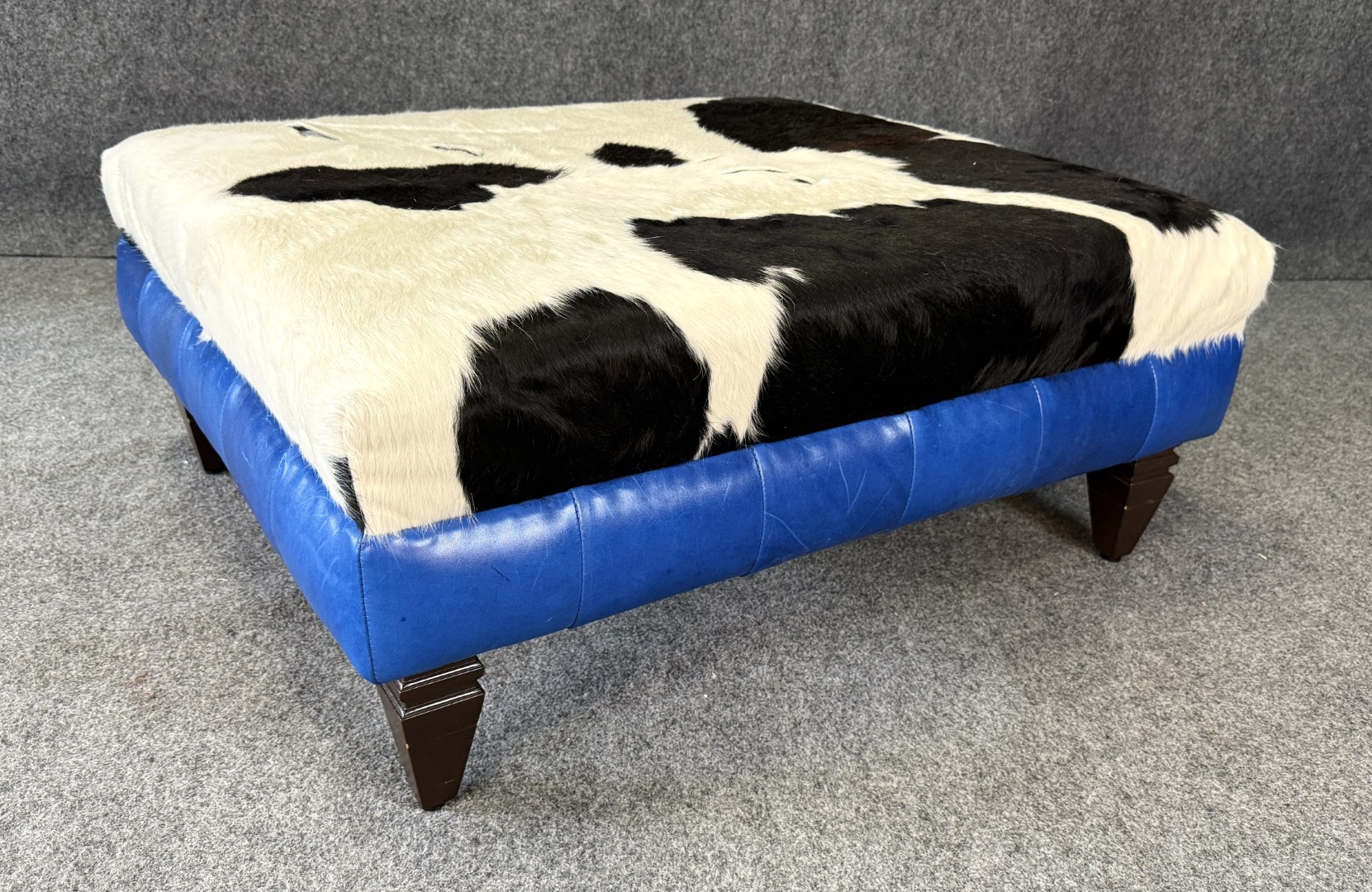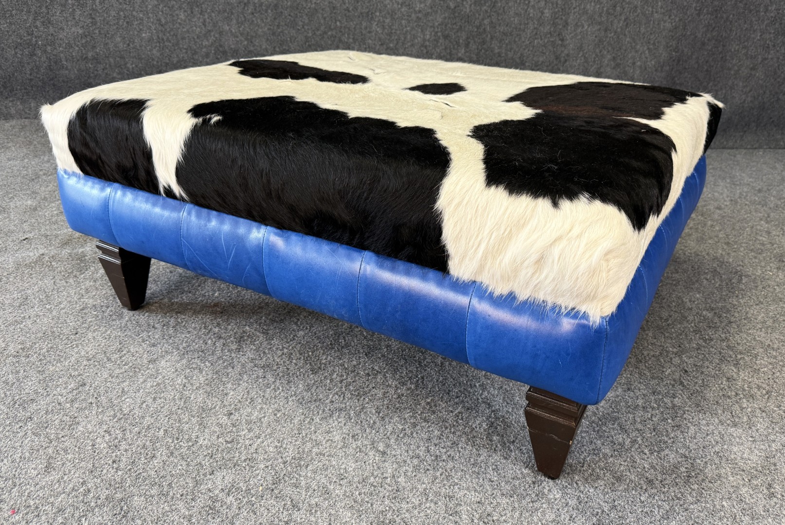 This Custom COCOCO Home Chesterfield ottoman features a bold black-and-white cowhide top paired with vibrant blue leather sides, creating a striking blend of rustic and modern design. Its generous scale and sturdy carved wooden legs make it an eye-catching statement piece perfect for living rooms, great rooms, or boutique commercial spaces. COCOCO Home is a highly regarded North Carolina maker known for handcrafted, customizable furniture built with premium materials and timeless construction.