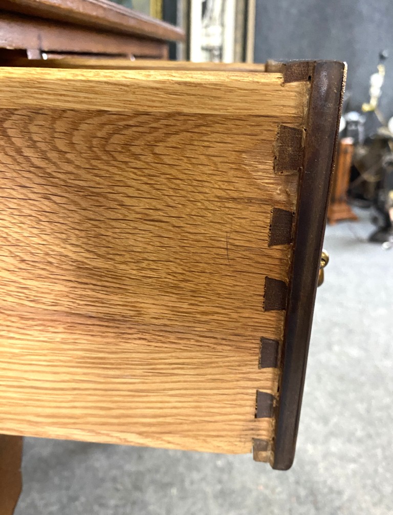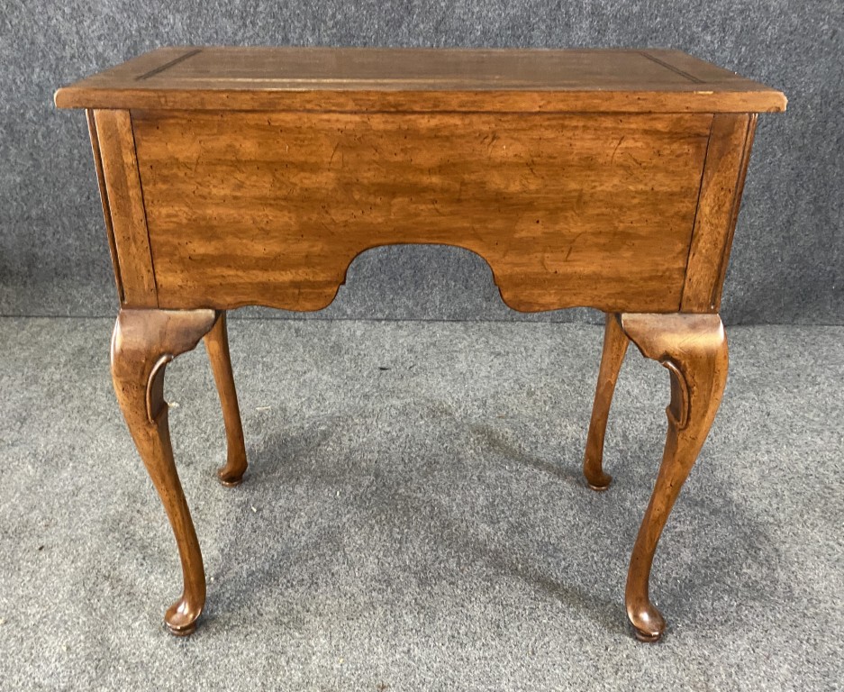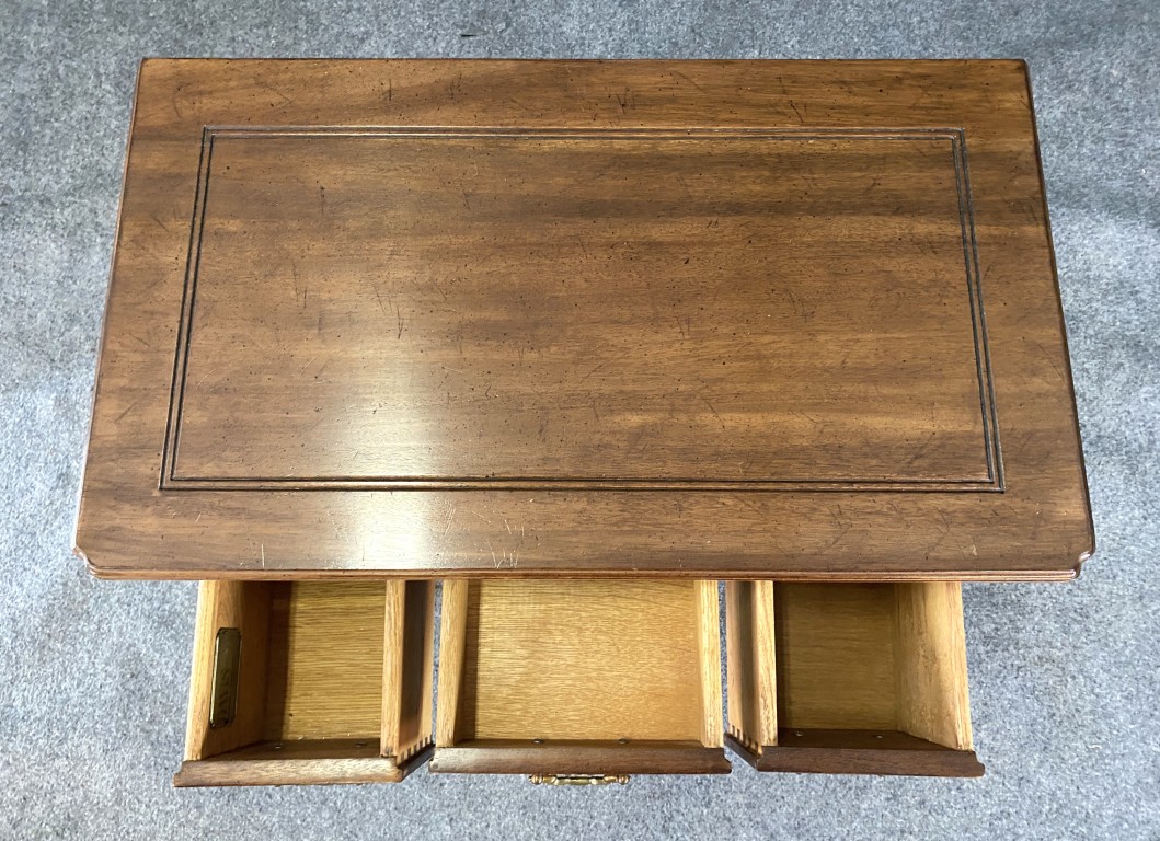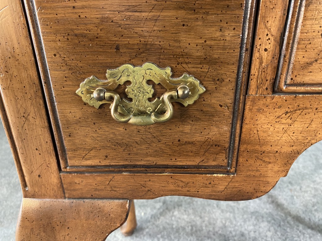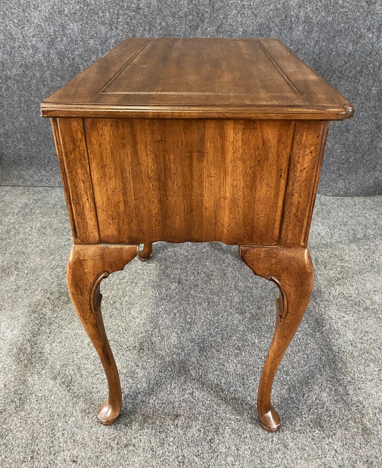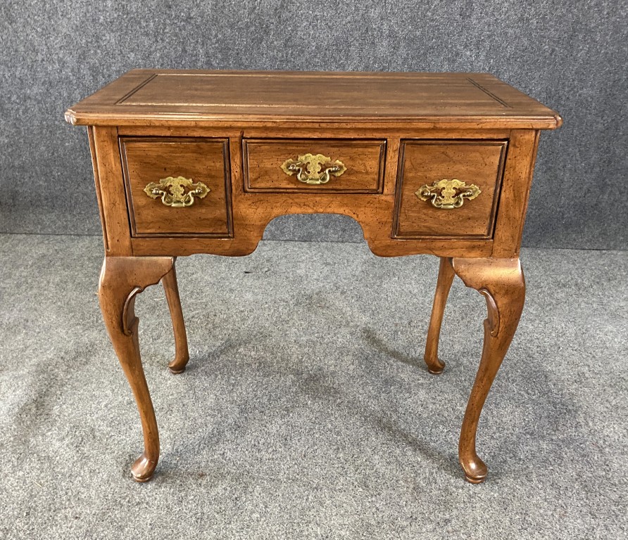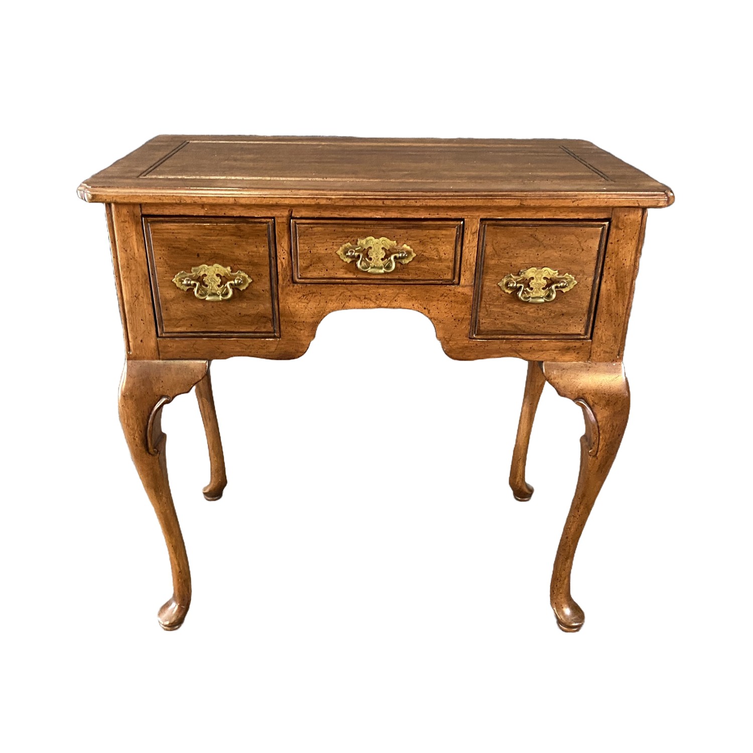 This Davis Cabinet Company solid mahogany console table is a beautifully crafted vintage piece with classic Queen Anne styling and an elegant, compact silhouette. The warm mahogany finish showcases rich natural grain, while the cabriole legs and subtle carved knees add a graceful traditional touch. Three drawers across the front provide convenient storage, accented by ornate brass Chippendale-style hardware for a refined antique look. The top features a framed panel detail, giving it a tailored, furniture-quality presence from every angle. Perfect for an entryway, hallway, or behind a sofa, this table blends timeless Southern craftsmanship with everyday functionality.