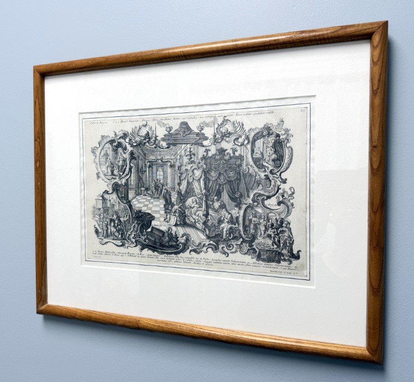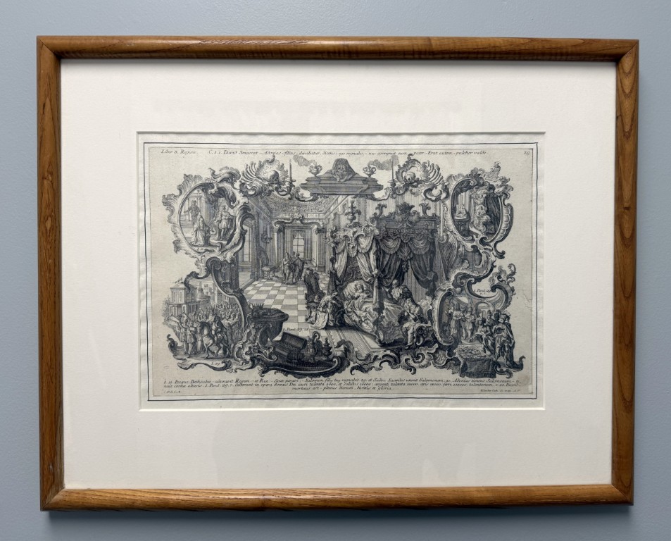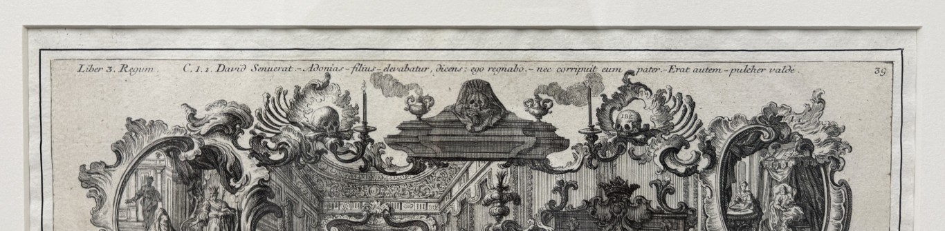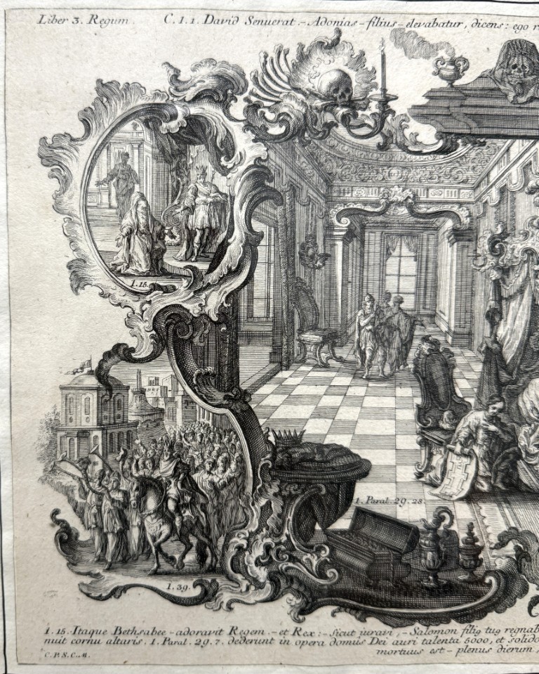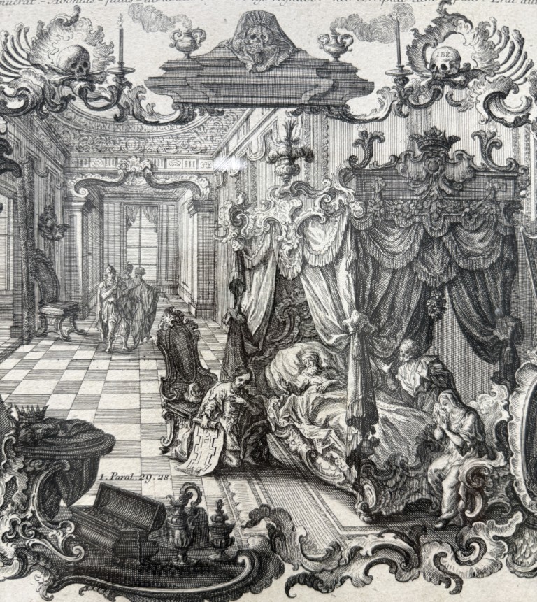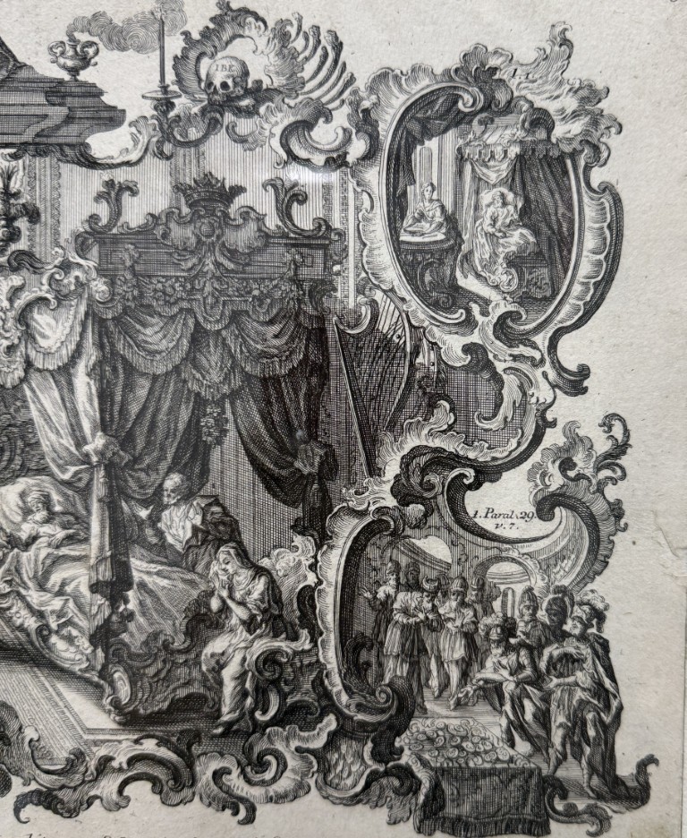 This early 19th-century engraving attributed to Sebastian Klauber depicts The Death of Elisha within a richly detailed Baroque interior, framed by ornate cartouches illustrating additional scenes from the Fourth Book of Kings and executed with the intricate linework and architectural depth characteristic of the Augsburg printmaking tradition. Rooted in the long history of memento mori imagery, such biblical death engravings evolved in 17th–18th century Augsburg into elaborate allegorical compositions that used Baroque symbolism to inspire reflection on mortality, faith, and salvation.