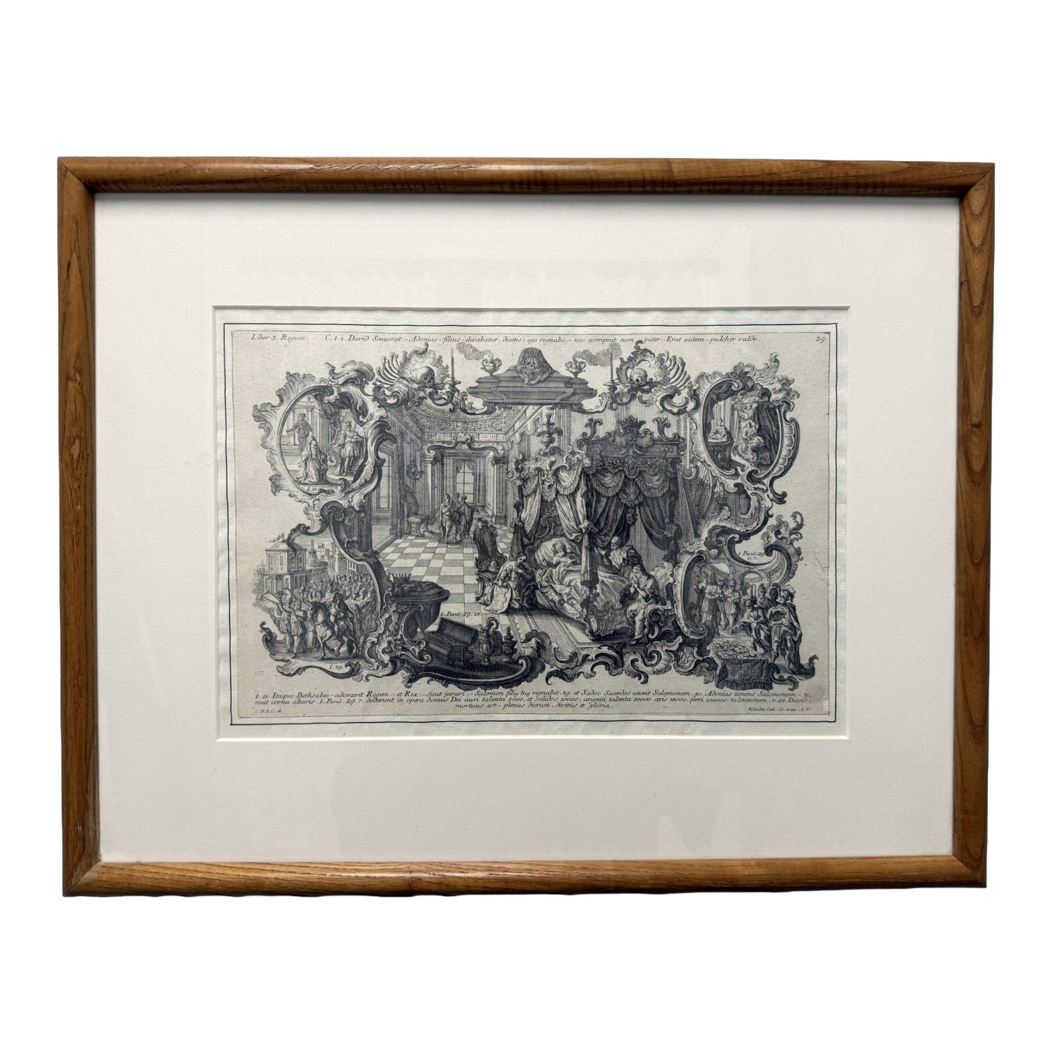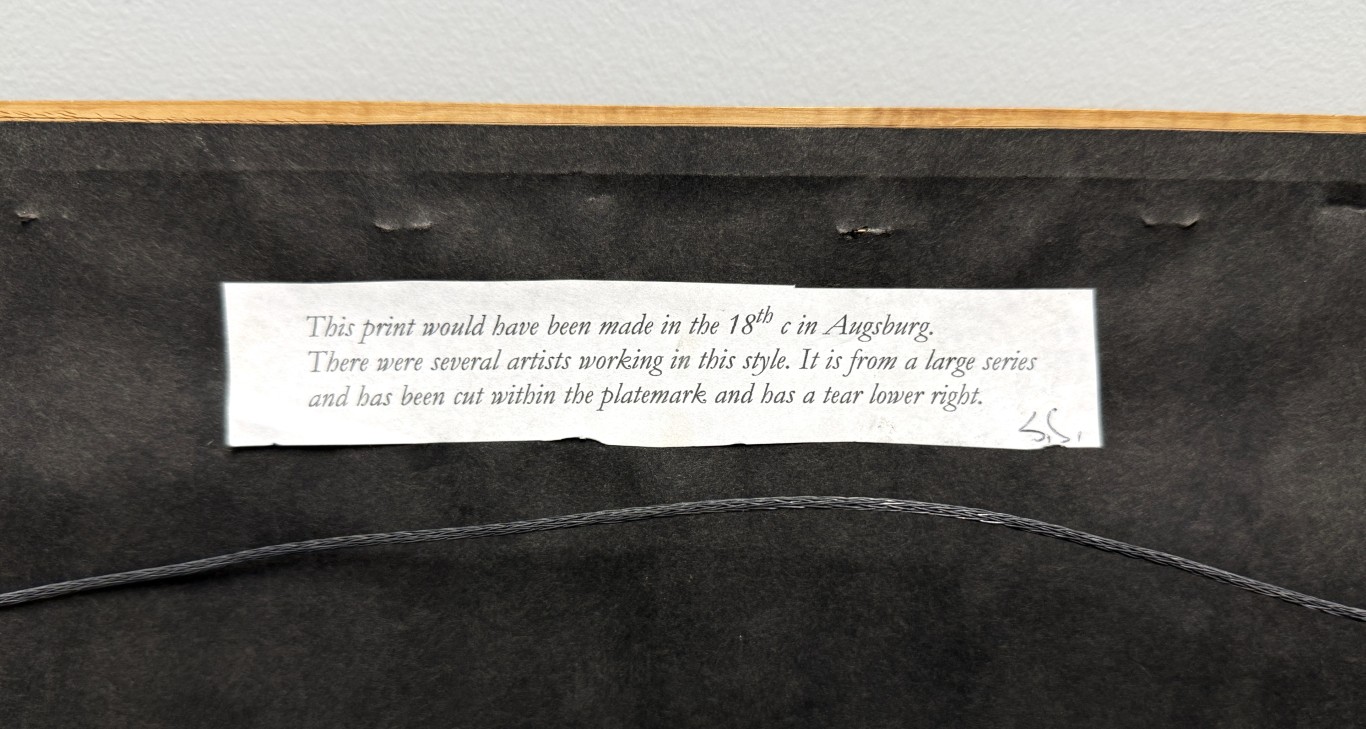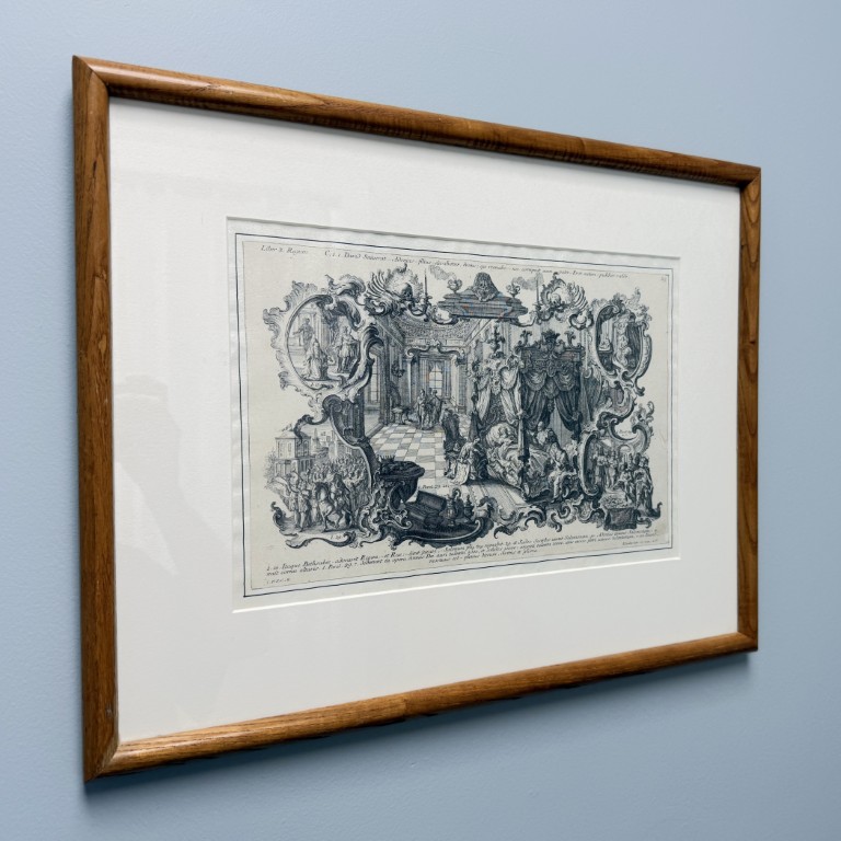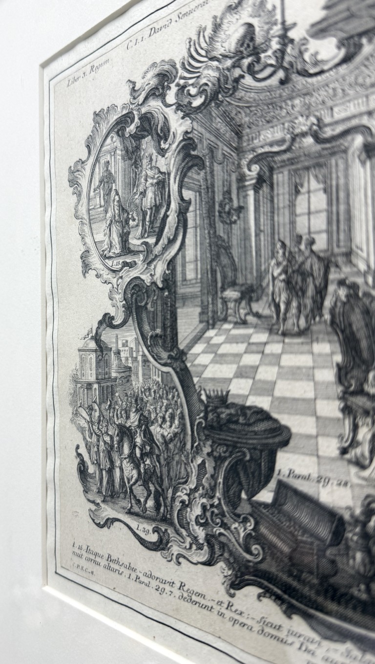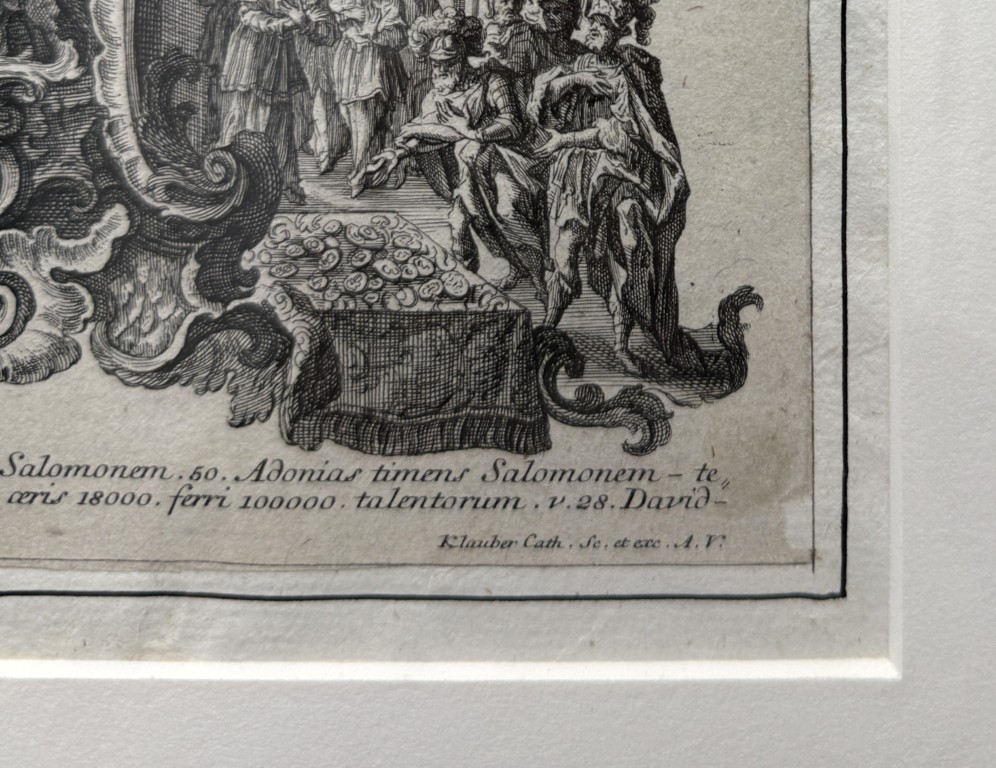 This early 19th-century engraving attributed to Sebastian Klauber depicts The Death of Elisha within a richly detailed Baroque interior, framed by ornate cartouches illustrating additional scenes from the Fourth Book of Kings and executed with the intricate linework and architectural depth characteristic of the Augsburg printmaking tradition. Rooted in the long history of memento mori imagery, such biblical death engravings evolved in 17th–18th century Augsburg into elaborate allegorical compositions that used Baroque symbolism to inspire reflection on mortality, faith, and salvation.