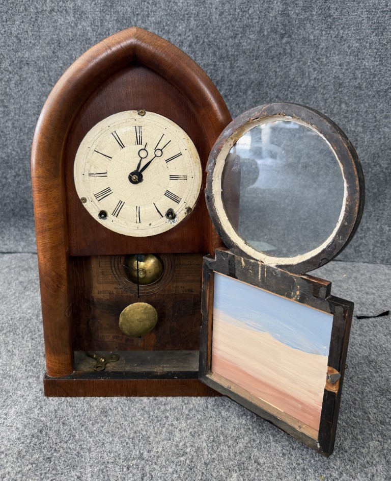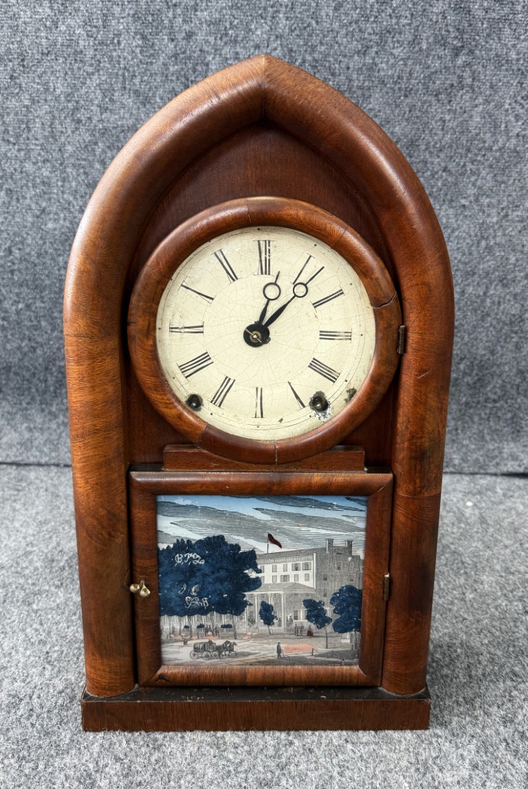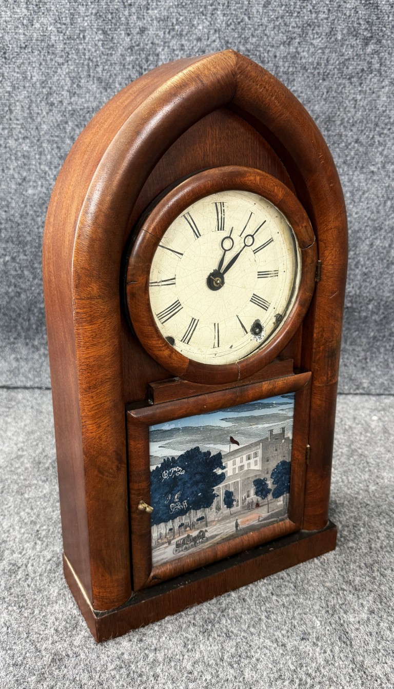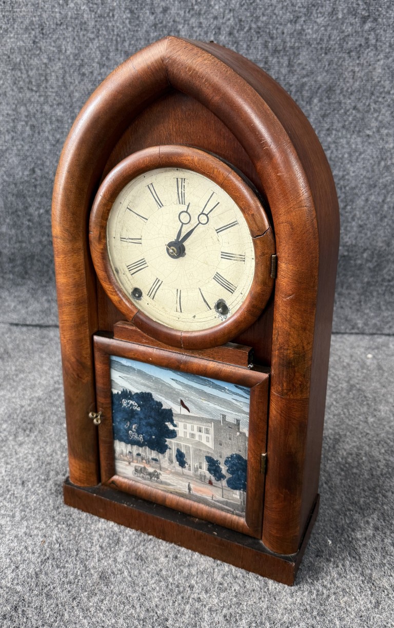 This mid-19th-century American “Beehive” or Gothic mantel clock dates to circa 1850–1870 and was likely made in the New Haven, Connecticut area by a firm such as Chauncey Jerome, New Haven Clock Co., or the American Clock Co. (NY). The clock features a spring-driven movement with bell strike, a mahogany or rosewood veneered case with a pointed Gothic arch, a papered Roman numeral dial, brass pendulum, and a reverse-painted lower tablet depicting a 19th-century building scene.
