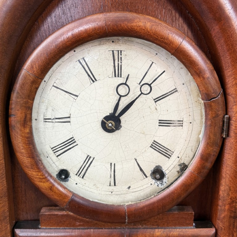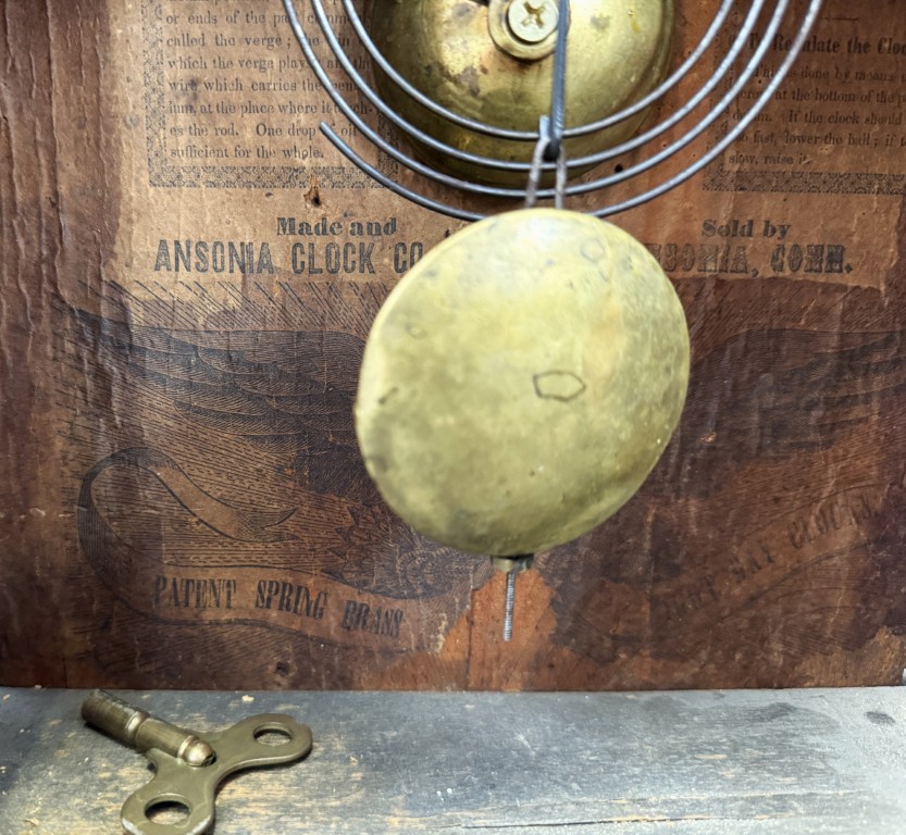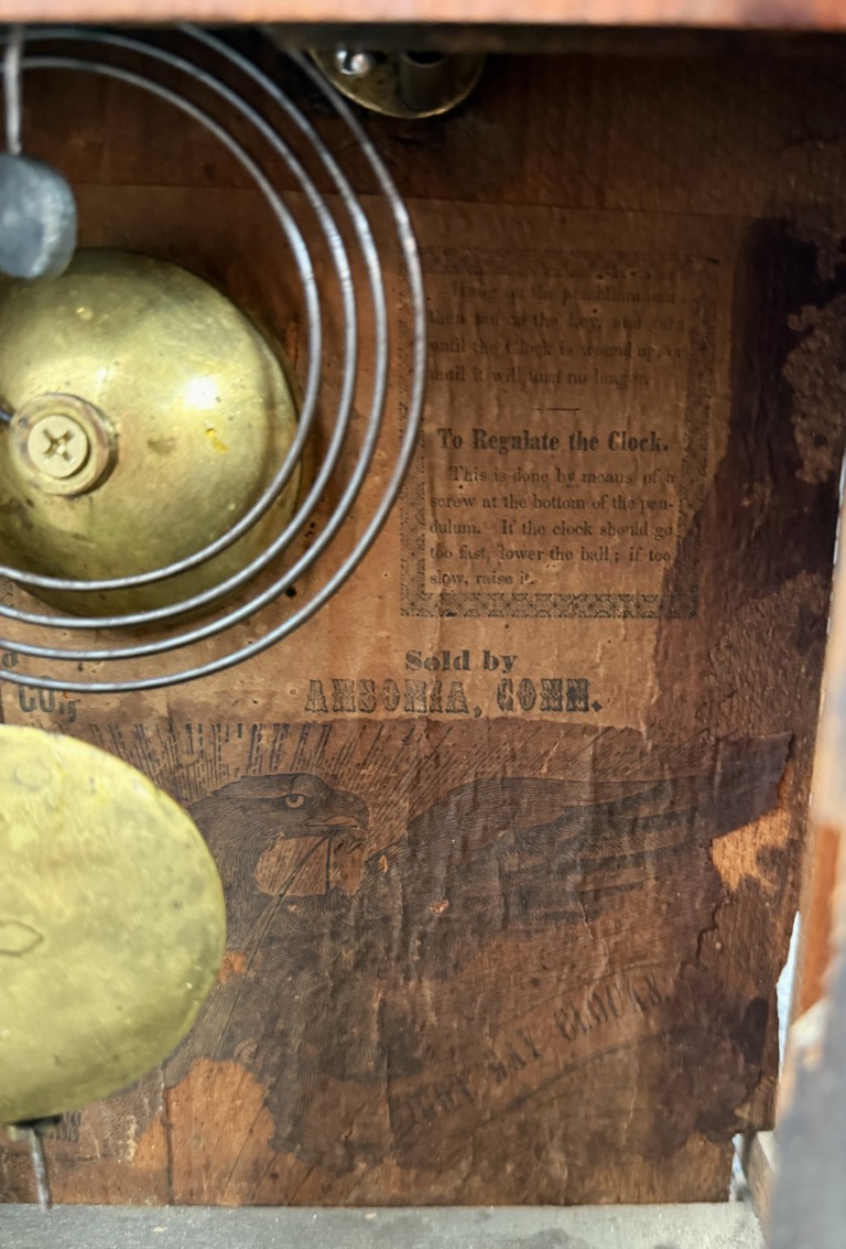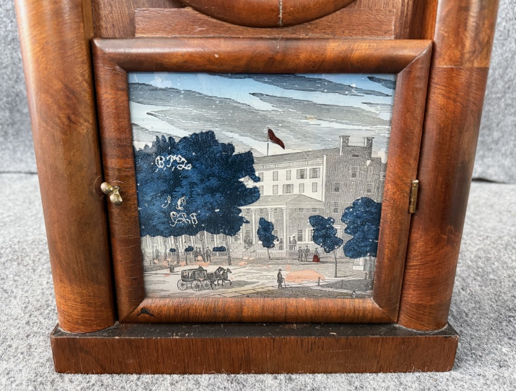 Your happiness with this item is of the utmost importance to us so please review the photographs carefully for condition. We endeavor to try and list any issues we may observe; we may not necessarily note all minor nicks and dings or we may simply miss something. Please inspect carefully to ensure your full happiness with this item. For this particular piece we found minor wear consistent with age and prior use. It retains its original interior paper label fragments, bell, and pendulum, with period lower glass showing signs of age and potential touchups to the painted background. Overall, this example presents as an honest and well-preserved survivor with attractive patina and dial crazing consistent with its age.