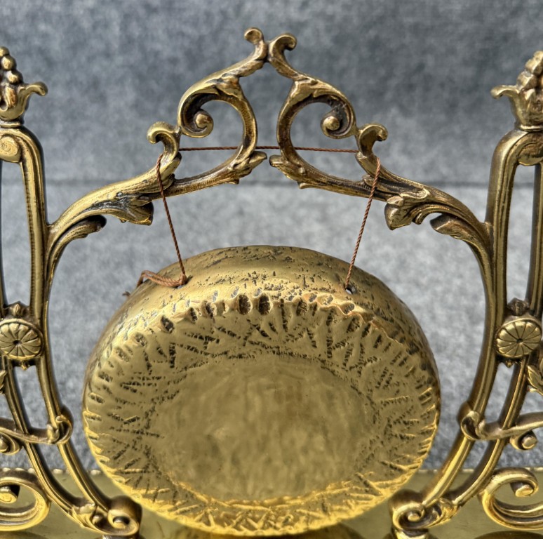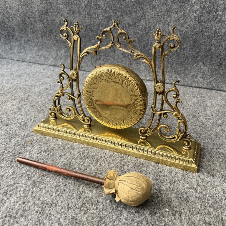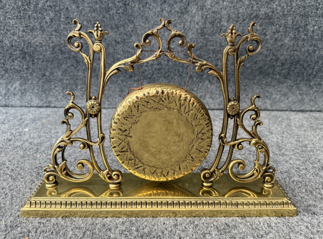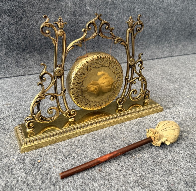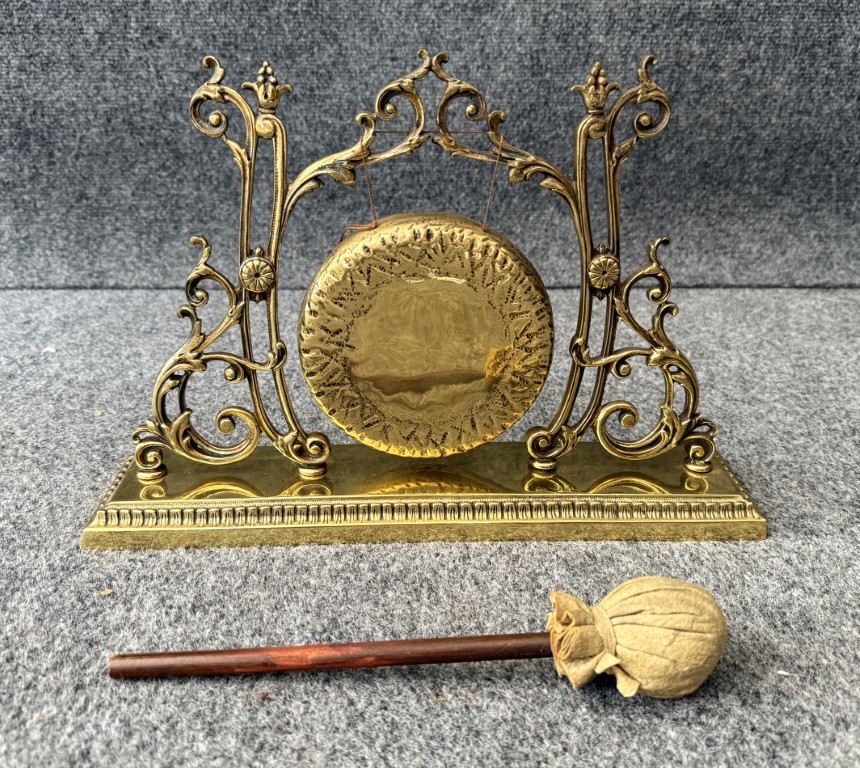 This early 1900s brass gong features an ornate pierced brass stand with scrolling foliate details and a finely hammered gong plate at its center. It comes complete with its original wood-handled mallet, making it both a decorative and functional piece.
