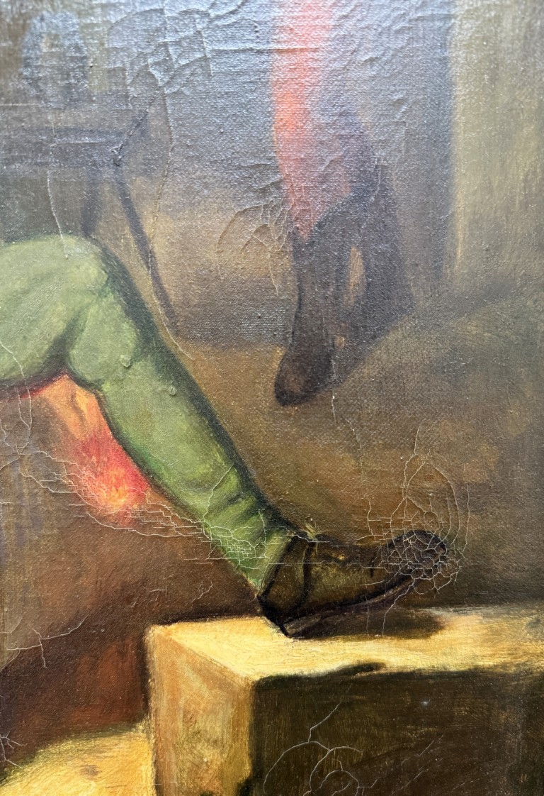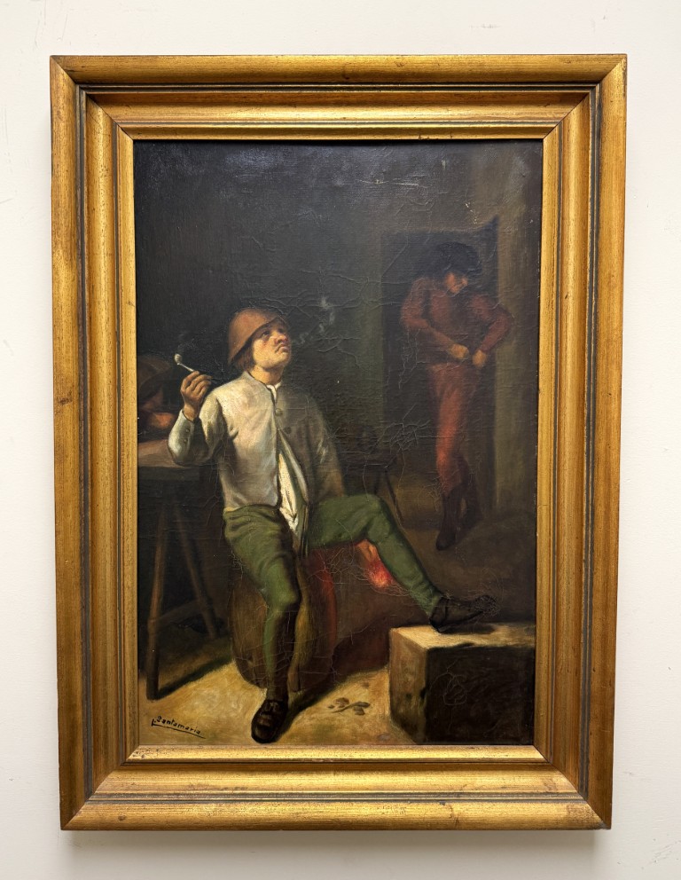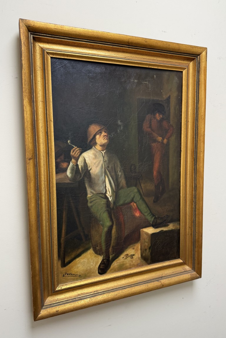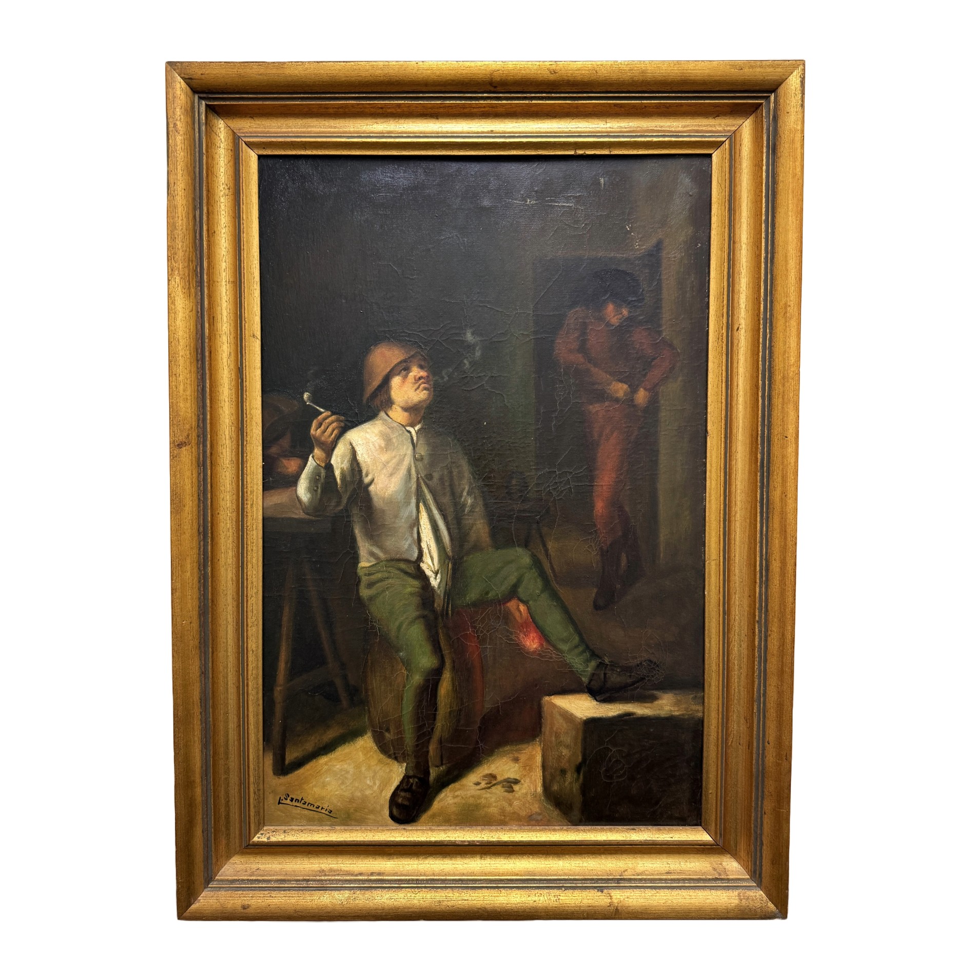 This early 1900’s oil on canvas titled “The Smoker,” signed Santamaria, is a reproduction of Adriaen Brouwer’s masterpiece originally painted between 1635 and 1640. It portrays a rustic interior scene with a young man leisurely smoking a pipe while another figure lingers in the background. Rich tones, naturalistic features, and visible age crackling in the paint surface give this work an authentic antique character.