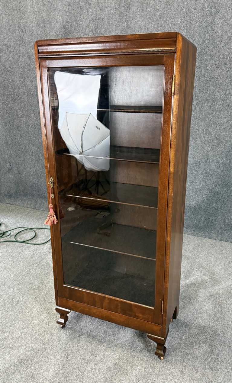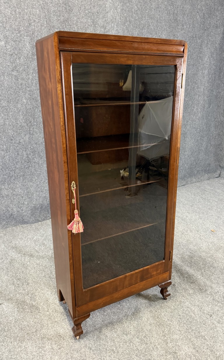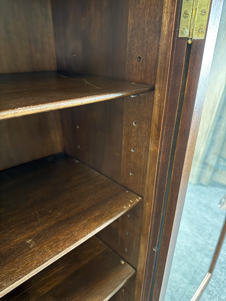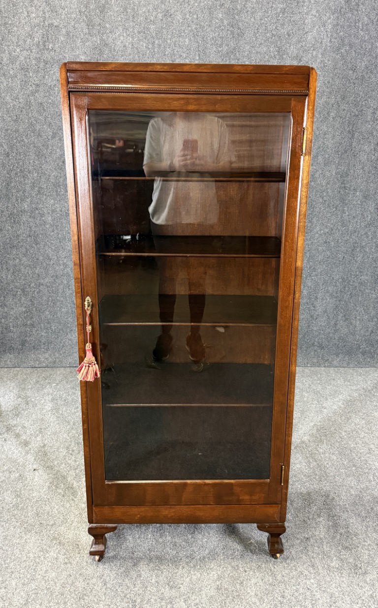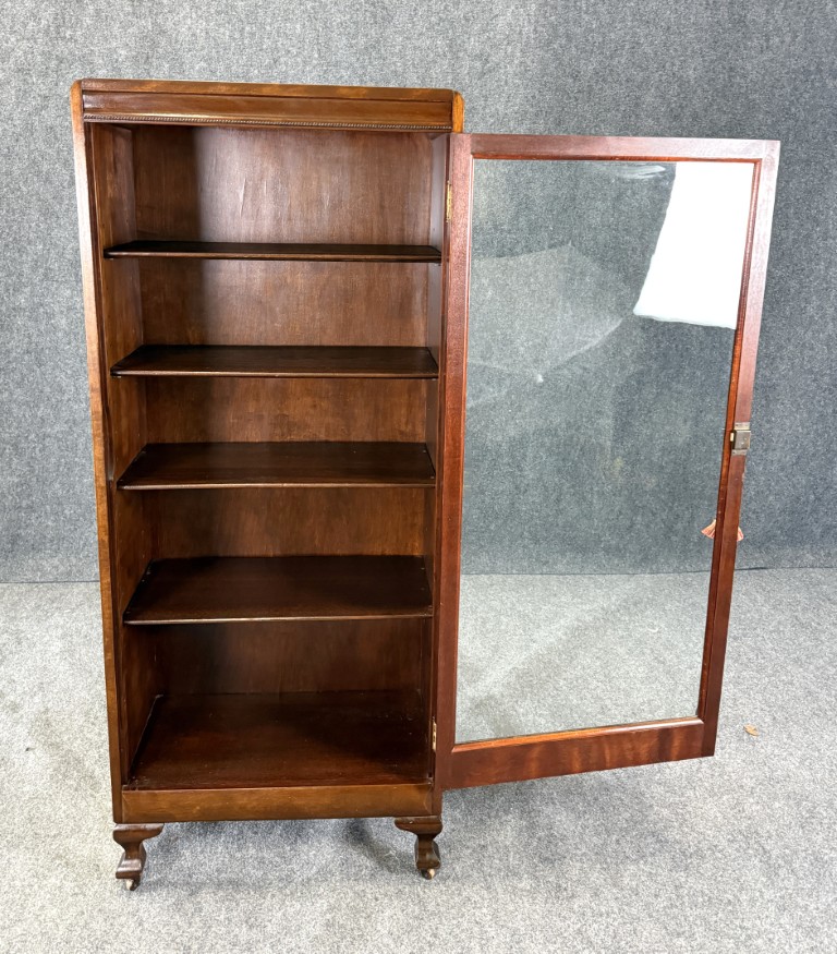This early 1900s bookcase is crafted from solid mahogany and features a tall glass-paneled door that beautifully showcases the warm character of the wood. Inside, multiple spacious shelves provide ample storage for books or collectibles, while the classic proportions and elegant simplicity reflect the refined craftsmanship of the period.