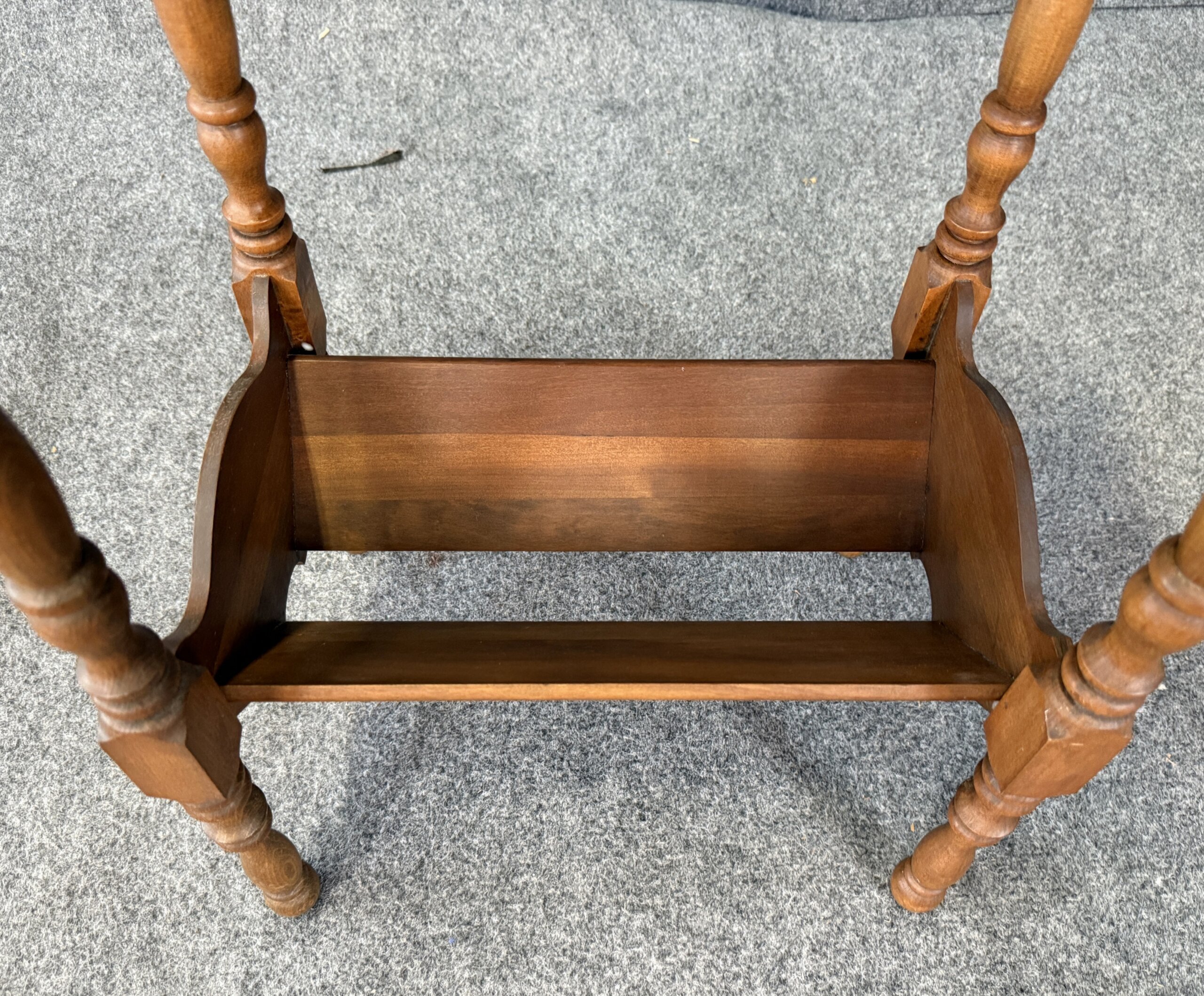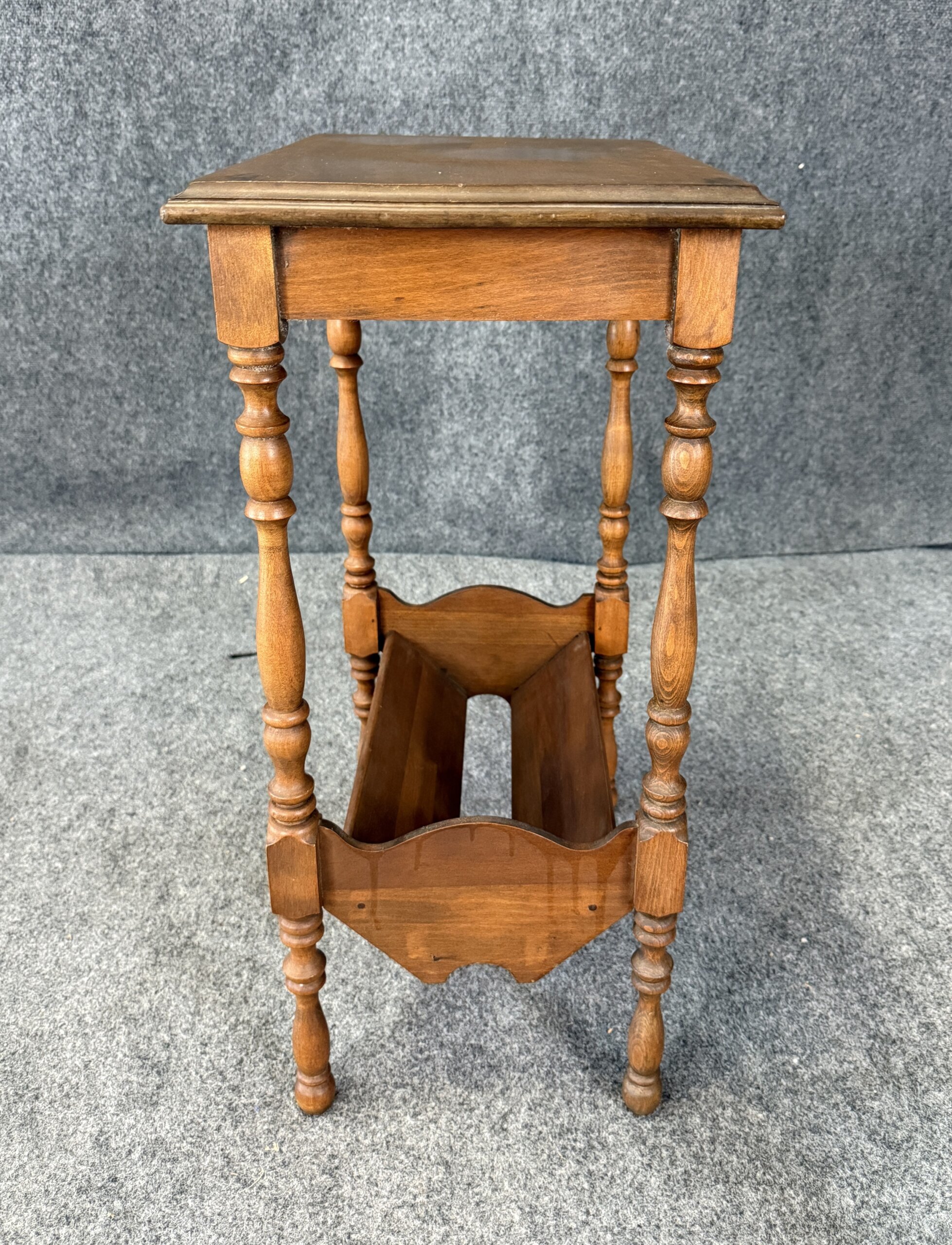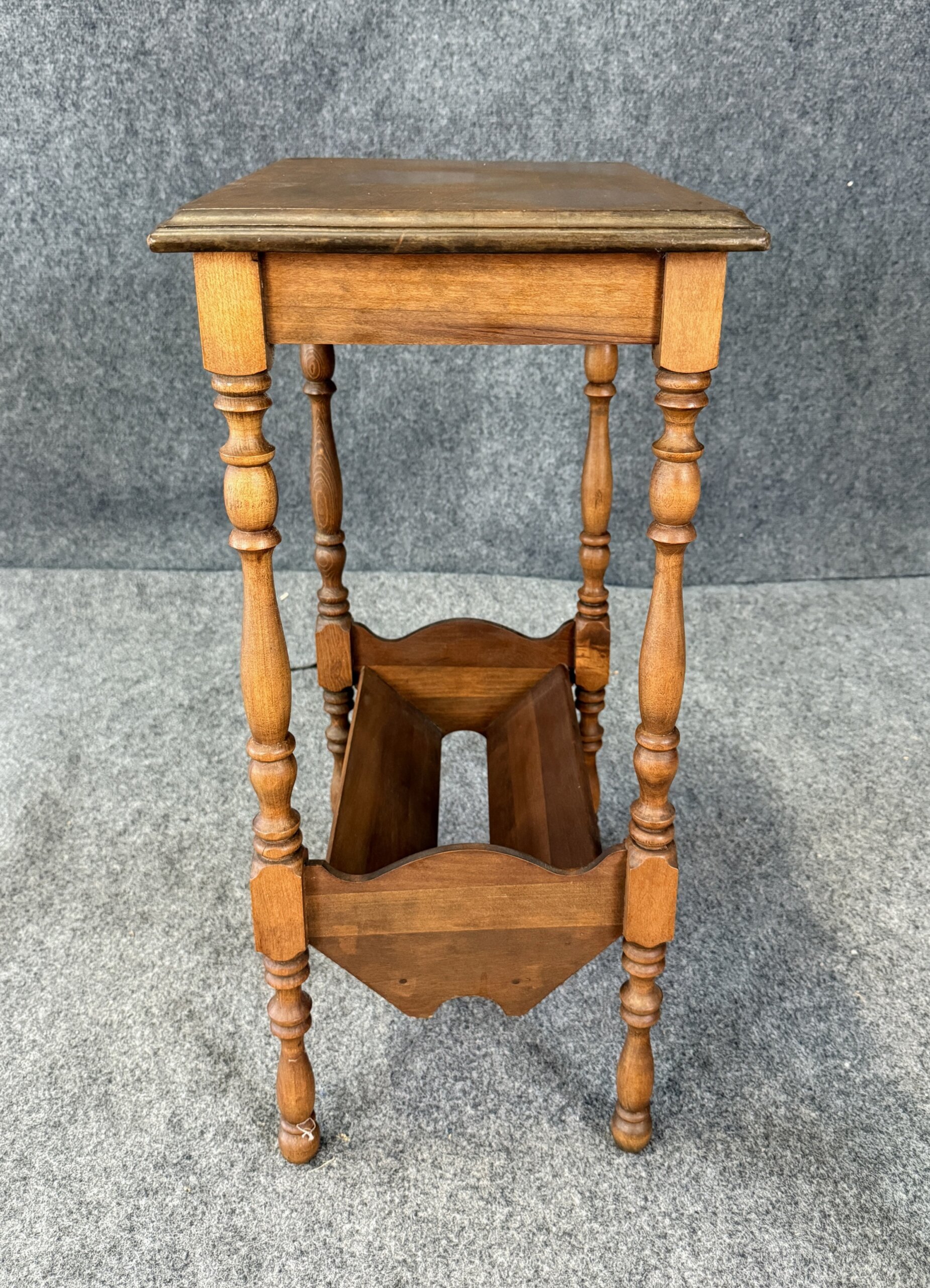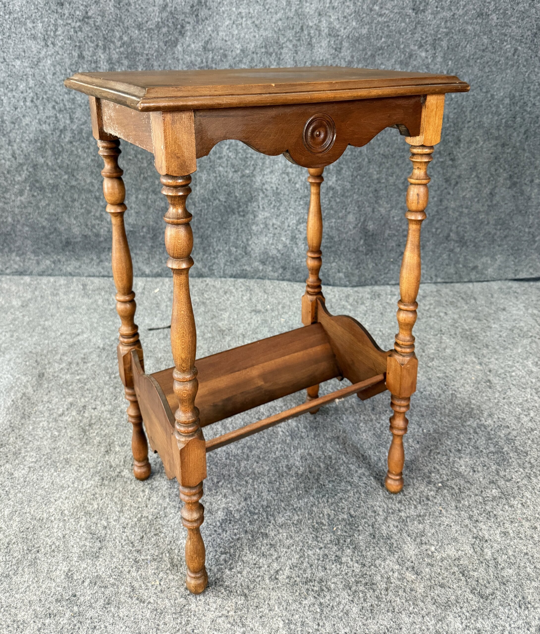 This early 1900s solid maple end table features classic turned legs, a warm aged finish, and a compact rectangular top well suited for traditional interiors. The lower built-in magazine rack adds both visual interest and practical storage, reflecting the thoughtful craftsmanship of the period. Its sturdy construction and timeless design make it a versatile accent piece for a living room, study, or bedroom.