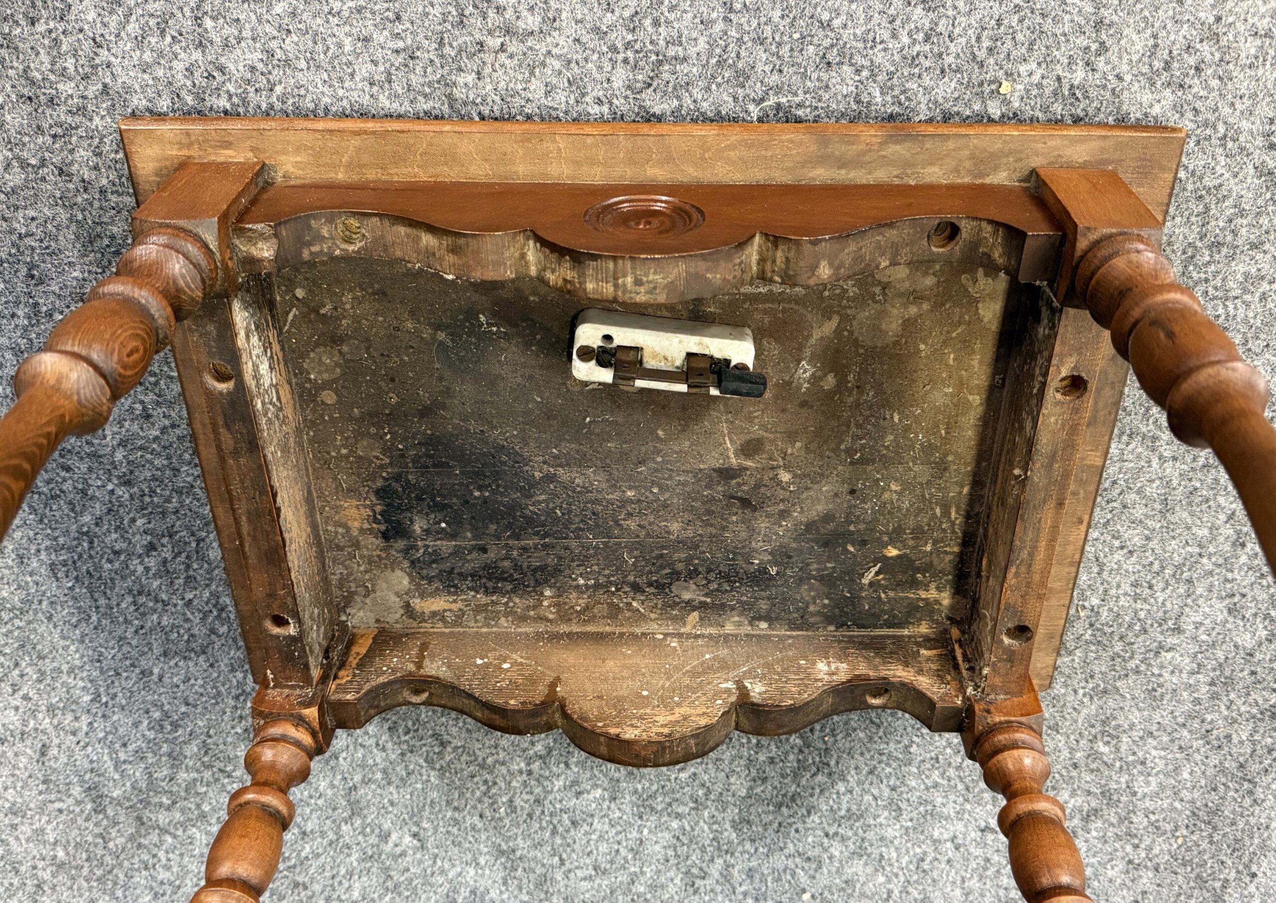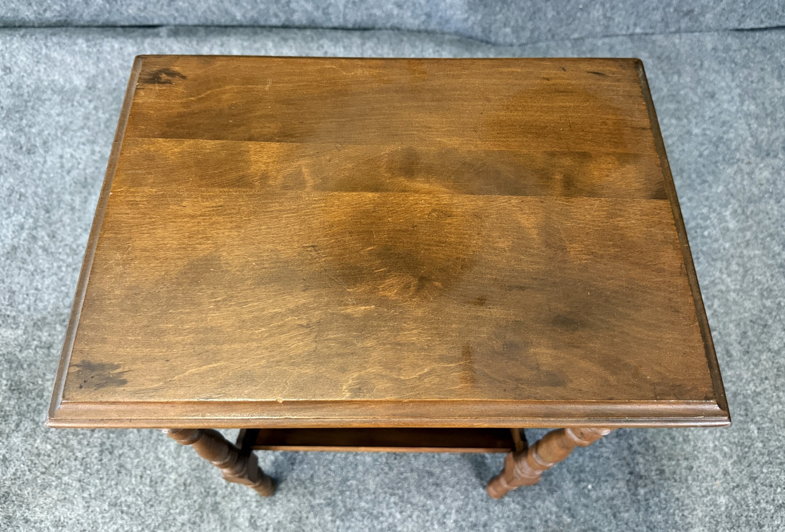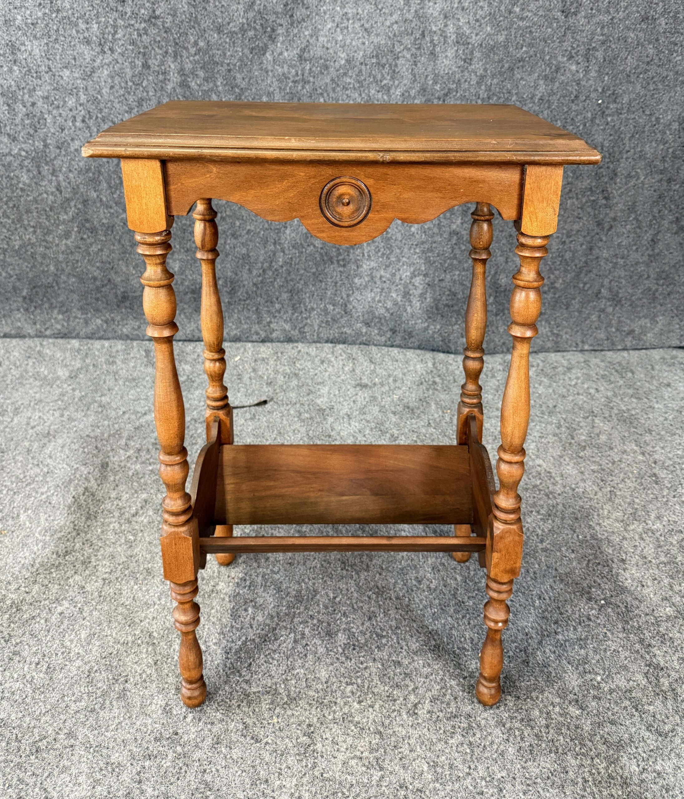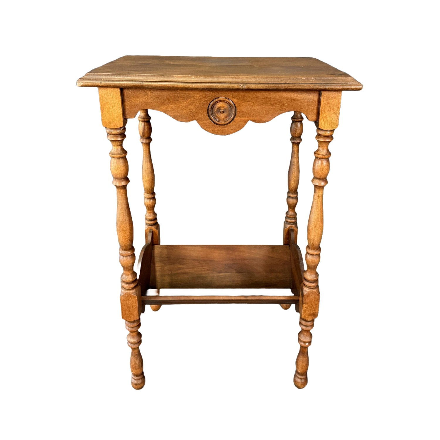 This early 1900s solid maple end table features classic turned legs, a warm aged finish, and a compact rectangular top well suited for traditional interiors. The lower built-in magazine rack adds both visual interest and practical storage, reflecting the thoughtful craftsmanship of the period. Its sturdy construction and timeless design make it a versatile accent piece for a living room, study, or bedroom.