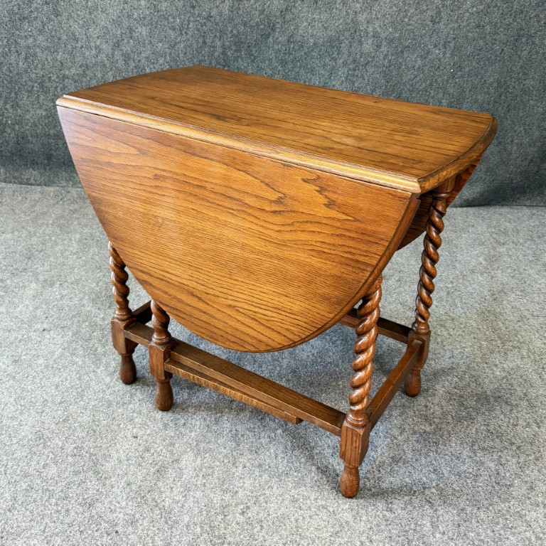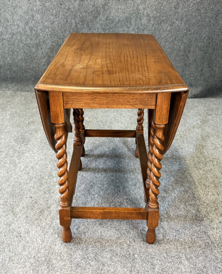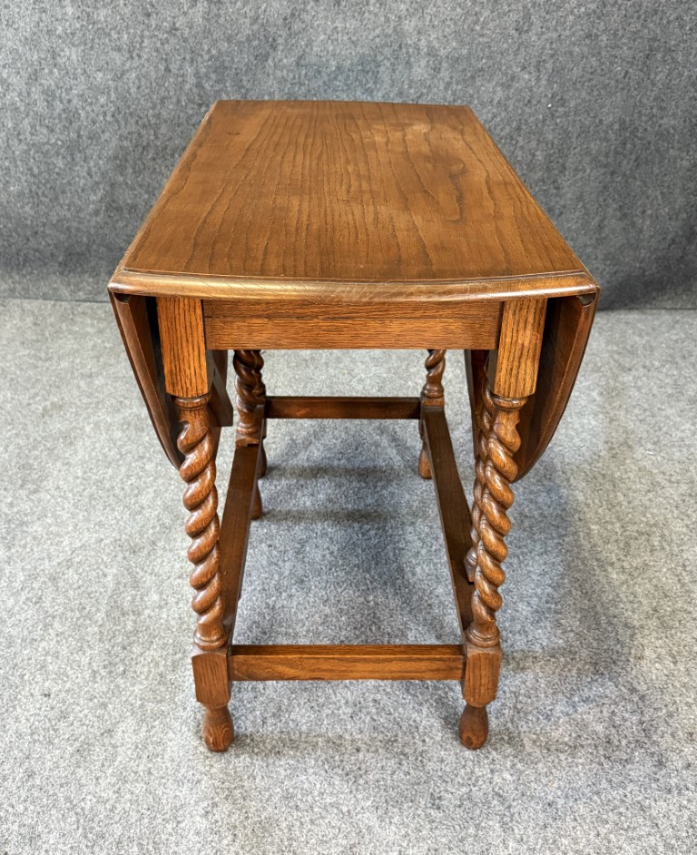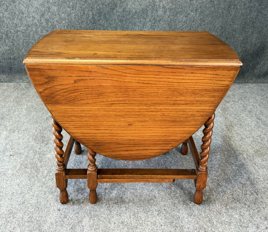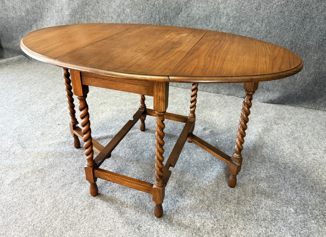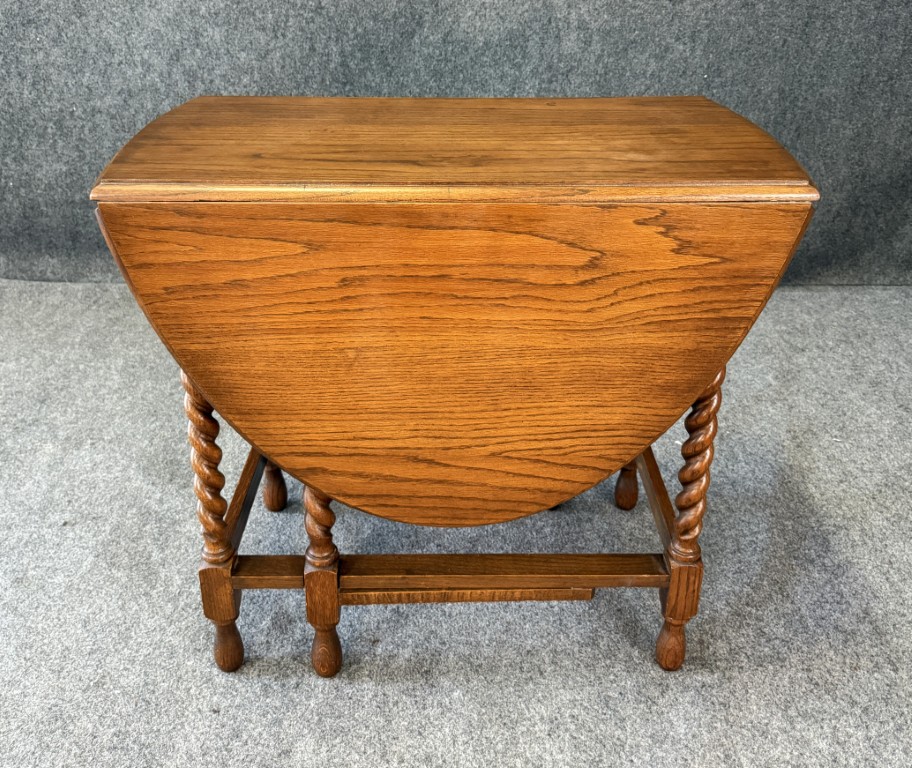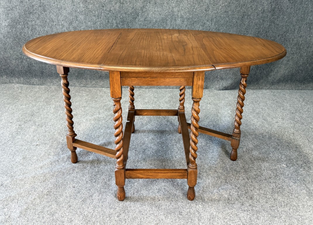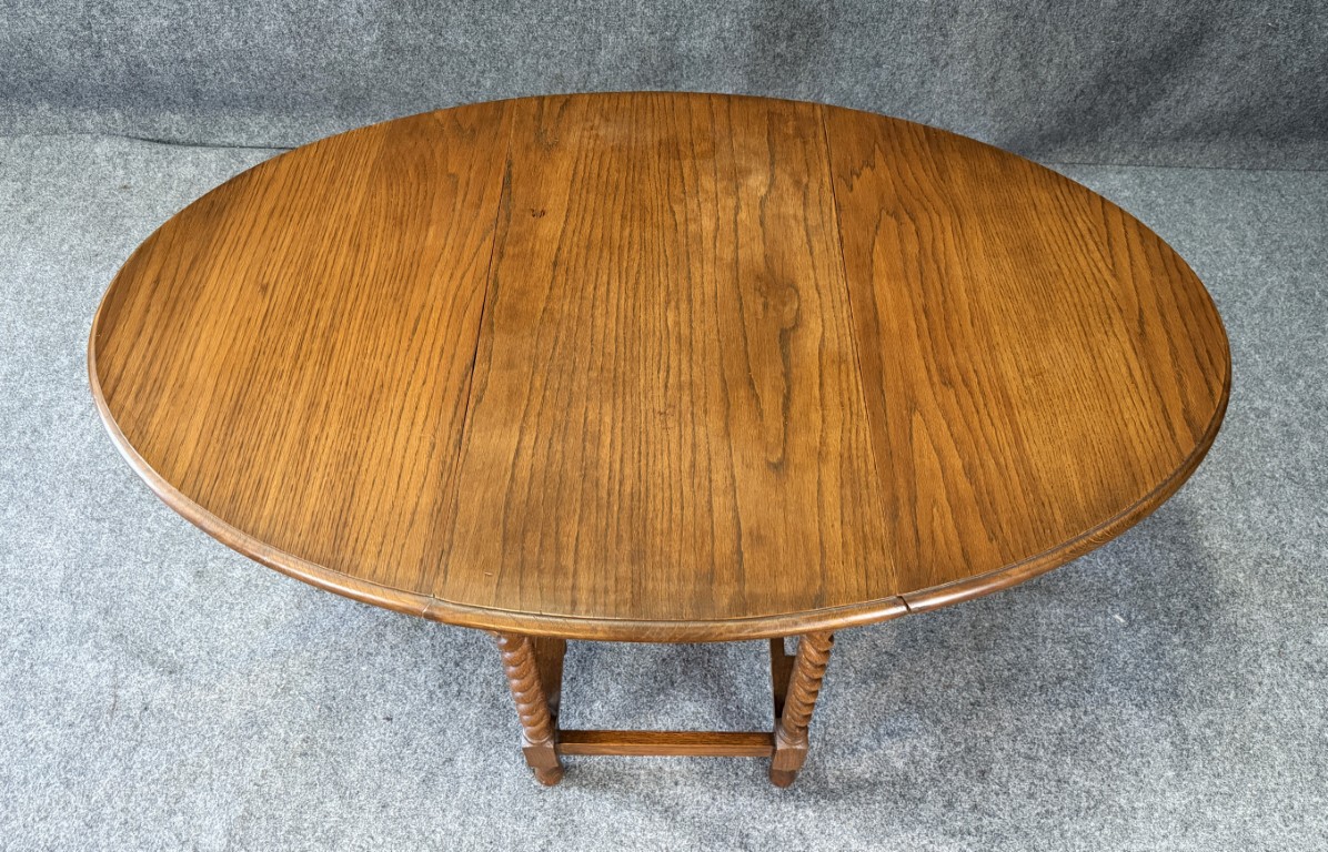 This early 1900s solid oak drop side table features a generously scaled oval top with hinged leaves that fold down for versatile use. The richly grained oak is supported by boldly turned barley-twist legs connected by sturdy stretchers, reflecting quality craftsmanship of the period. Both practical and decorative, it functions beautifully as a dining table, game table, or console when not fully opened.