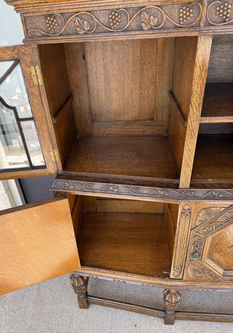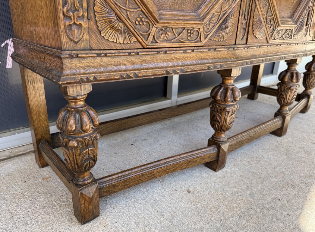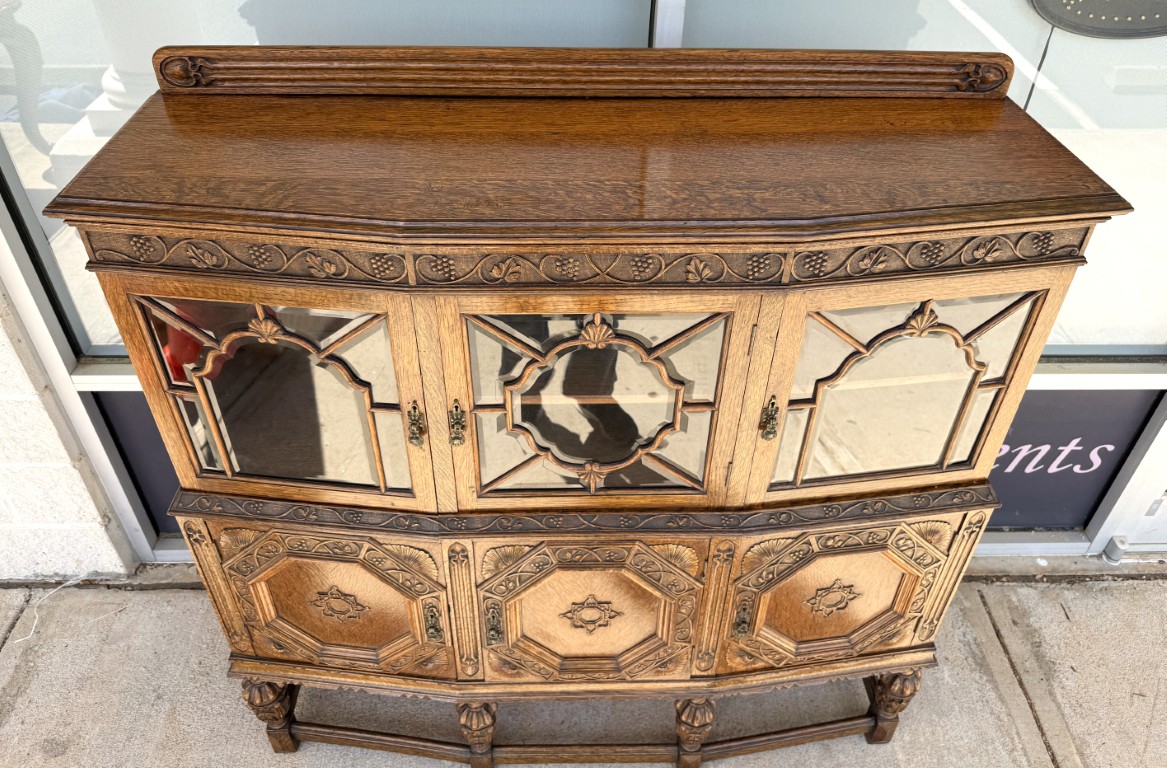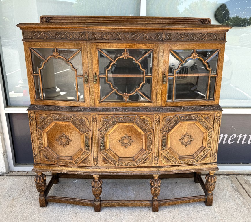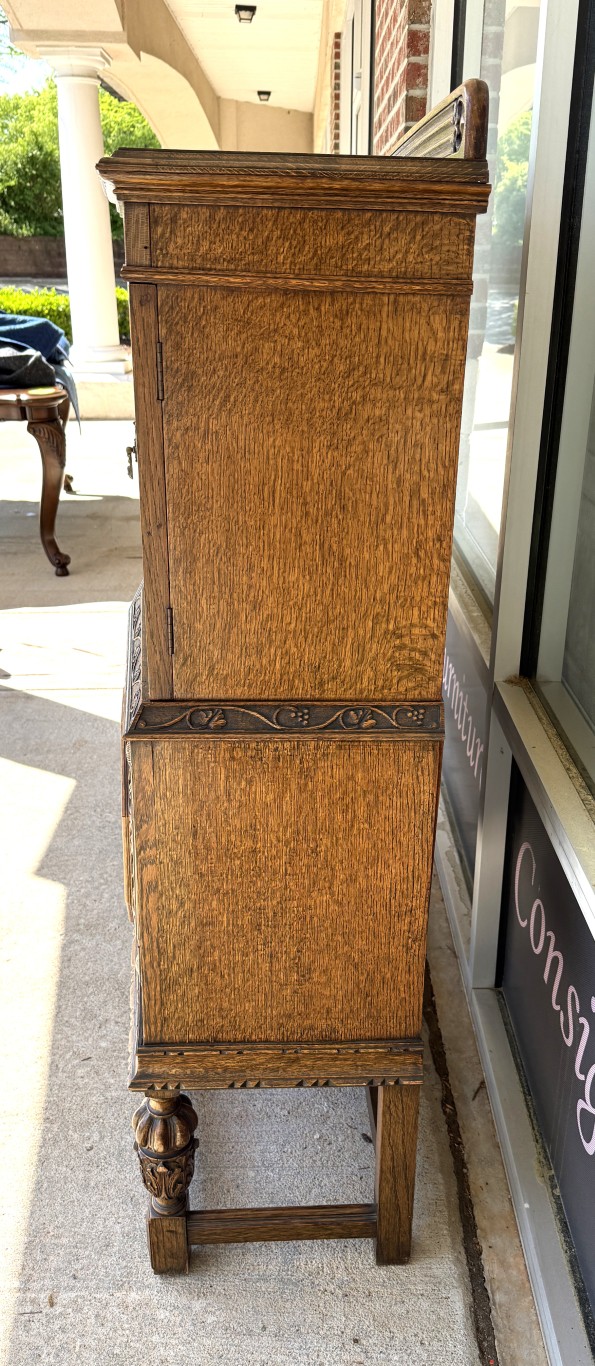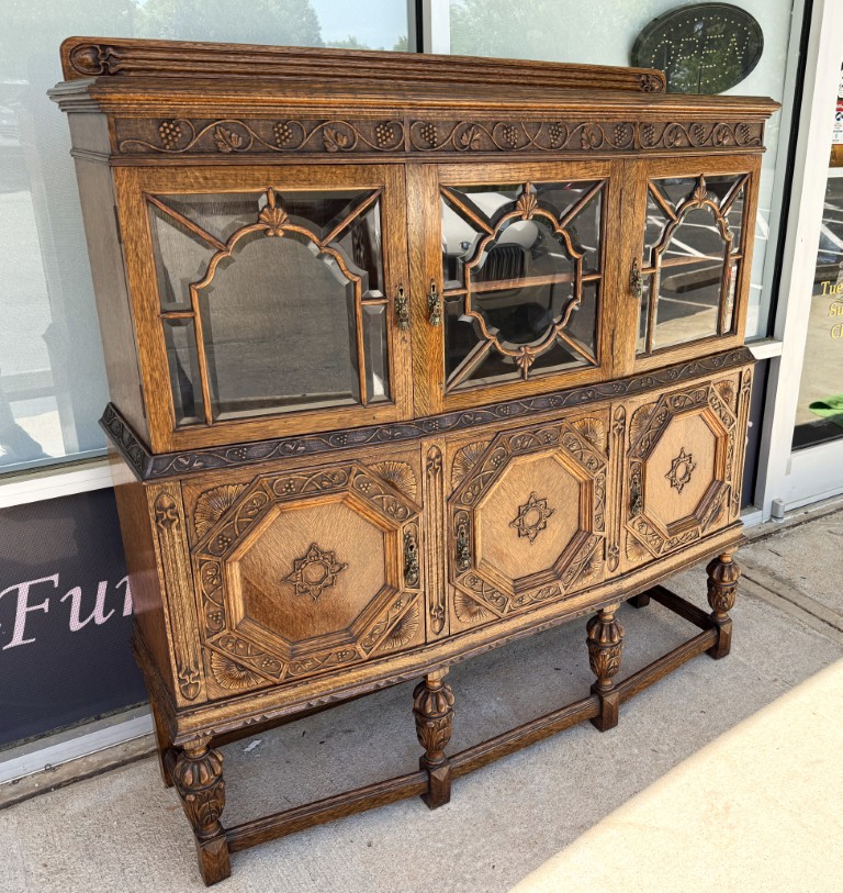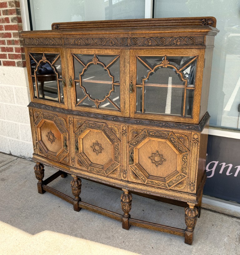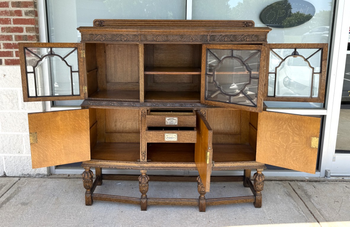 Tiger oak wood is displayed beautifully on this early 1900s buffet with areas of continuous grain pattern, only to be interrupted by detailed carvings of botanicals, grapes, and medallions. The buffet divides the 6 cabinet spaces into with two sections with an upper section featuring individually paned and beveled glass doors and a lower section with intricately carved wooden doors. Some cabinets offer large open spaces, while others offer shelves or drawers to optimize storage. The entire cabinet sits upon a stretcher base.