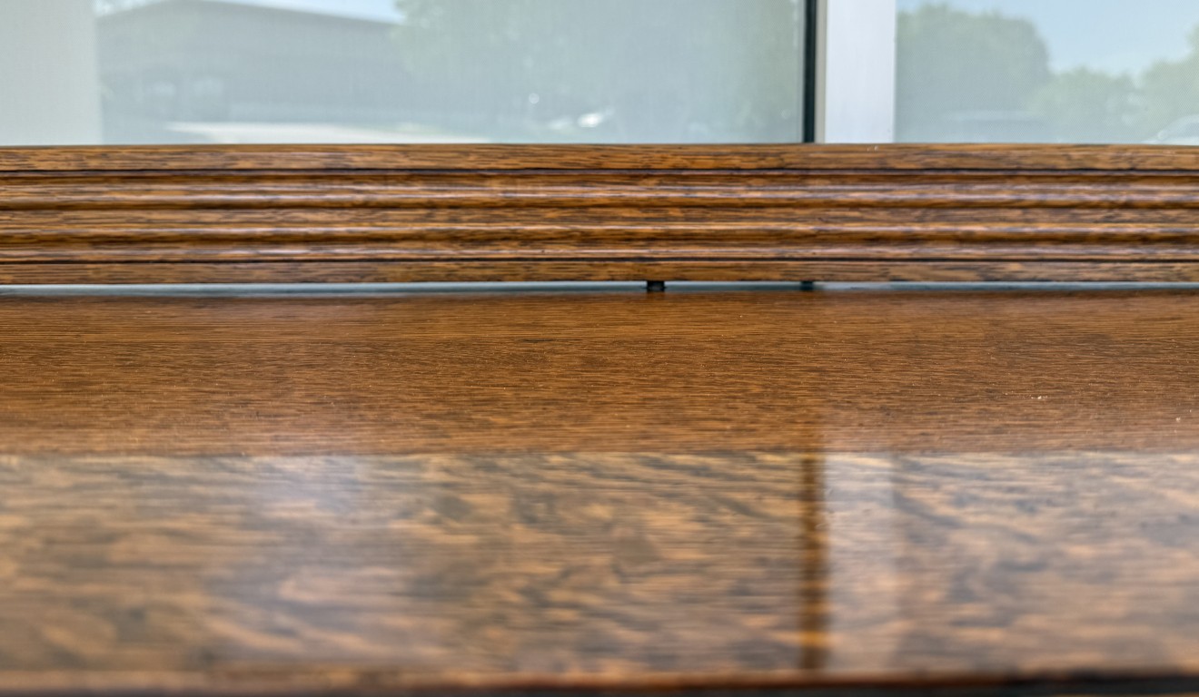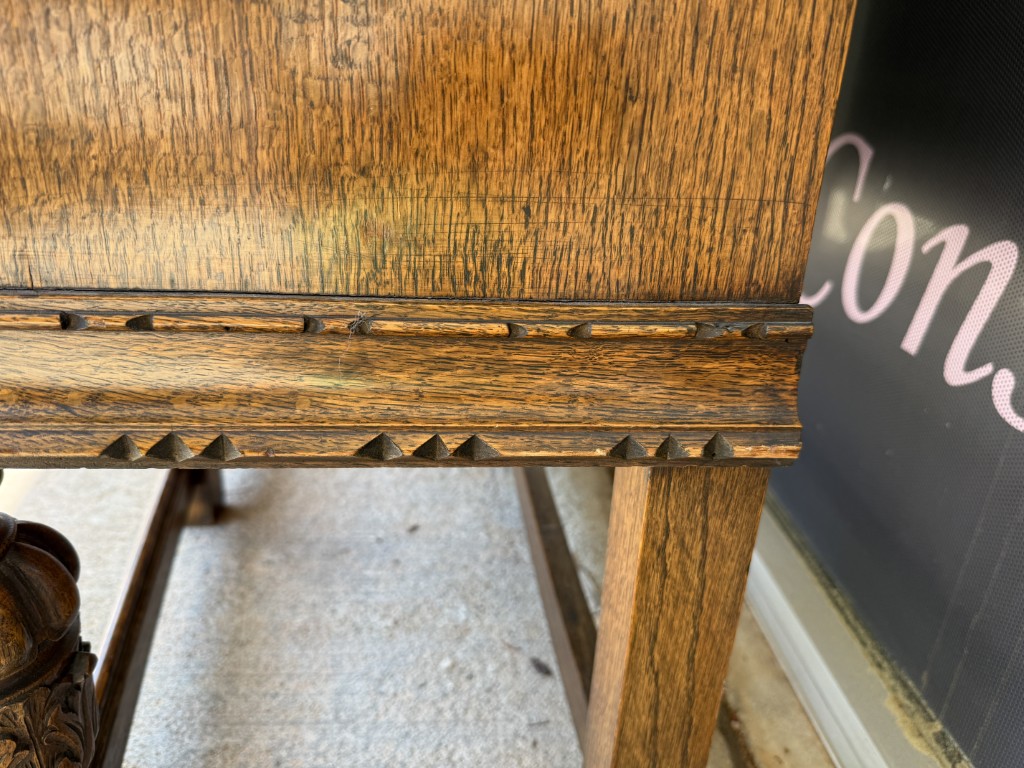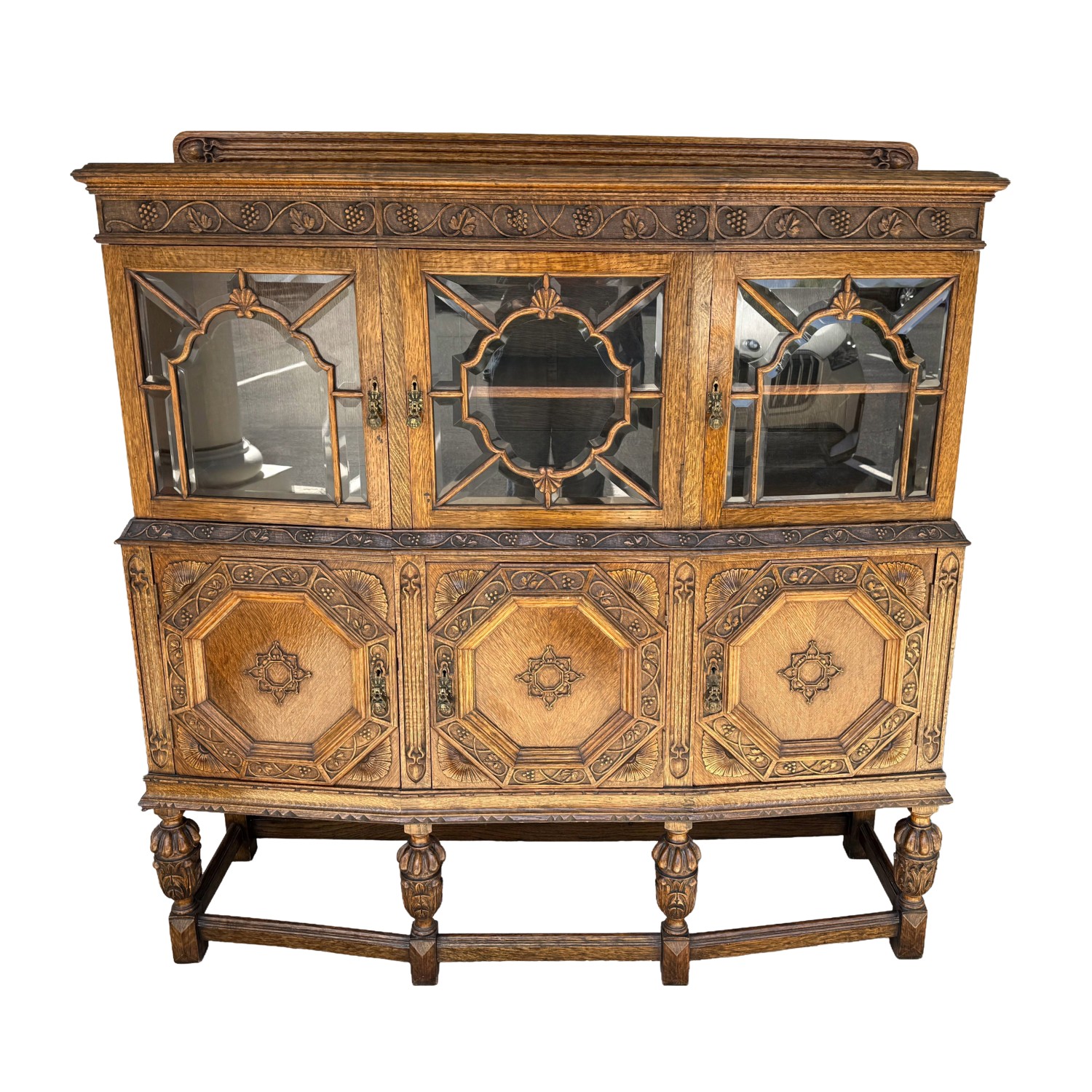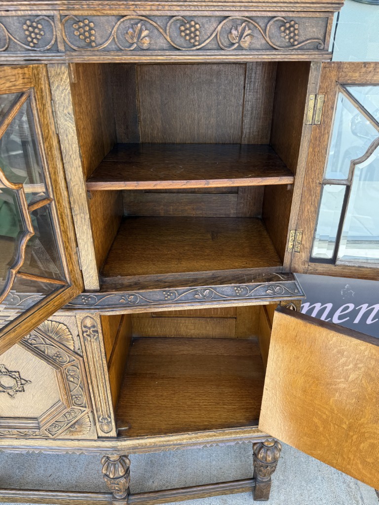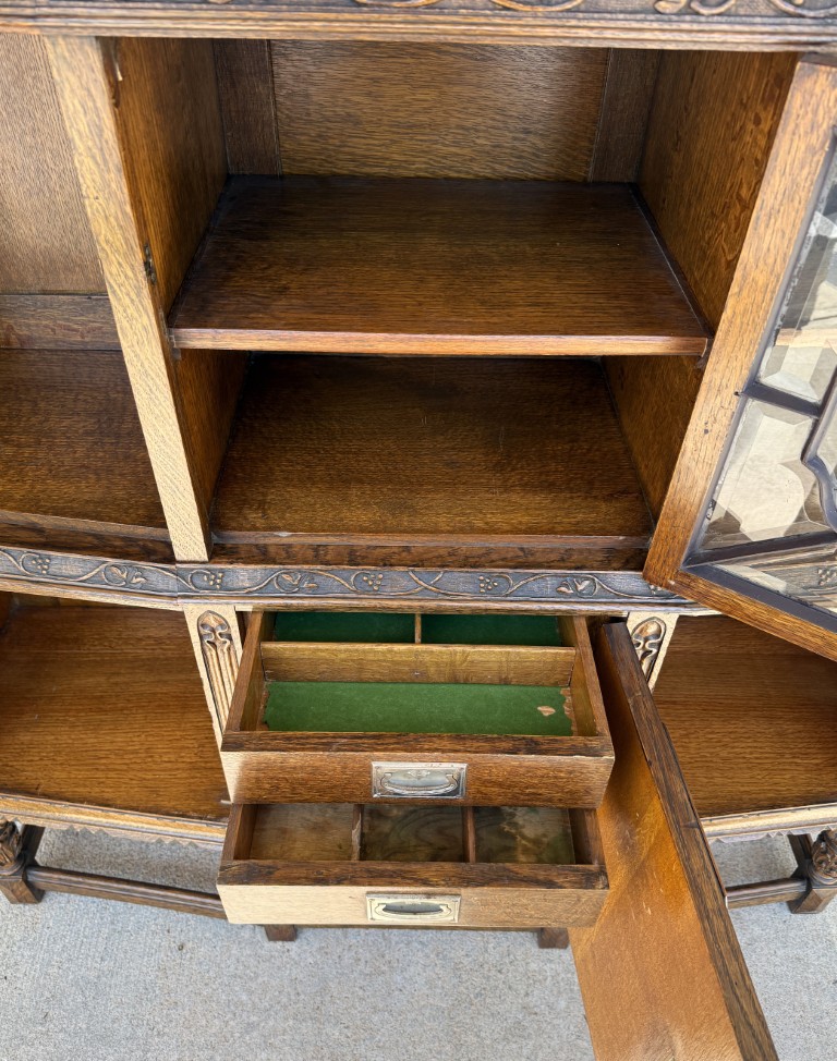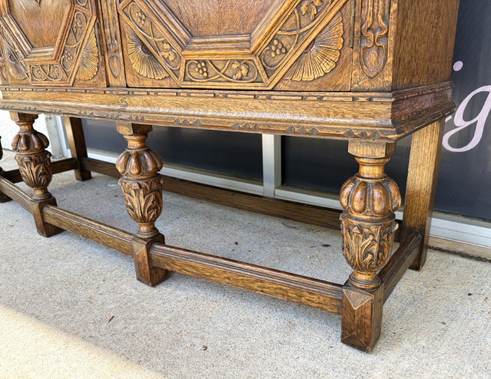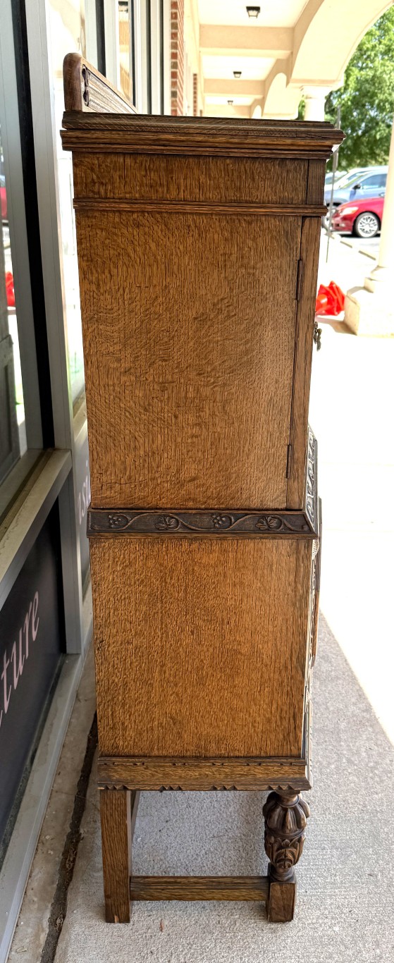 Tiger oak wood is displayed beautifully on this early 1900s buffet with areas of continuous grain pattern, only to be interrupted by detailed carvings of botanicals, grapes, and medallions. The buffet divides the 6 cabinet spaces into with two sections with an upper section featuring individually paned and beveled glass doors and a lower section with intricately carved wooden doors. Some cabinets offer large open spaces, while others offer shelves or drawers to optimize storage. The entire cabinet sits upon a stretcher base.