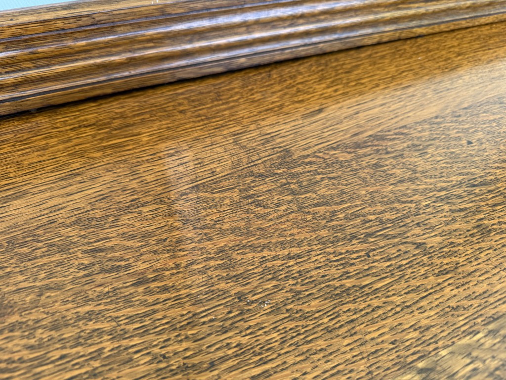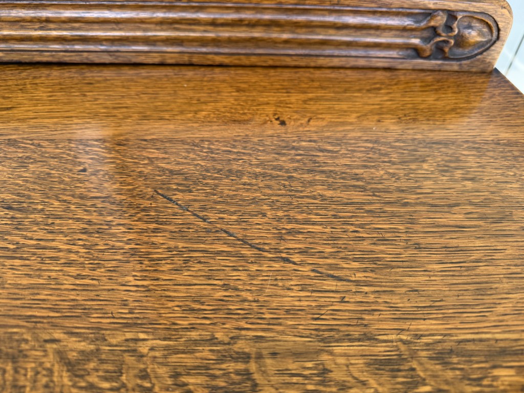 Your happiness with this item is of the utmost importance to us so please review the photographs carefully for condition. We endeavor to try and list any issues we may observe; we may not necessarily note all minor nicks and dings or we may simply miss something. Please inspect carefully to ensure your full happiness with this item. For this particular piece we found minor wear consistent with age and prior use, including some scratches on the top, the wooden gallery has a slight arch, and the left upper cabinet door is missing its shelf.