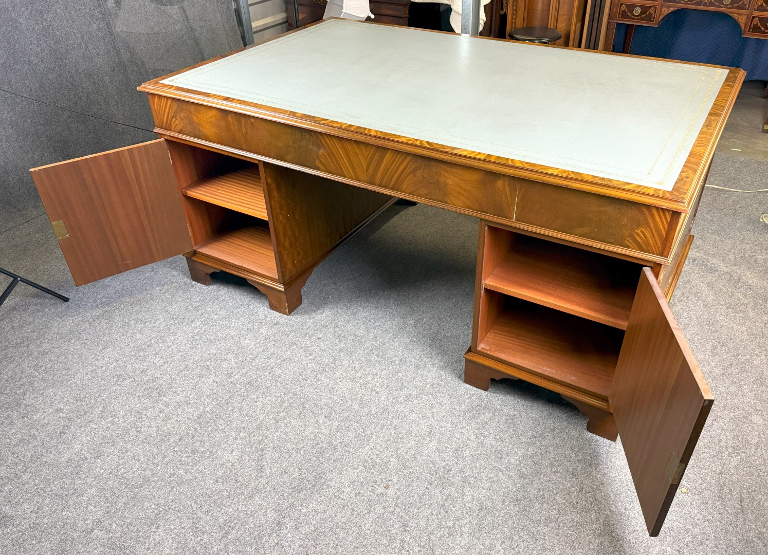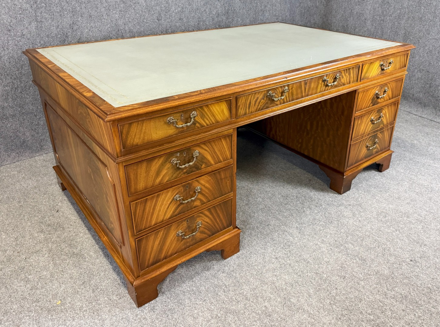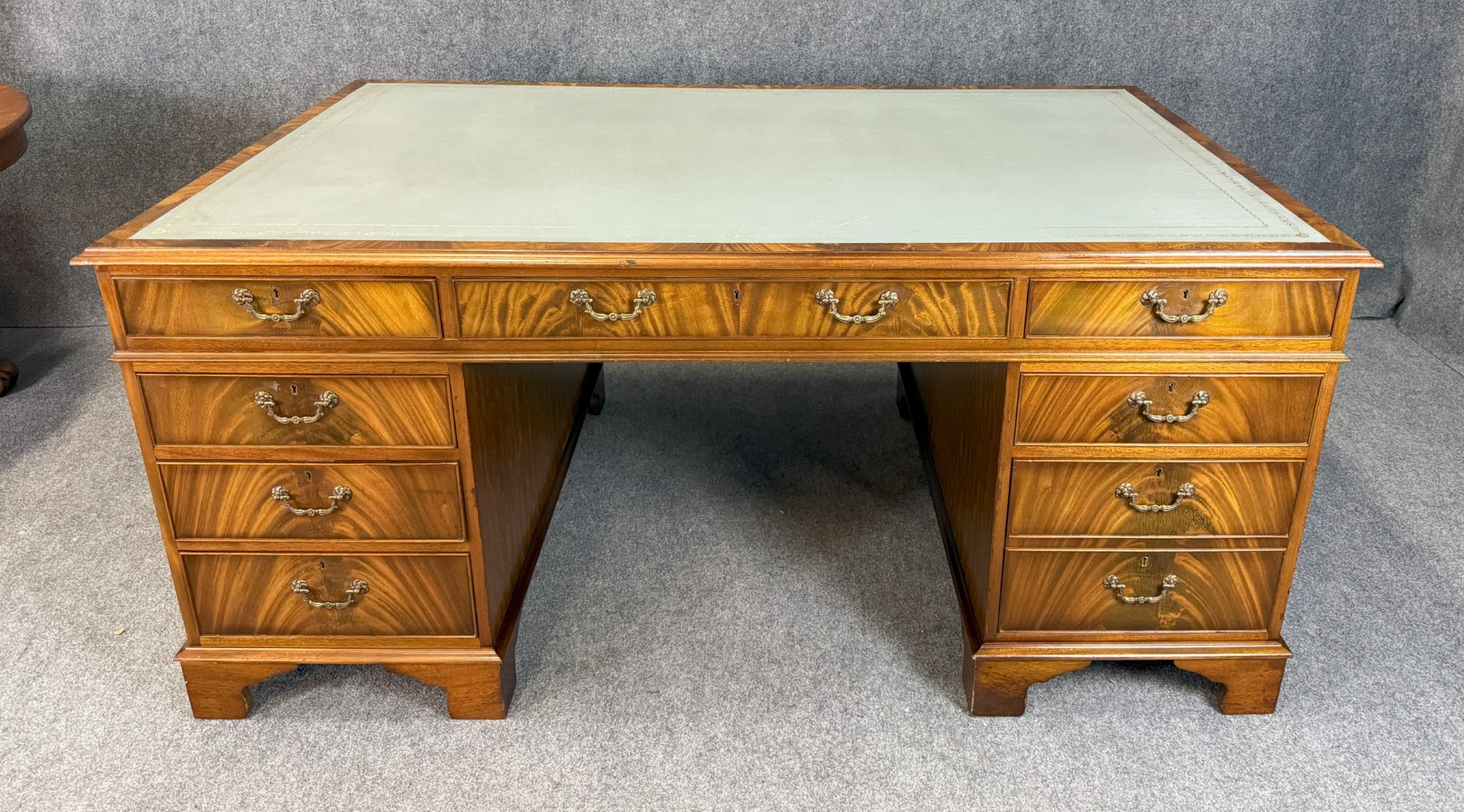 Early 20th Century Flamed Mahogany Blue Leather Top Executive Desk