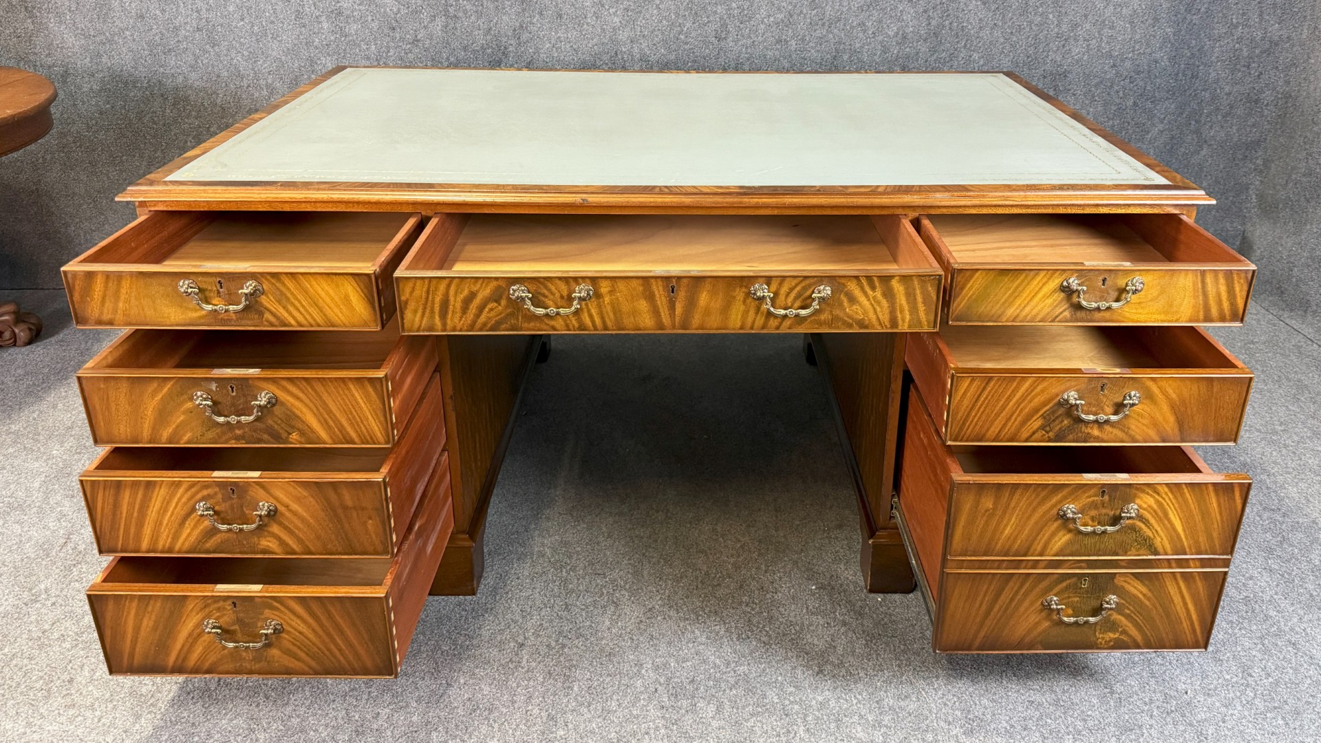This early 20th century executive desk is crafted from richly figured flamed mahogany and features a tooled blue leather top. The desk is fitted with nine drawers and cabinets on the back side for ample storage, accented by brass pulls. Finished on all sides, it offers both elegance and functionality, making it suitable as a centerpiece in an office or study.