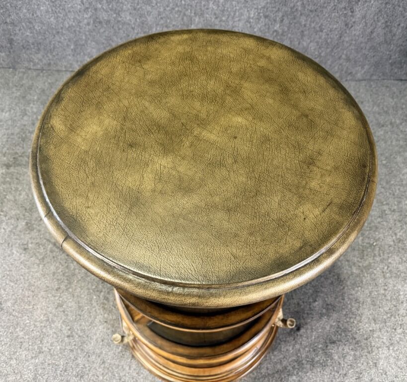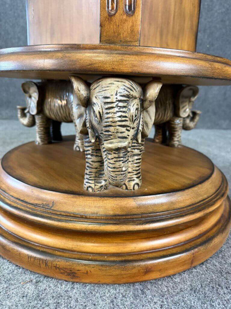 This distinctive rotating library table features a circular design with tiered open shelving, finished in warm wood tones, ideal for books or display. The sculptural base is supported by intricately detailed elephant figures, adding a bold decorative element while allowing the table to rotate for convenient access from all sides.