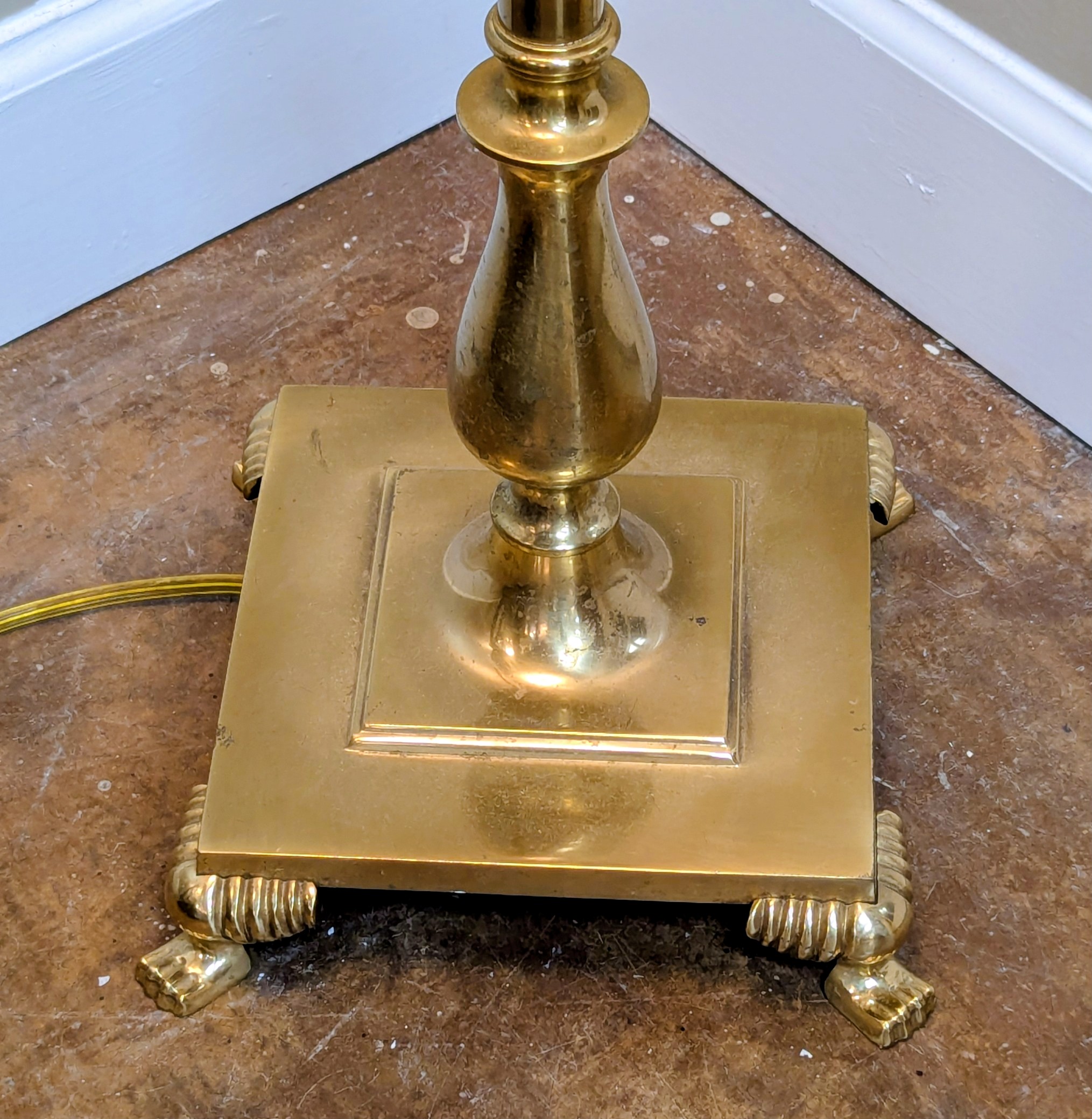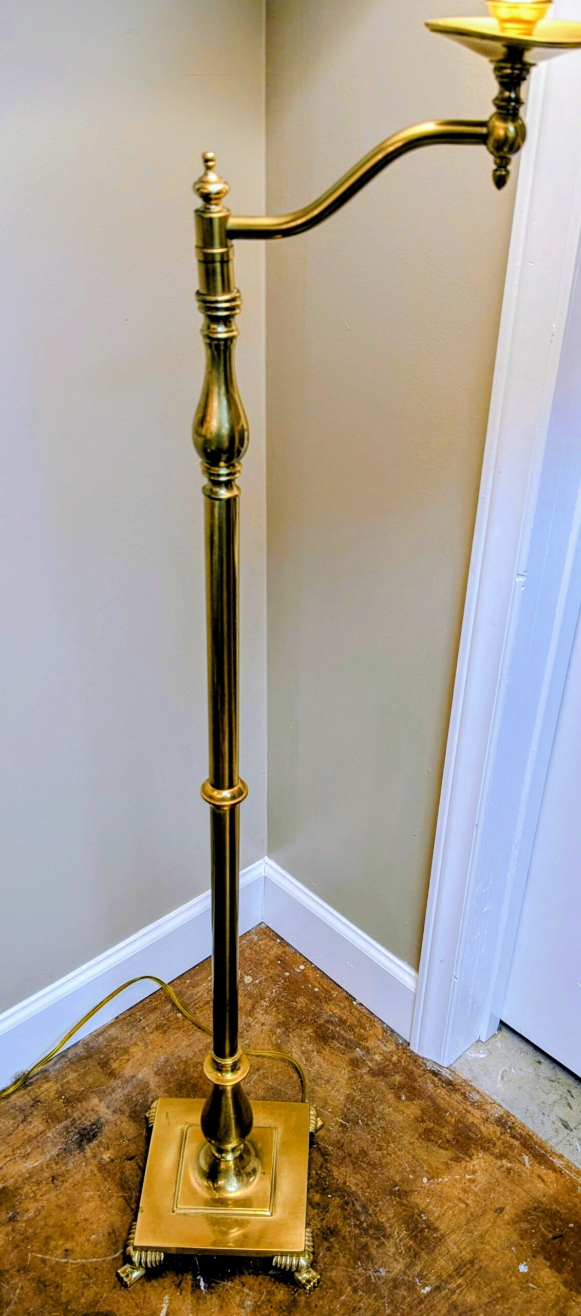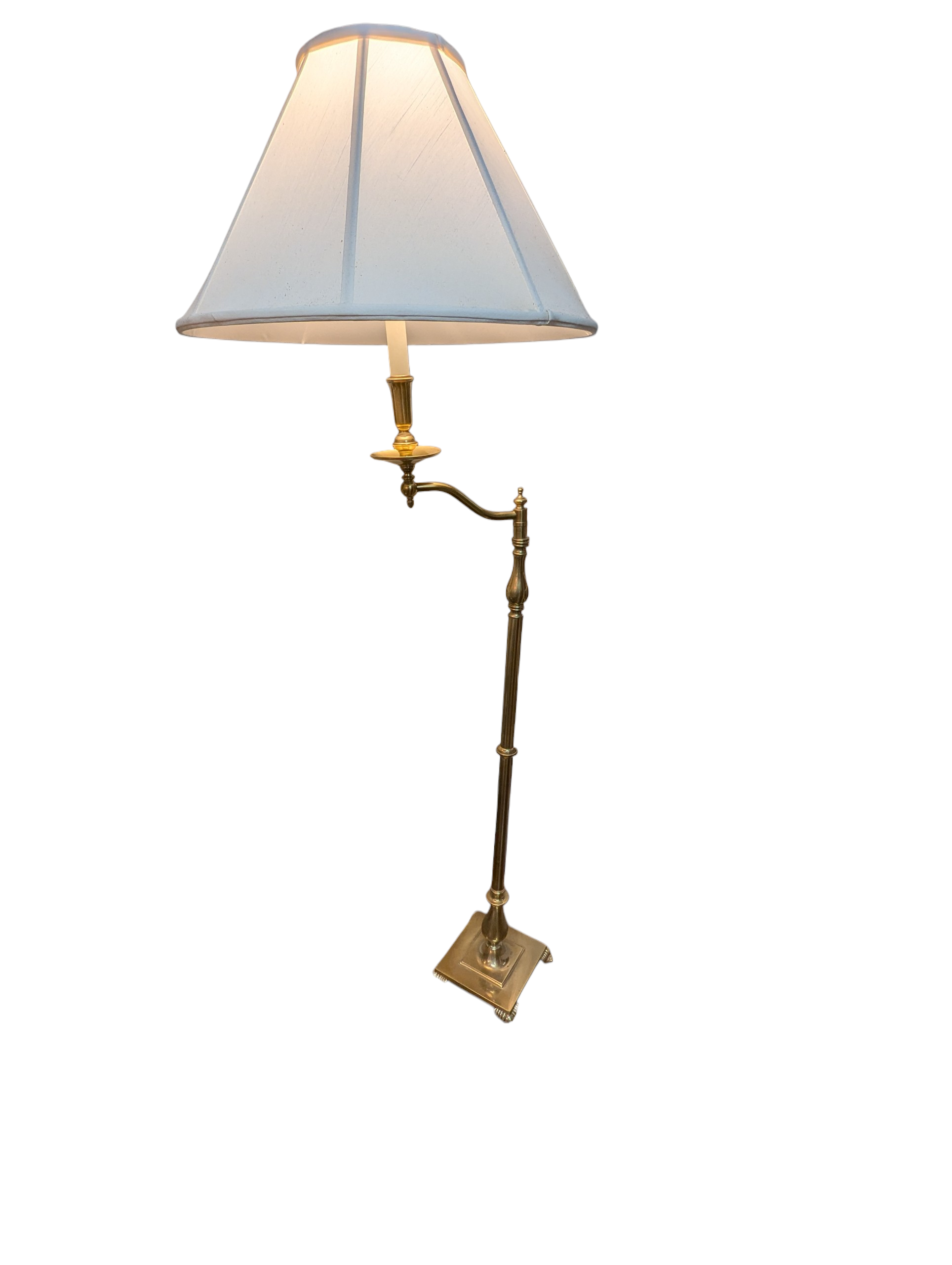 Solid Brass base standing lamp by Frederick Cooper Lamp Co. Chicago Ill. The lamp [circa 1990] features a square brass base with lion paw feet. The brass center baluster supports a single candlestick that swivels to direct the light of the three-way bulb. Frederick Cooper Has a wonderful reputation for making high end lamps of quality material. This particular lamp is called a “bridge lamp ” It’s very elegant and extremely heavy.