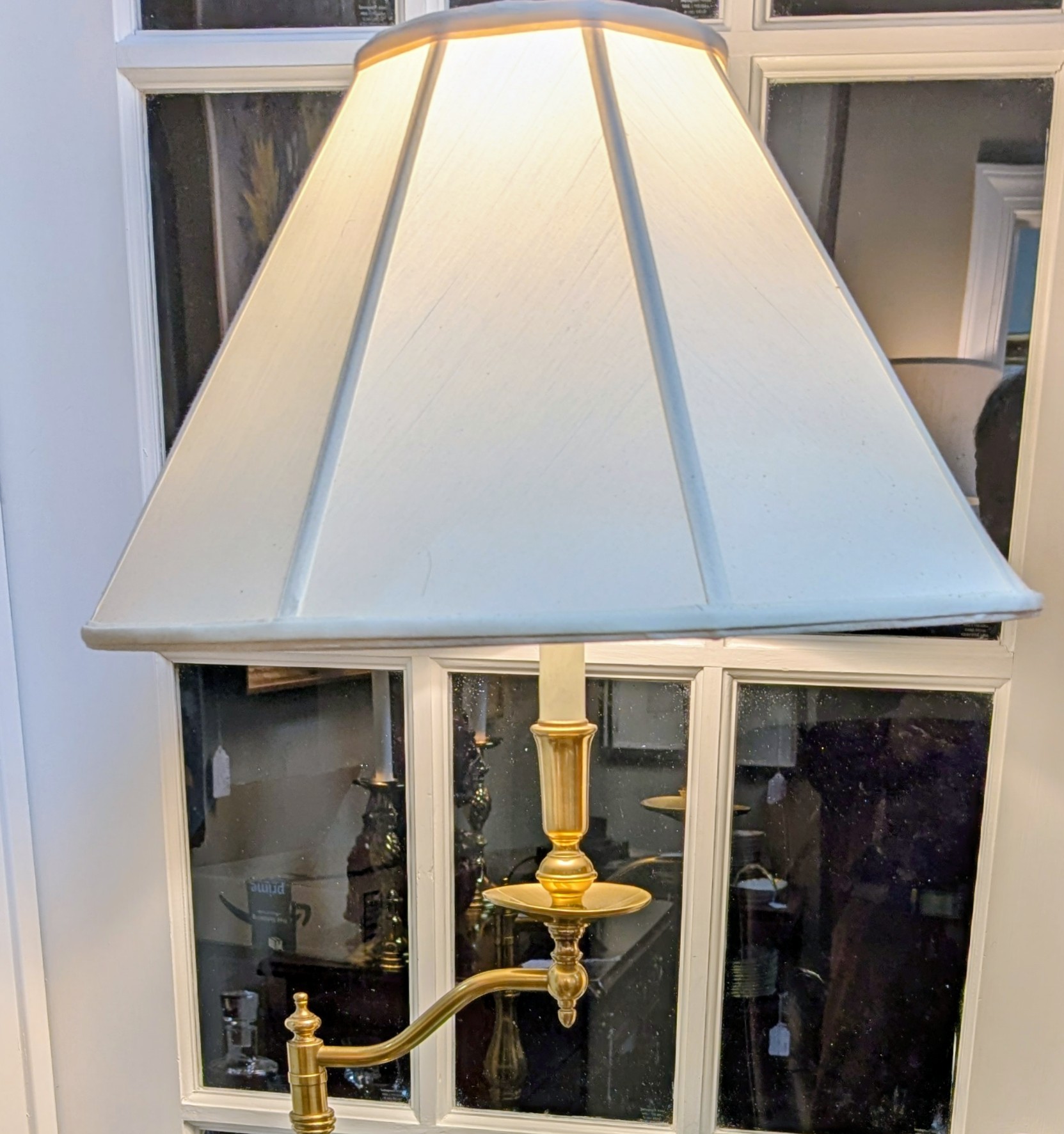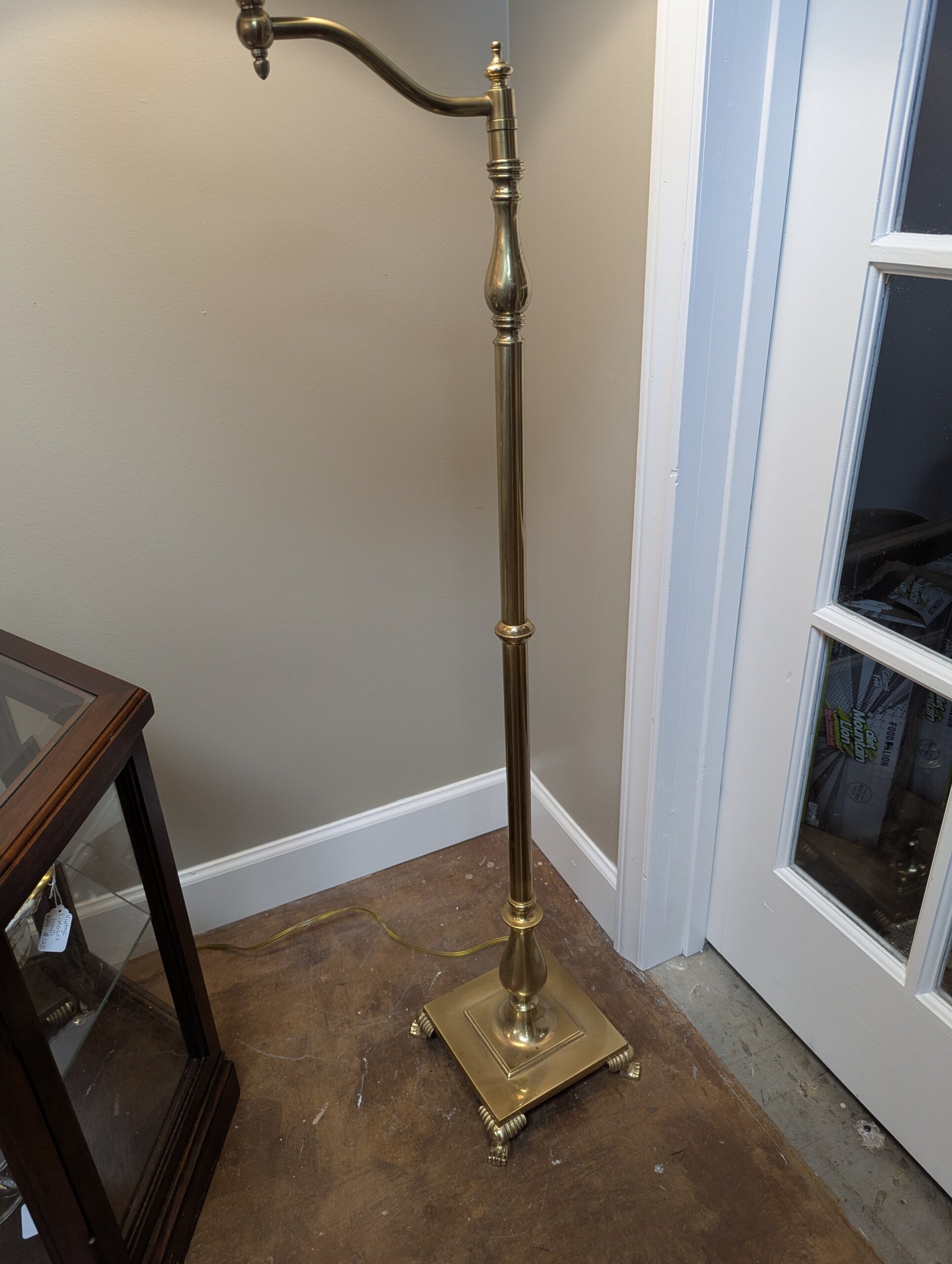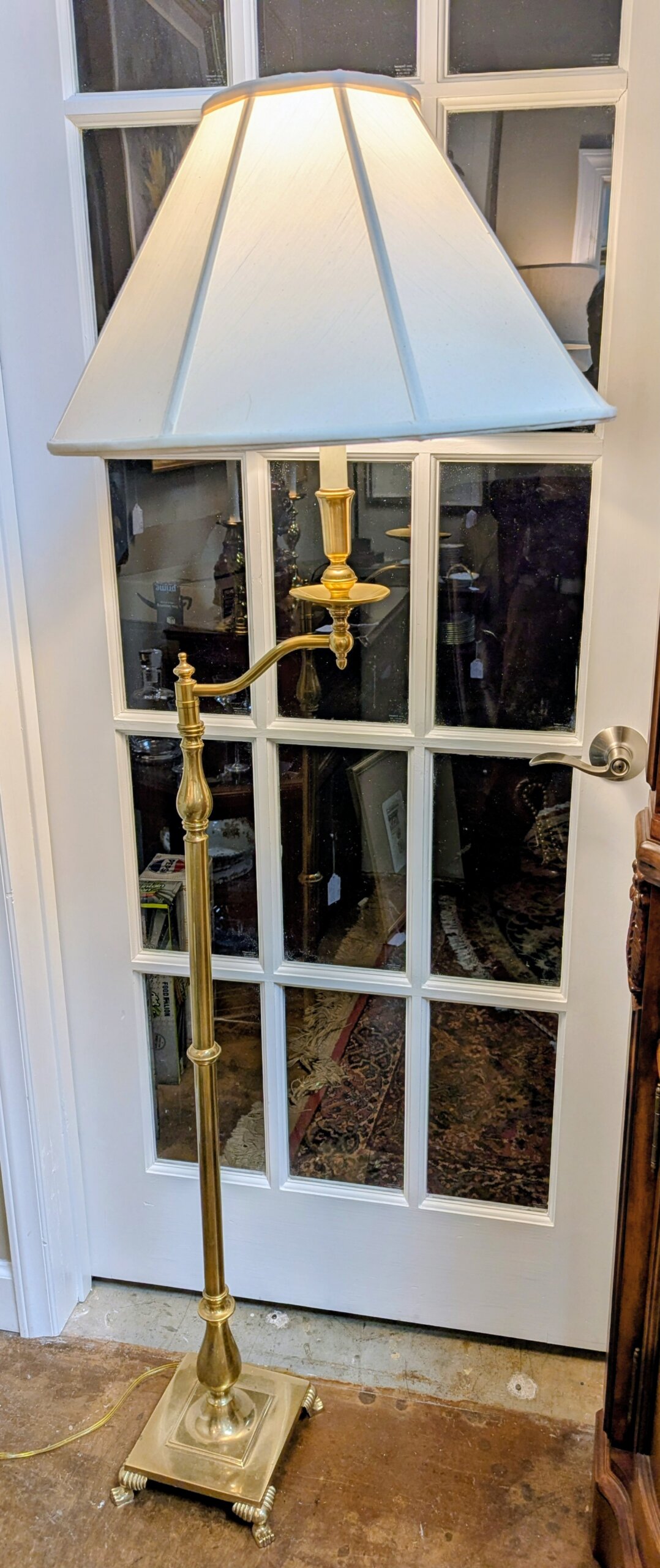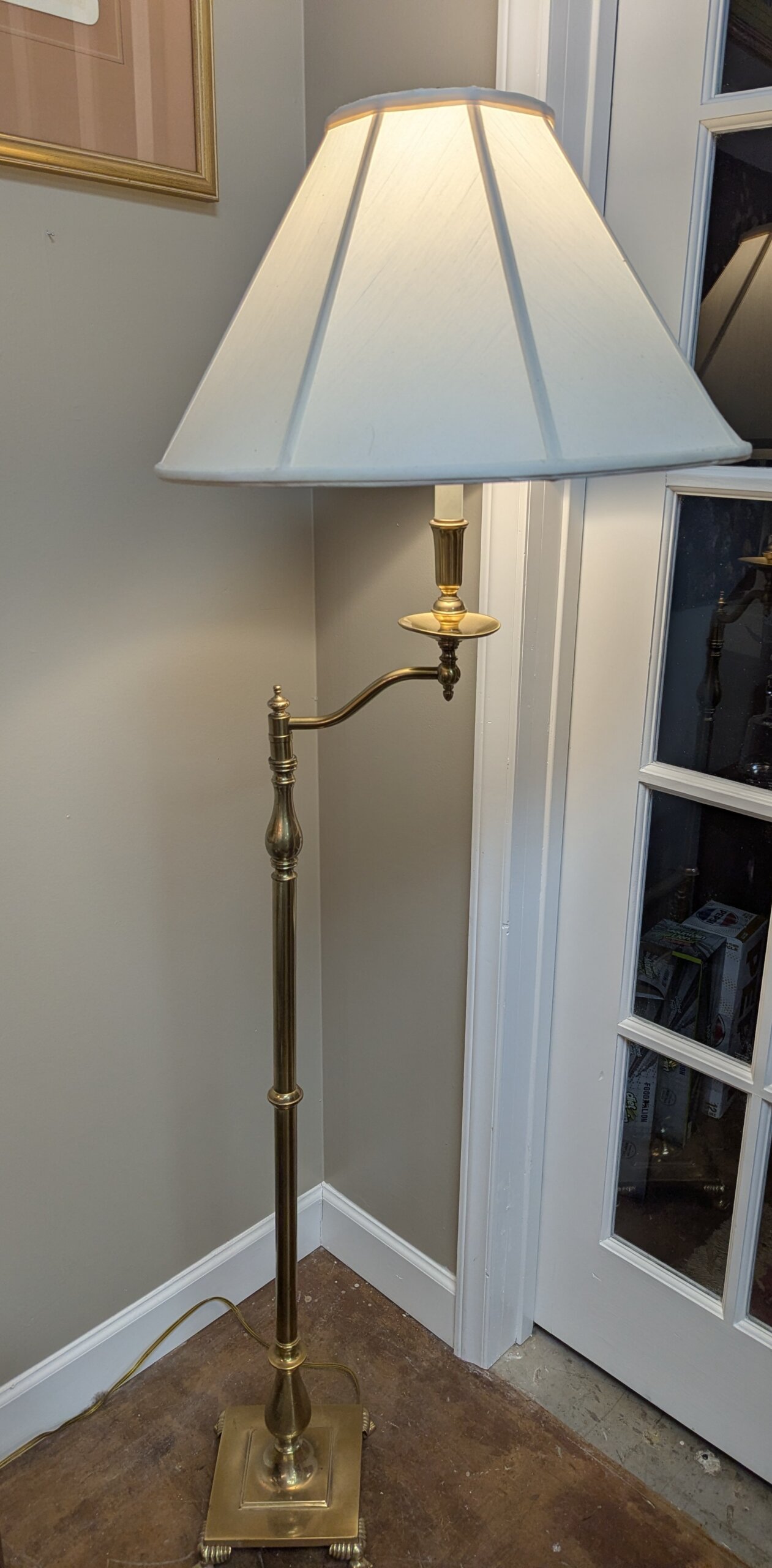 Solid Brass base standing lamp by Frederick Cooper Lamp Co. Chicago Ill. The lamp [circa 1990] features a square brass base with lion paw feet. The brass center baluster supports a single candlestick that swivels to direct the light of the three-way bulb. Frederick Cooper Has a wonderful reputation for making high end lamps of quality material. This particular lamp is called a “bridge lamp ” It’s very elegant and extremely heavy.