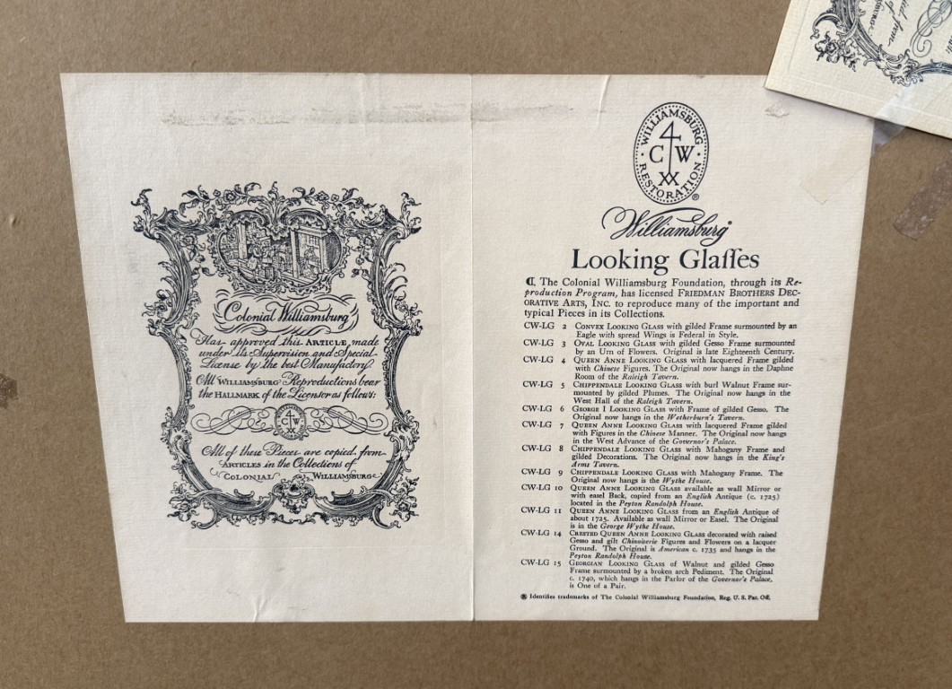 This Friedman Brothers Colonial Williamsburg Mirror, Model No. 6359, features a stunning walnut frame accented with ornate gold gilt detailing and a sculptural crest inspired by 18th-century design. Reproduced from an original mirror in Colonial Williamsburg’s collection, it captures the refinement and craftsmanship of the Chippendale era. A fine example of Friedman Brothers’ legacy, this piece represents the brand’s commitment to historically accurate, museum-quality reproductions treasured by collectors and decorators alike.