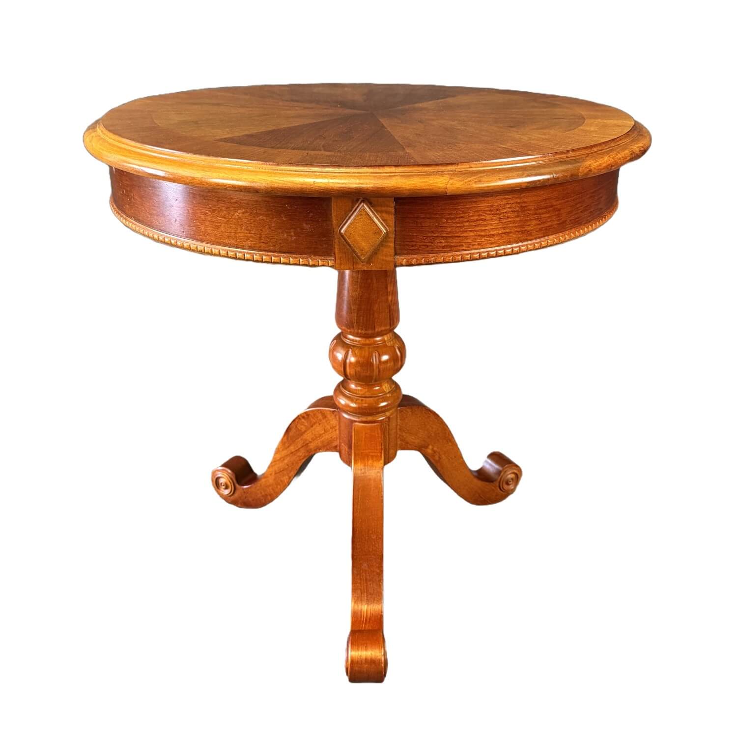 The Hammary American Heritage round lamp table showcases a warm wood finish with a beautifully patterned radial veneer top that highlights traditional craftsmanship. A turned pedestal base with three gracefully scrolled feet provides classic support, making it an ideal accent table for traditional living spaces.