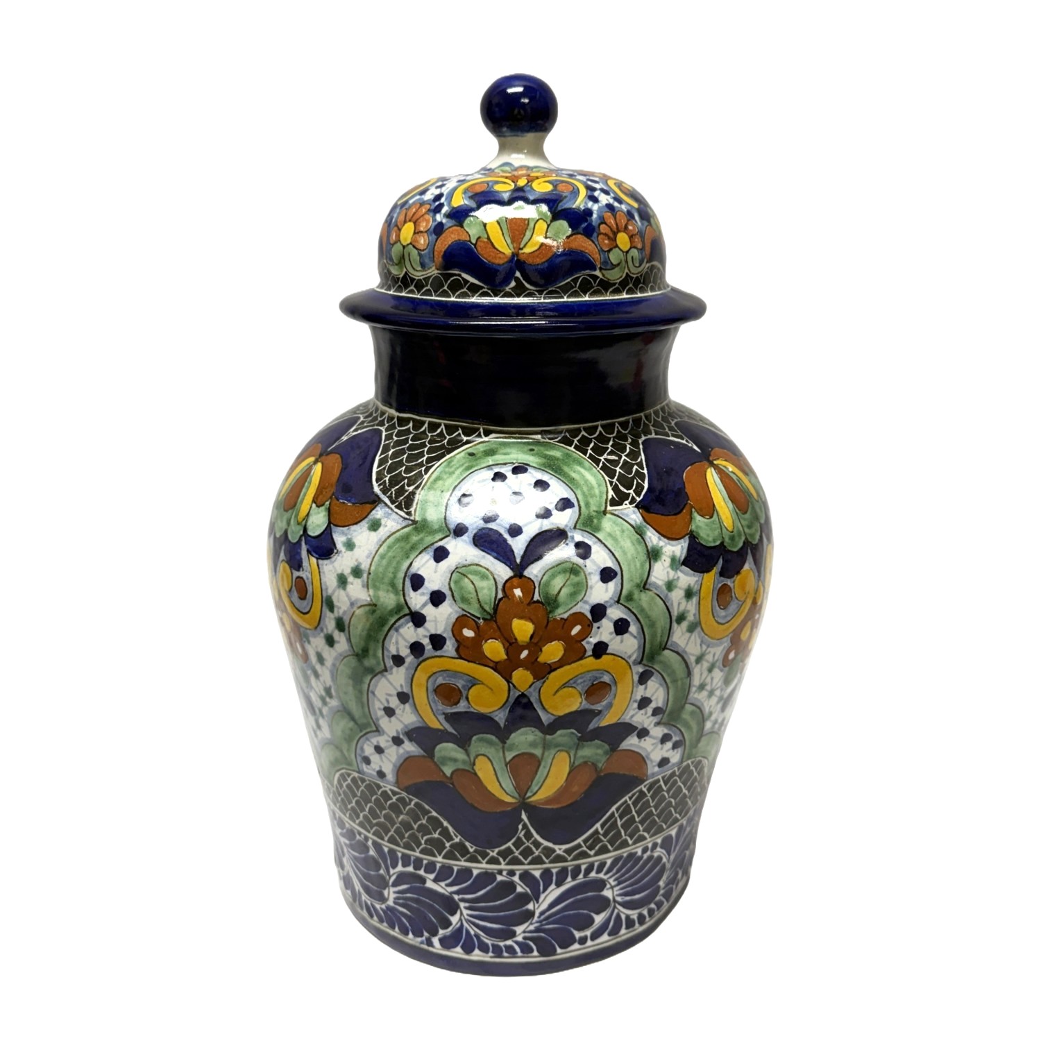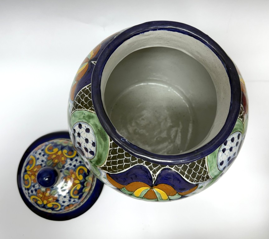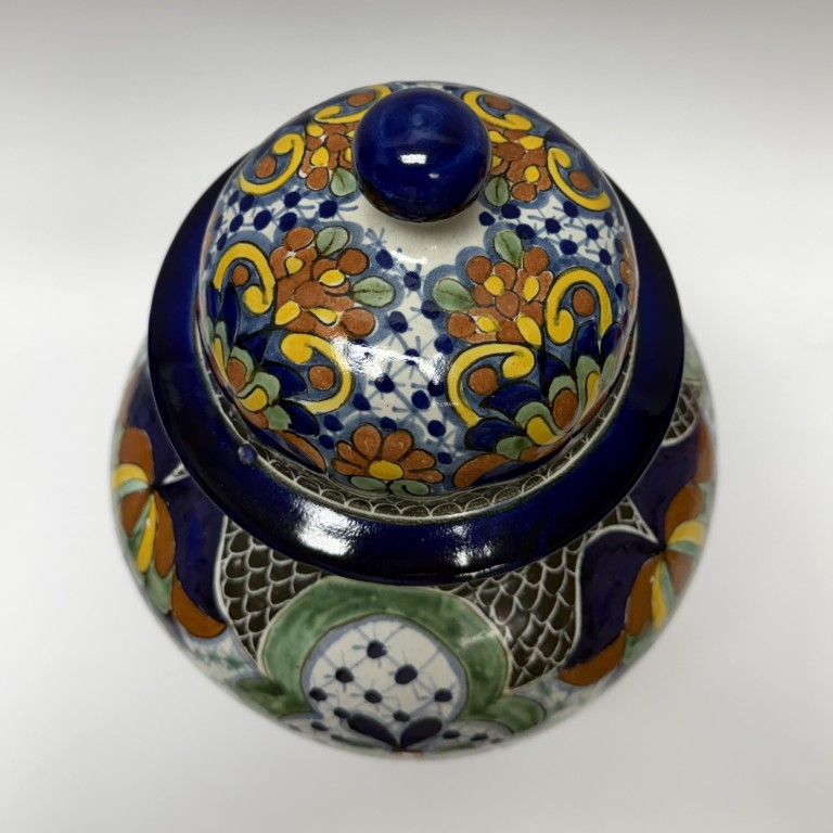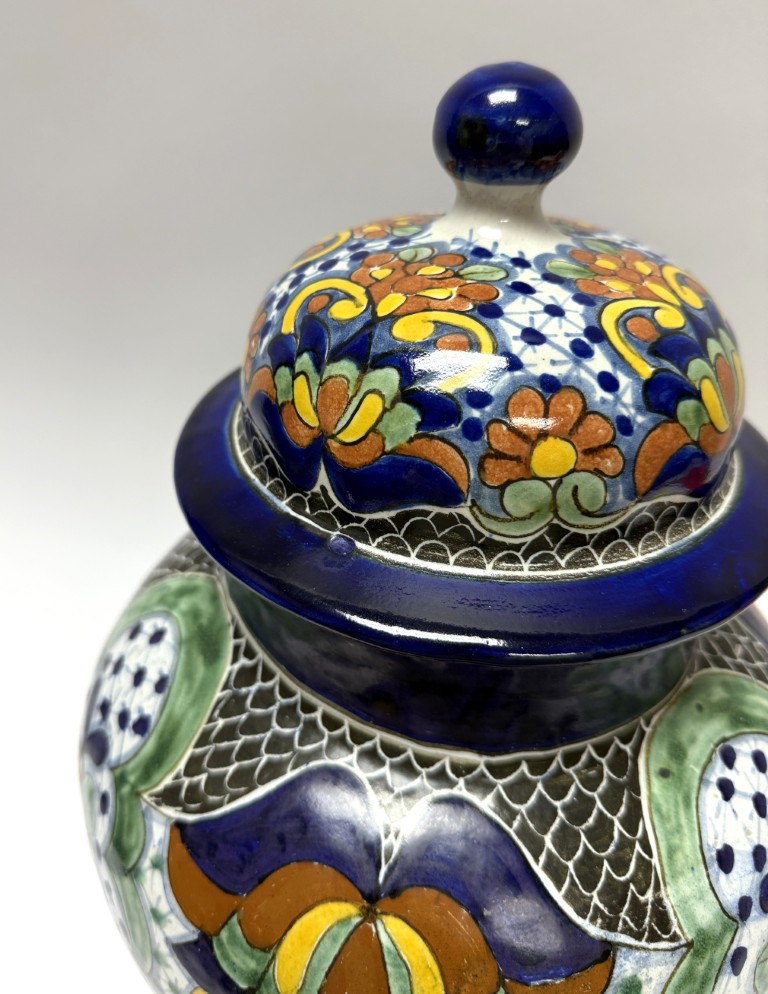 This hand-painted blue Mexican lidded urn features intricate floral and geometric motifs in rich tones of cobalt, green, ochre, and white. Its bold patterning and glossy glaze create a vibrant, traditional statement piece with timeless decorative appeal.