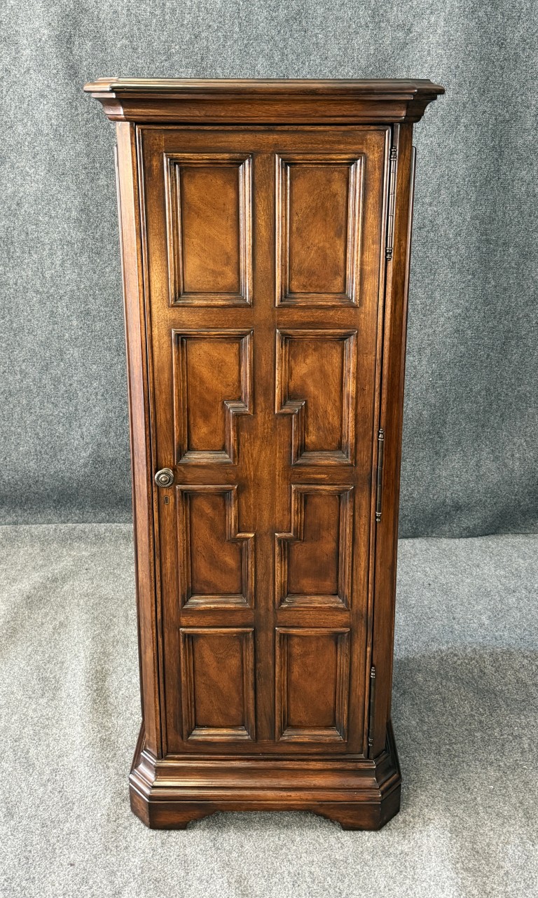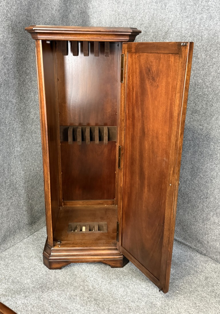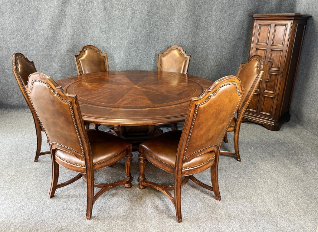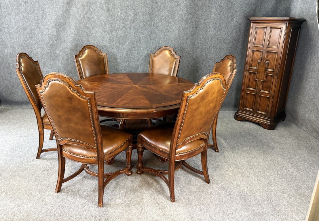 This Haverty’s 8-Piece Flamed Mahogany Round Dining Set showcases exquisite craftsmanship with a radiant sunburst veneer top and richly grained mahogany finish. The six upholstered leather chairs feature arched backs, nailhead trim, and contoured seating for both comfort and elegance. Completing the ensemble is a matching tall cabinet designed specifically to store the leaves, offering refined storage and easy access to expand the diameter of the table from 58 inches to 76.5 inches.