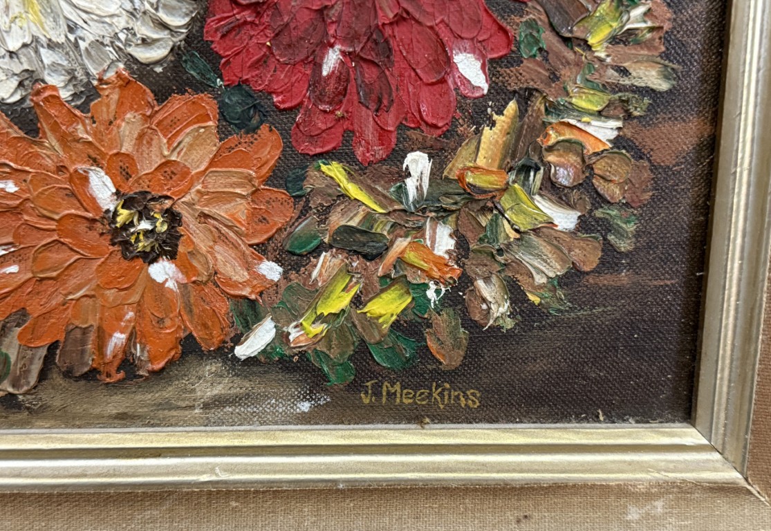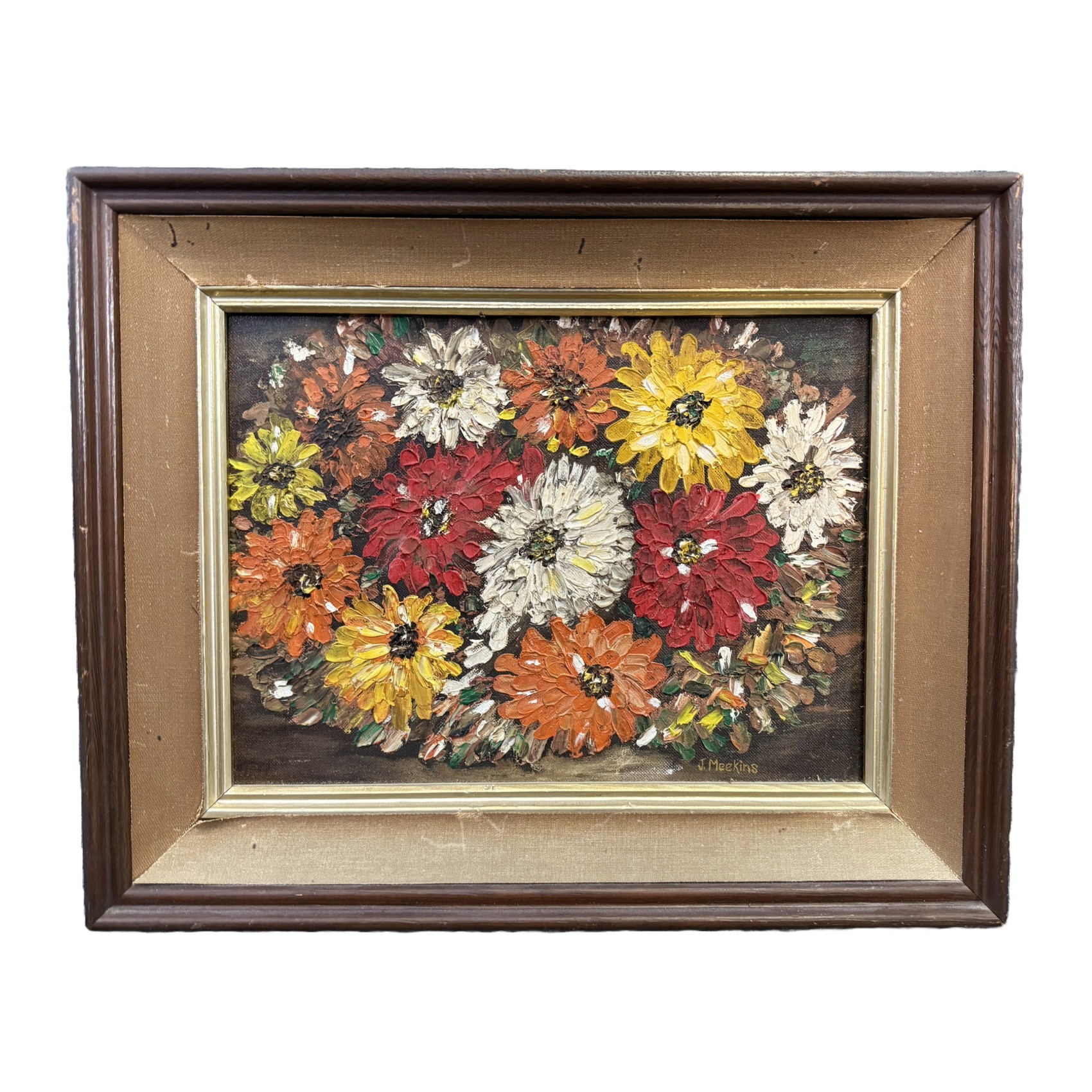 This heavily textured oil on board by Jane Meekins features a vibrant cluster of zinnias in bold red, yellow, orange, and white tones, rendered with rich impasto detail that brings each petal to life.