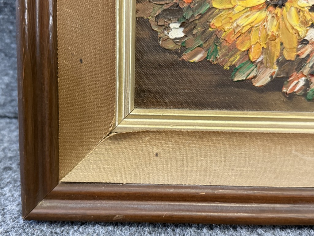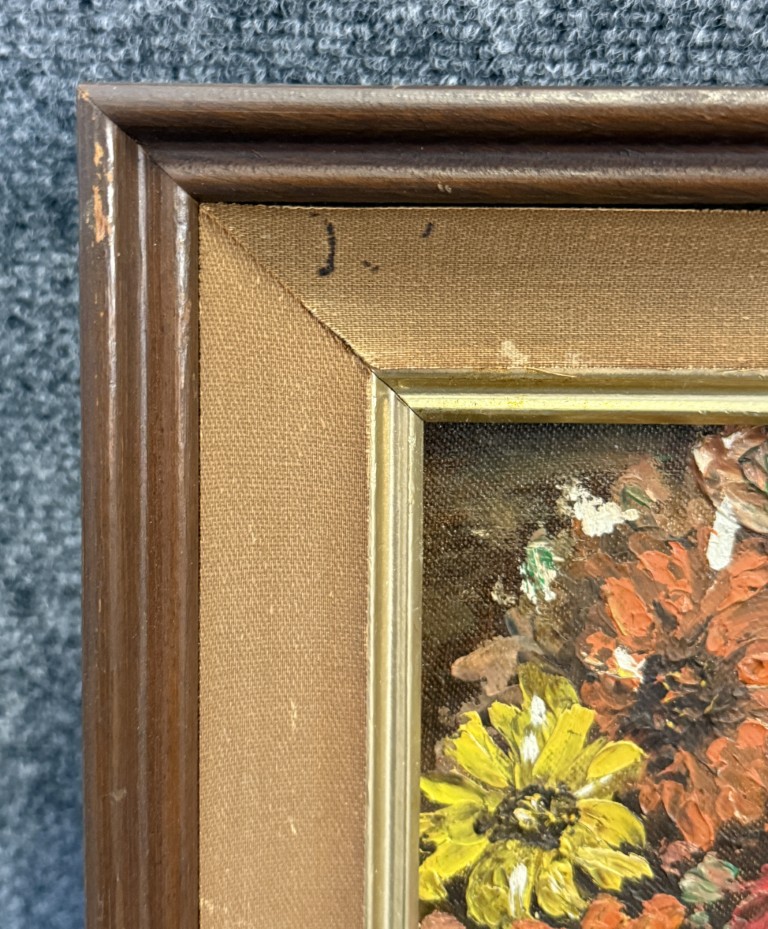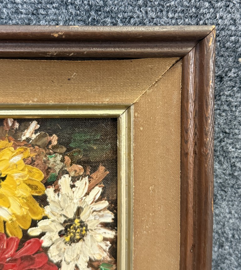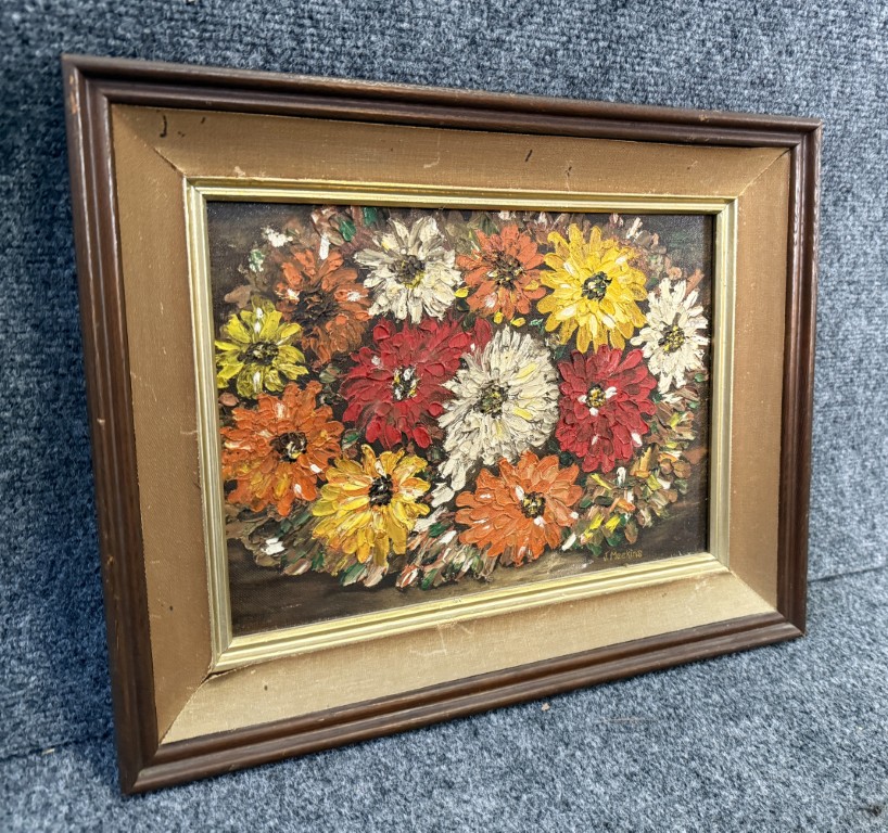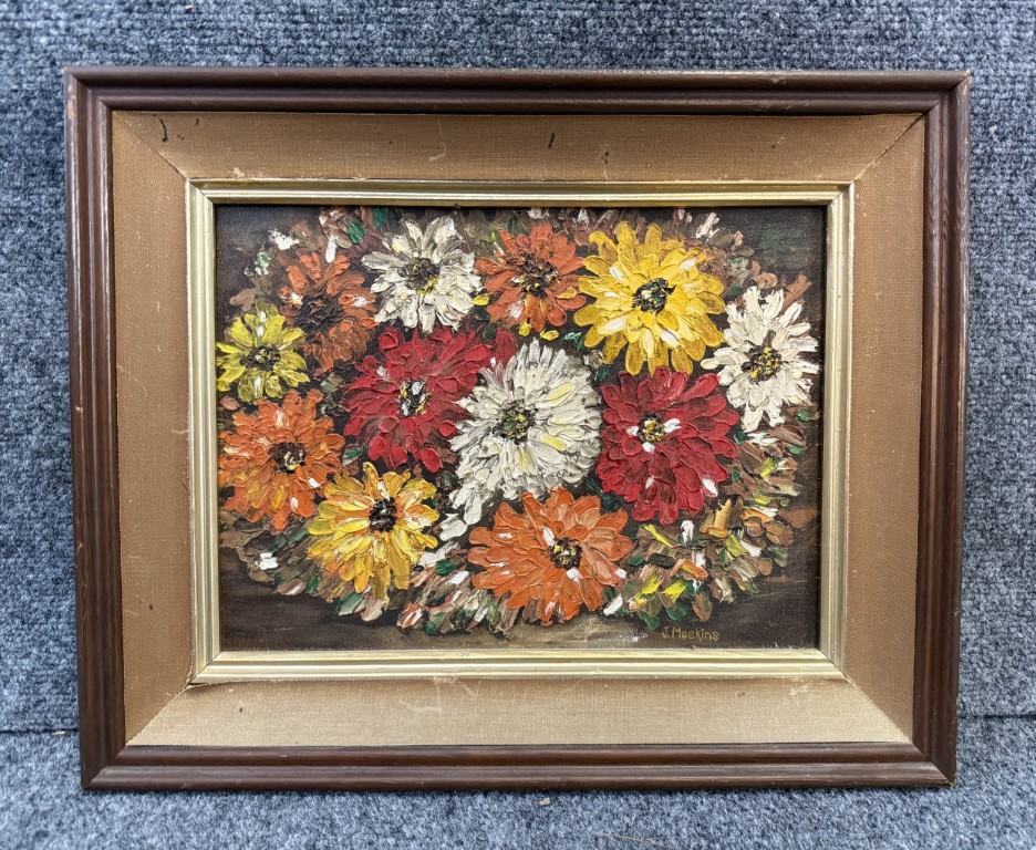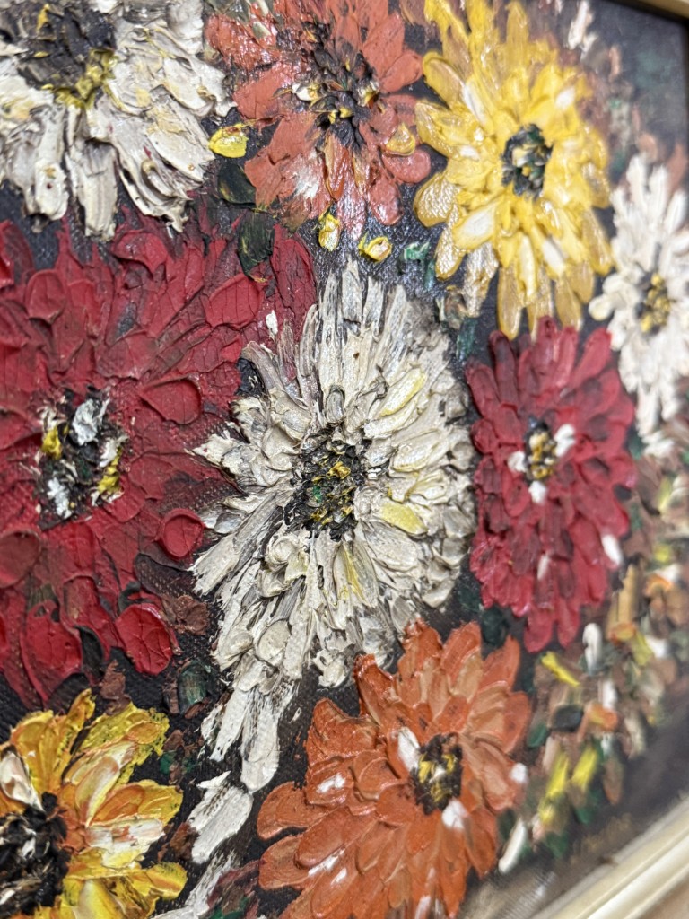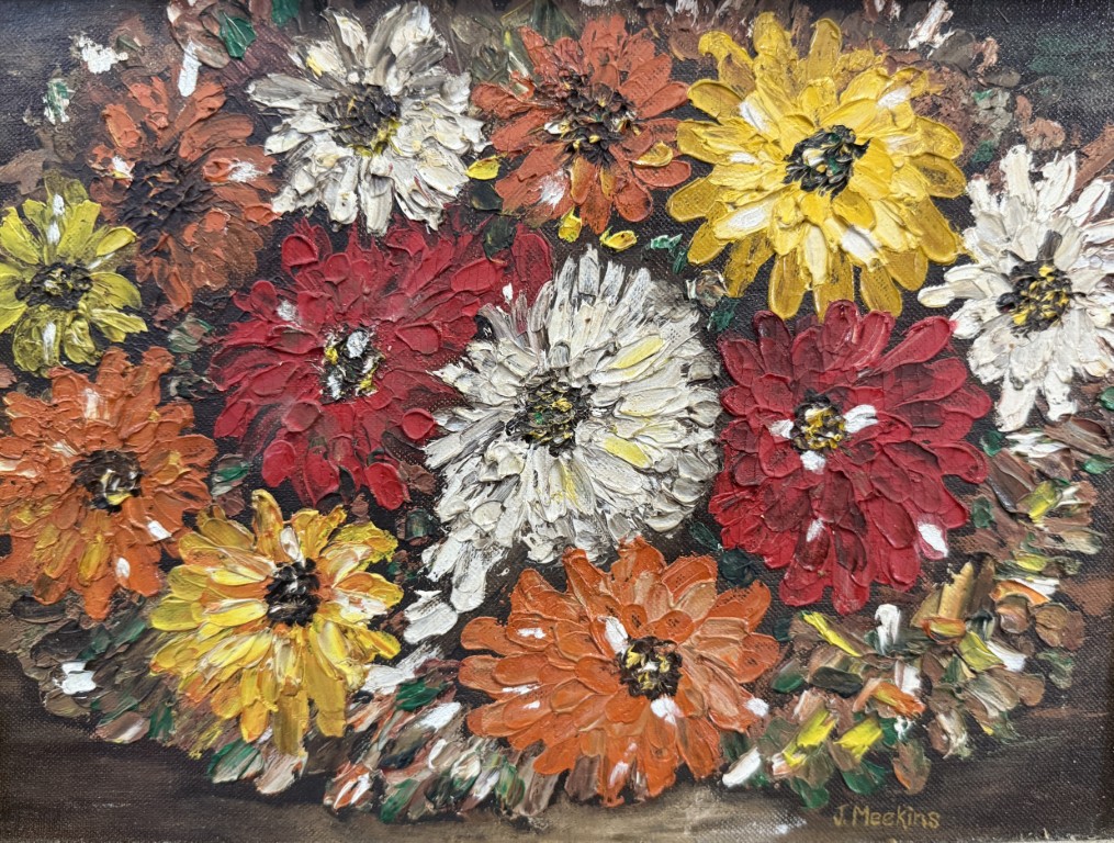 Heavily Textured Oil on Board of Zinnias by Jane Meekins