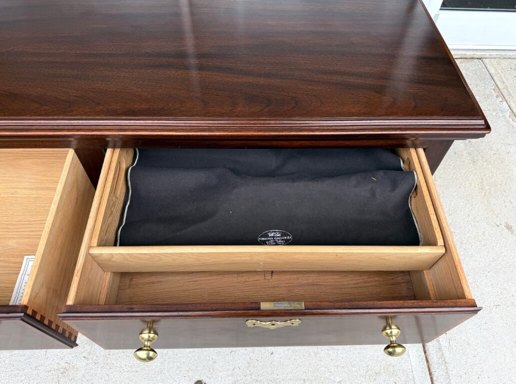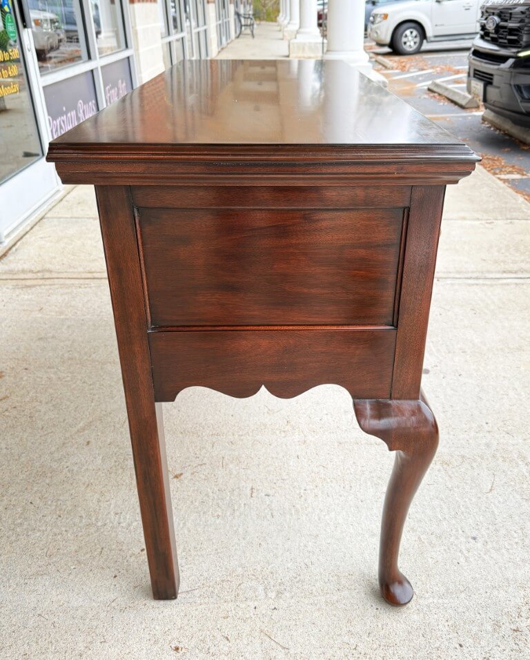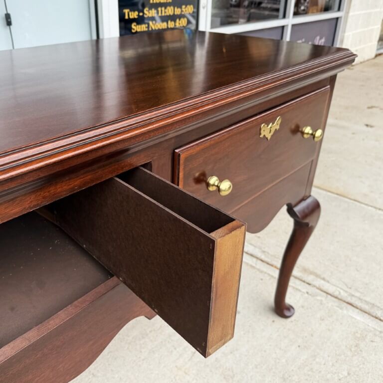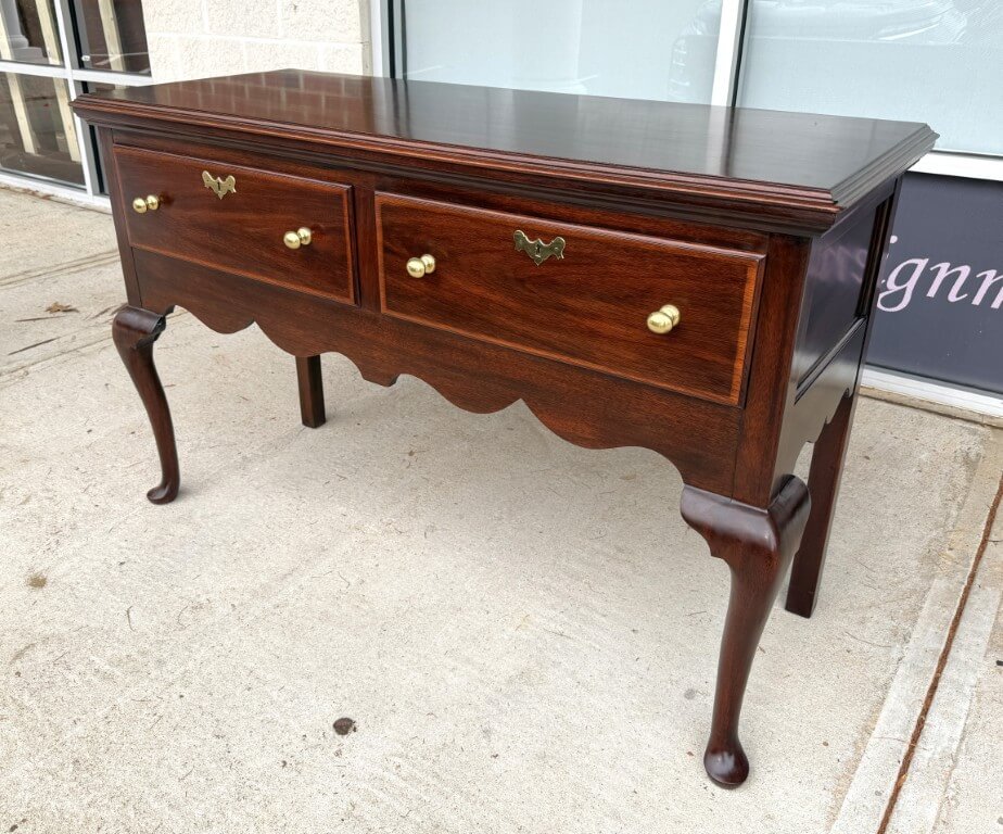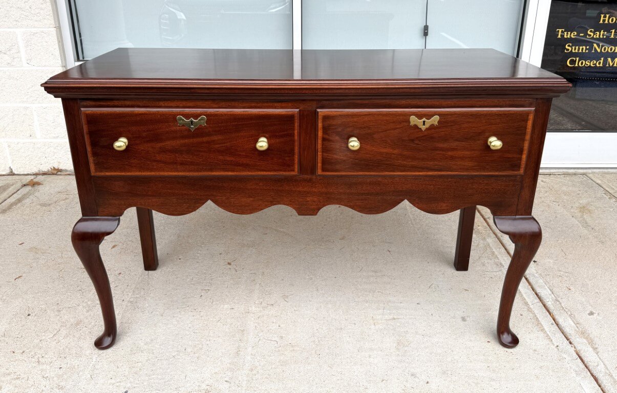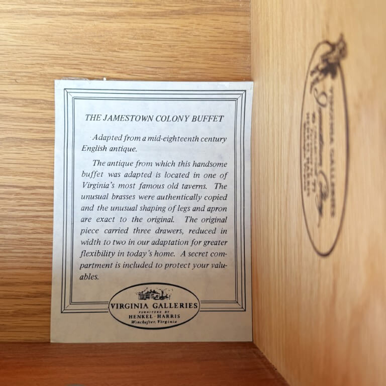 This Henkel Harris Mahogany Jamestown Colony Buffet is adapted from a mid-18th-century English antique and features a rich mahogany finish, Queen Anne legs, and authentically reproduced brass hardware. Its scalloped apron and thoughtfully proportioned two-drawer configuration offer timeless elegance and functional storage for today’s home. Henkel Harris is renowned for its meticulous craftsmanship, American-made heritage, and use of premium solid woods, making their pieces highly sought after by collectors. A cleverly concealed secret compartment hidden between the drawers provides a discreet place to safeguard valuables.