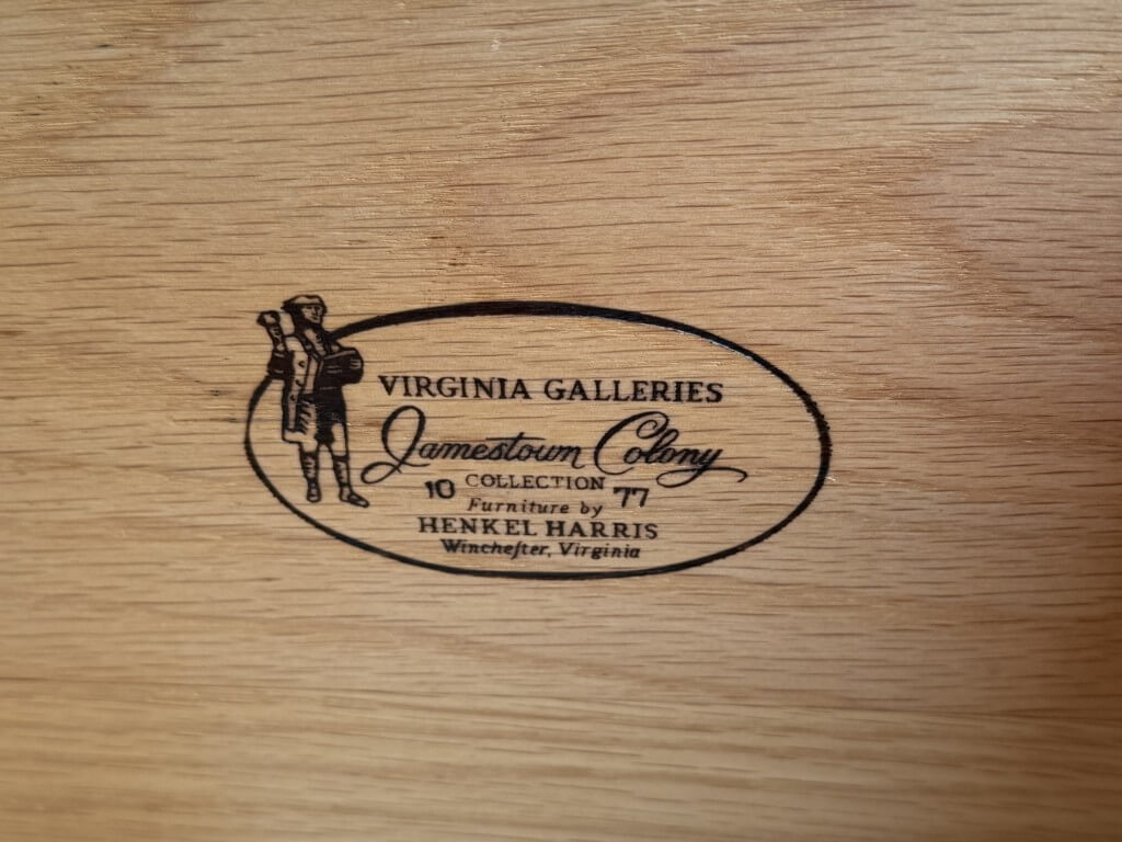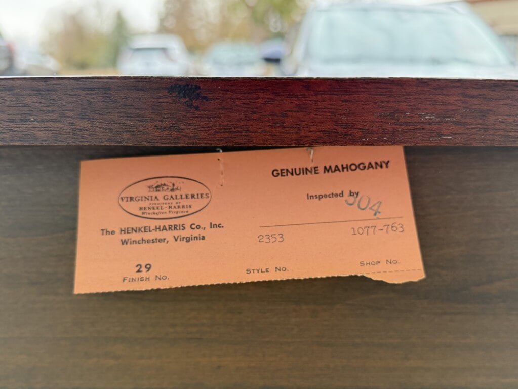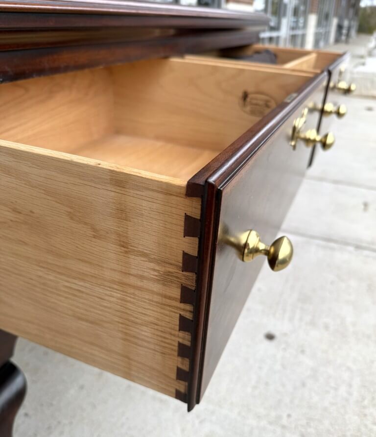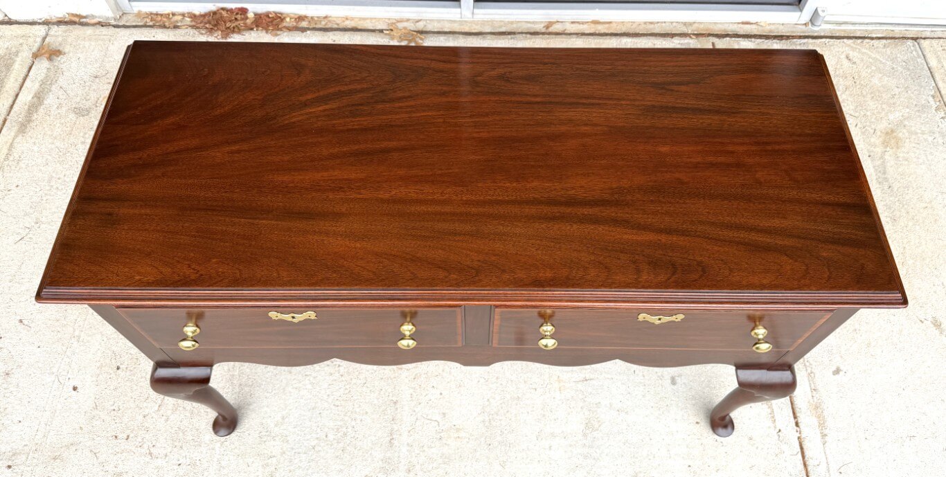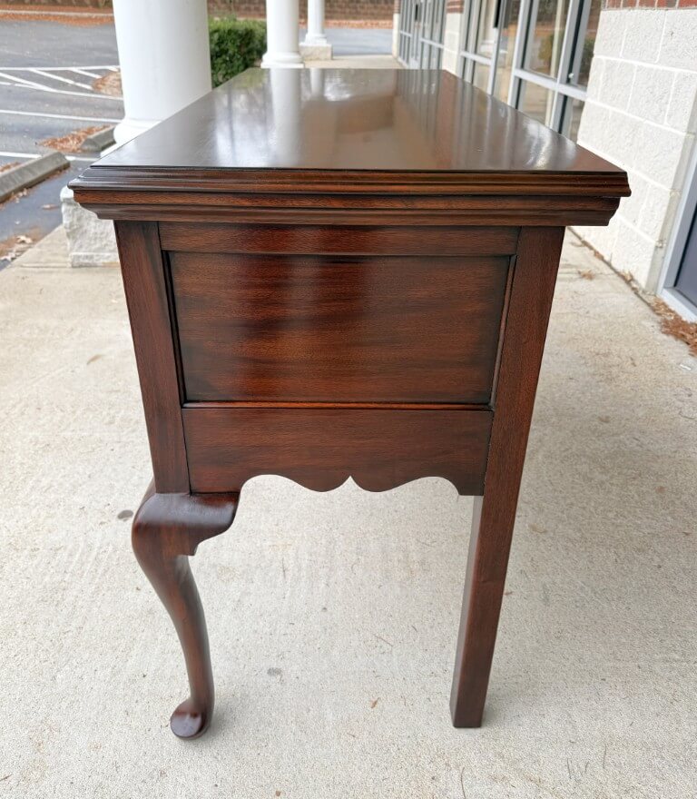 This Henkel Harris Mahogany Jamestown Colony Buffet is adapted from a mid-18th-century English antique and features a rich mahogany finish, Queen Anne legs, and authentically reproduced brass hardware. Its scalloped apron and thoughtfully proportioned two-drawer configuration offer timeless elegance and functional storage for today’s home. Henkel Harris is renowned for its meticulous craftsmanship, American-made heritage, and use of premium solid woods, making their pieces highly sought after by collectors. A cleverly concealed secret compartment hidden between the drawers provides a discreet place to safeguard valuables.