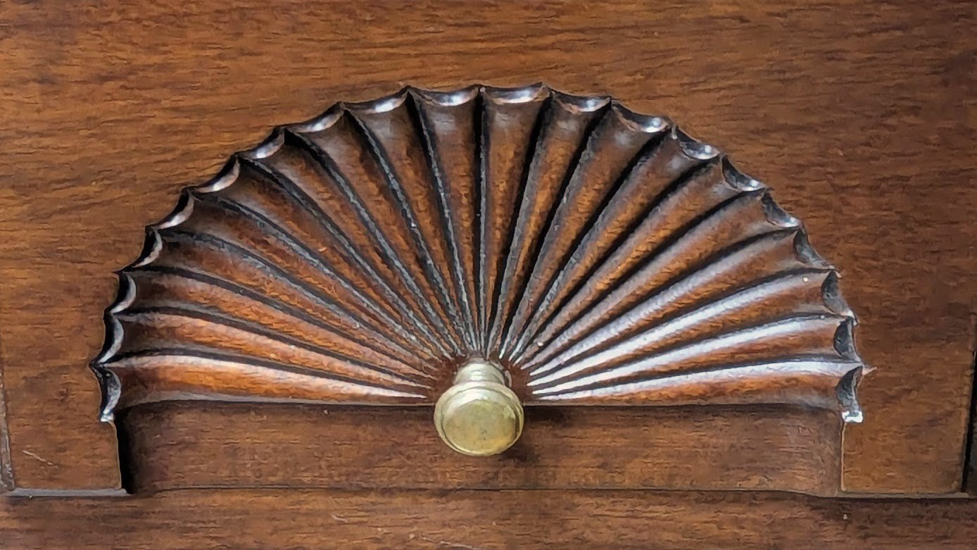 Henkel Harris Mahogany Lowboy [circa 1985] Fashioned in the traditional Queen Anne Style featuring carved fan light and turned finial details. The lowboy has four drawers with dovetailing and working lock resting on pad feet all with the quality and charm you expect from vintage Henkel Harris. Perfect for an entry way, end table or nightstand