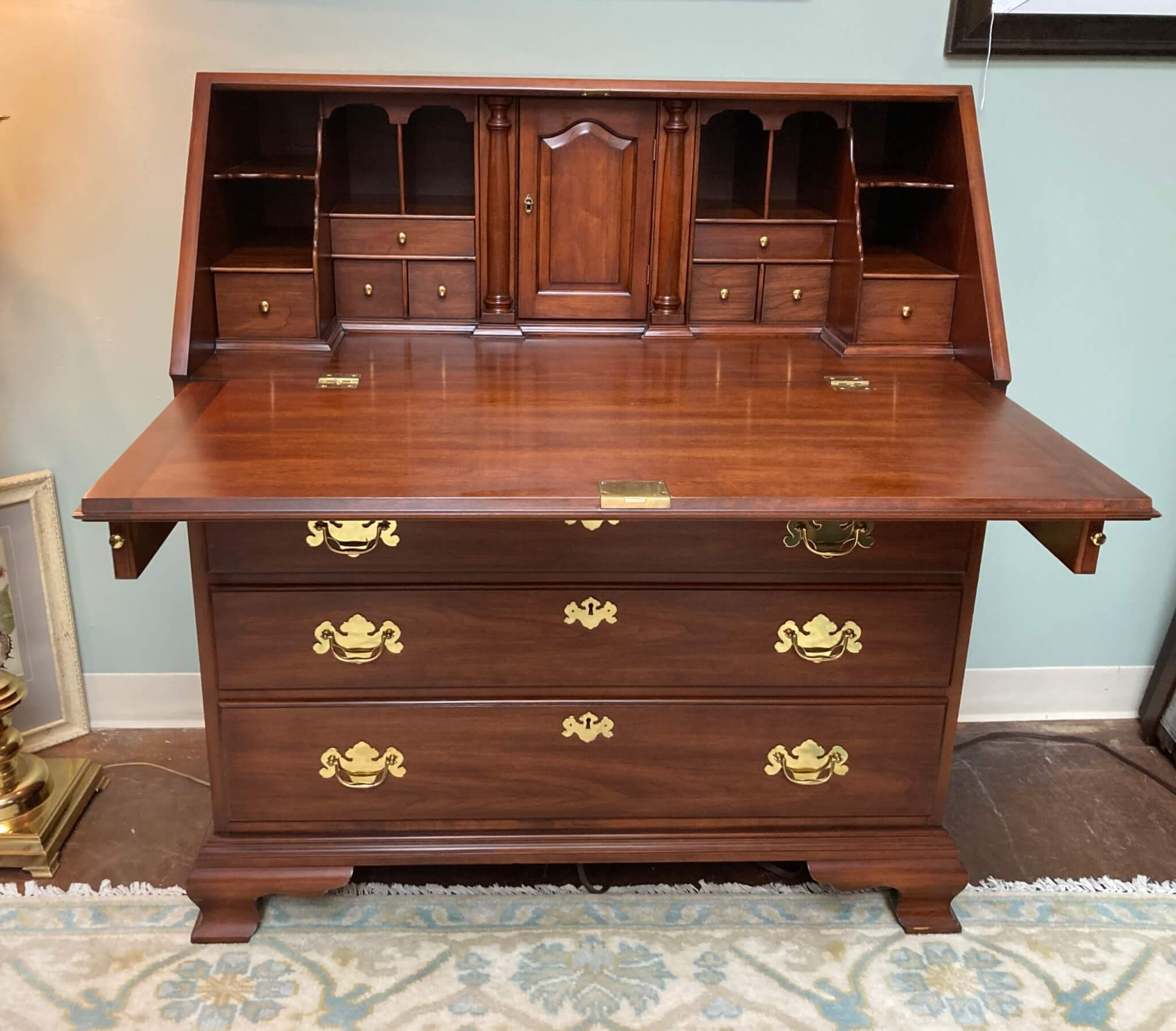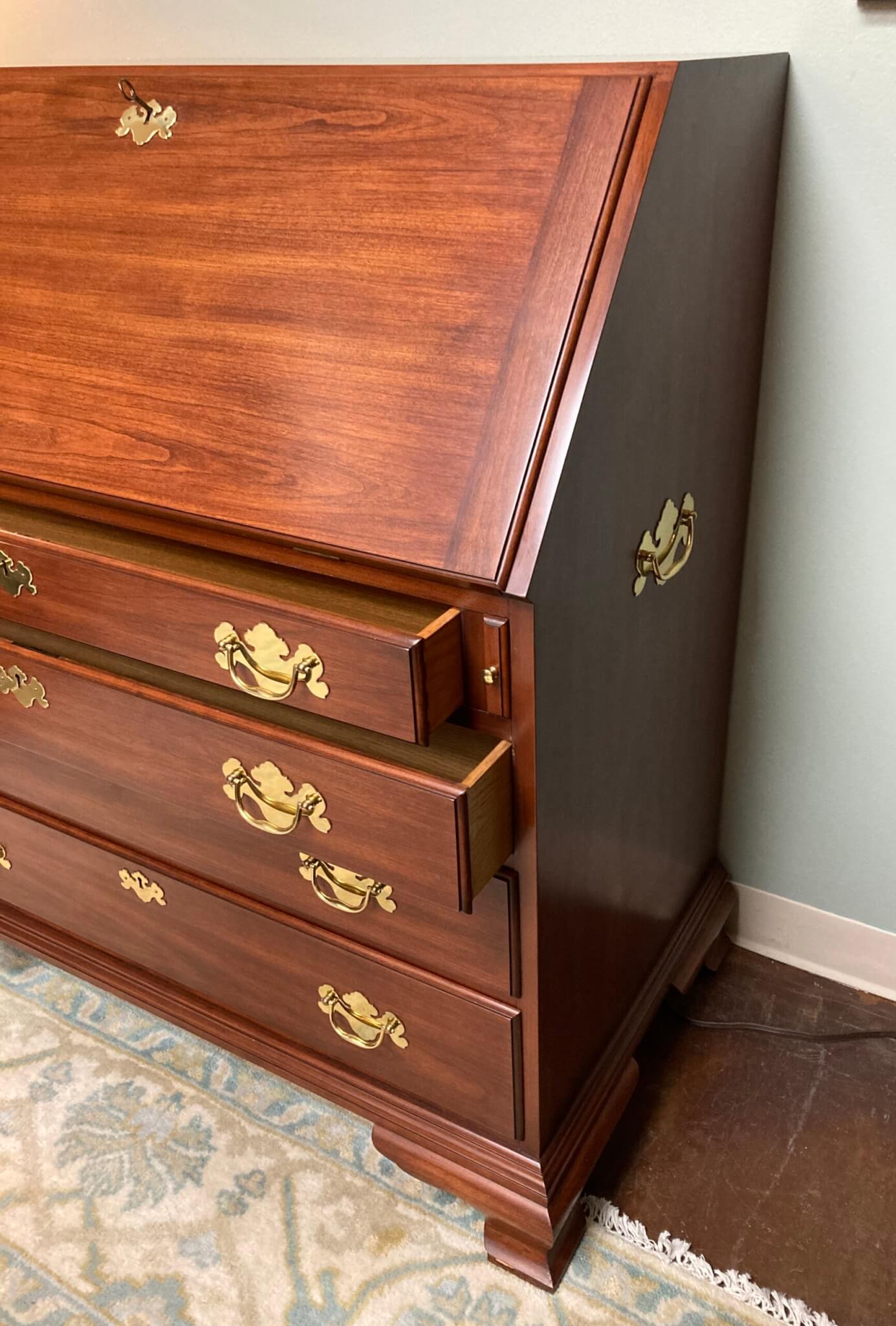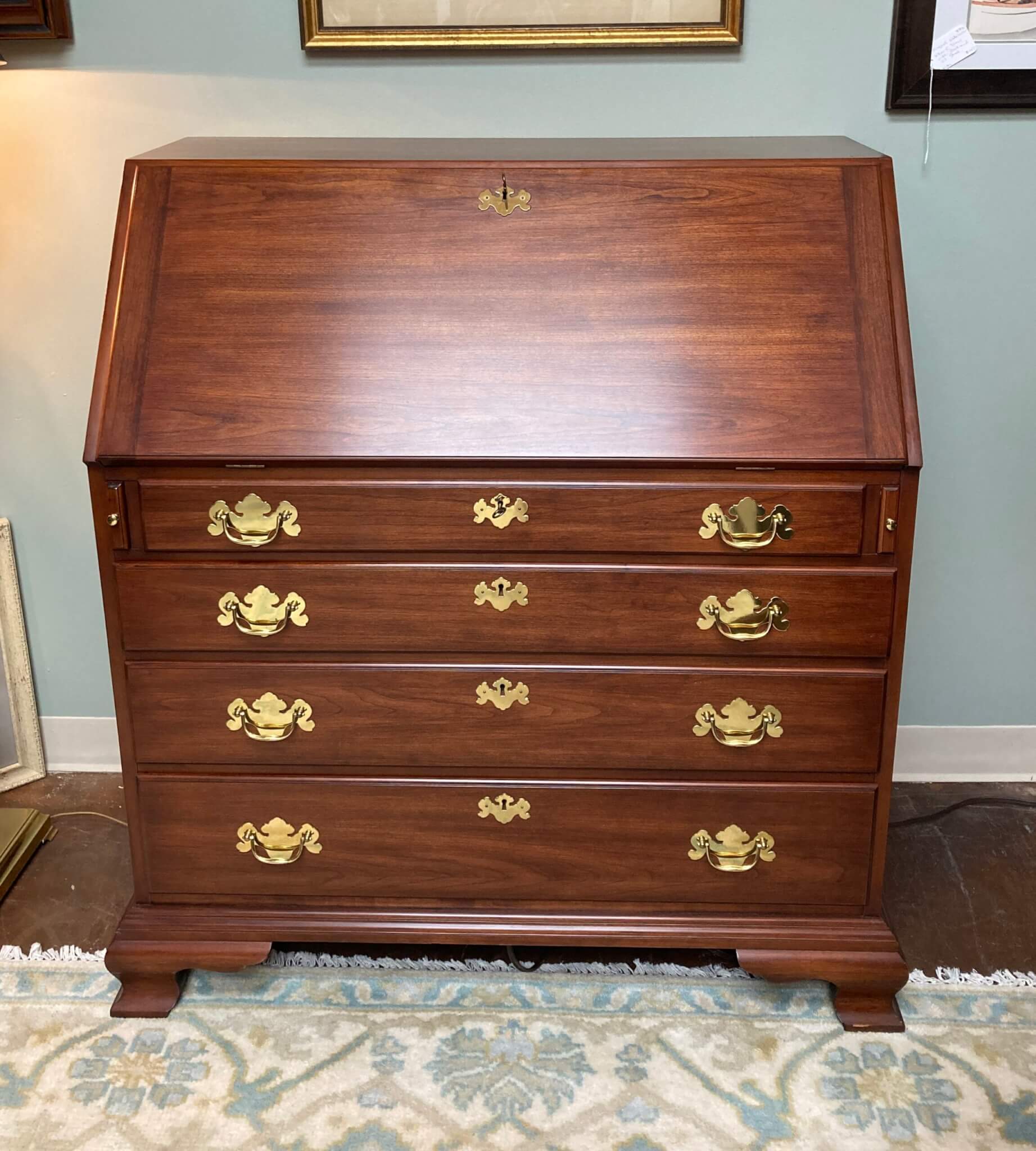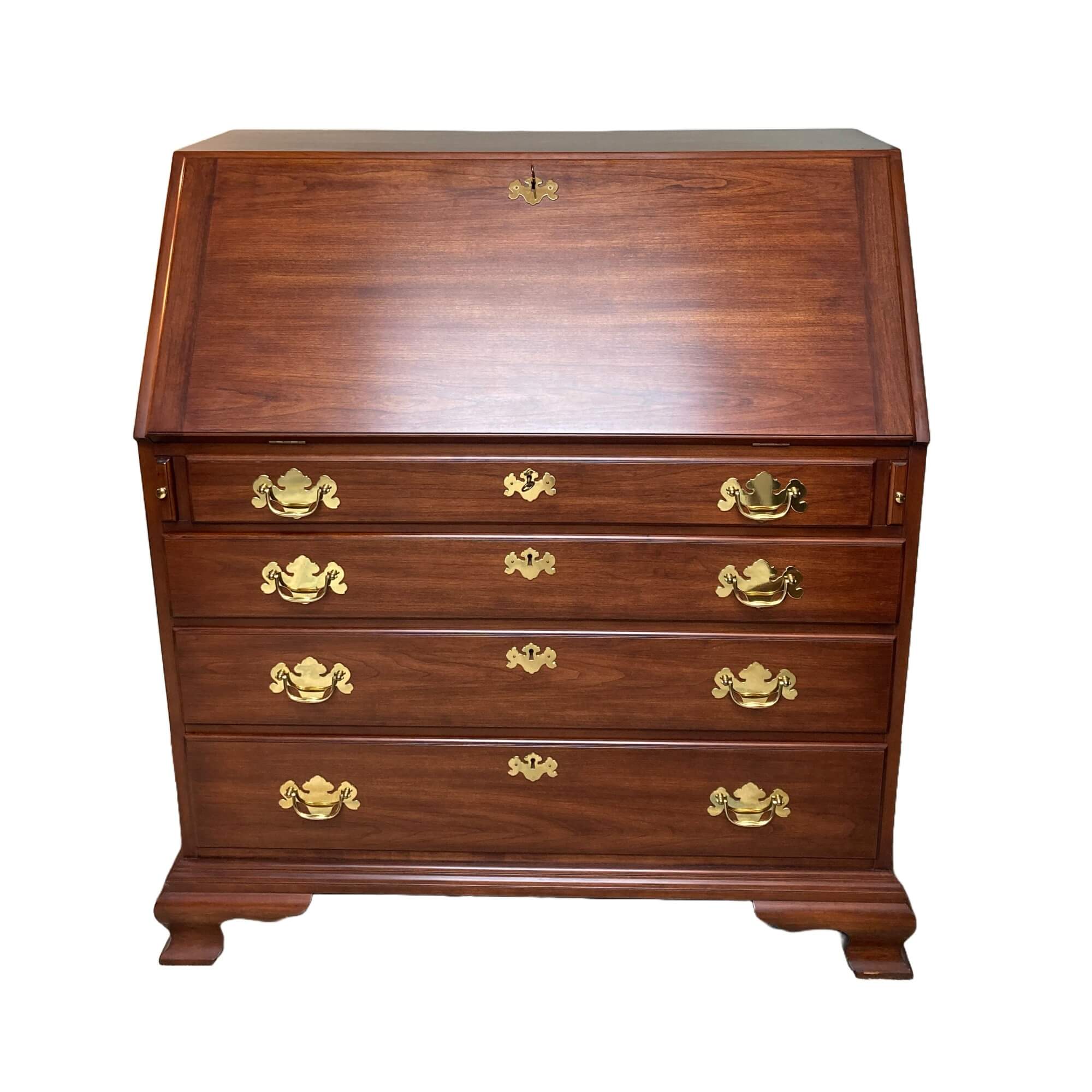 Henkel Harris Solid Wild Black Cherry Slant Drop-Front Desk #6001, in ‘Winchester Cherry’ finish #24. The drop front rests on two pull out slides when opened and reveals several drawers and a door. The interior center section with the door pulls out via a secret latch, and two hidden drawers can then be accessed via yet two other secret latches. Below the slant top are 4 full lockable drawers, all dovetailed and with solid brass hardware. Desk includes one internal working key and two external working keys. The desk has ogee bracket feet and decorative brass side handles.