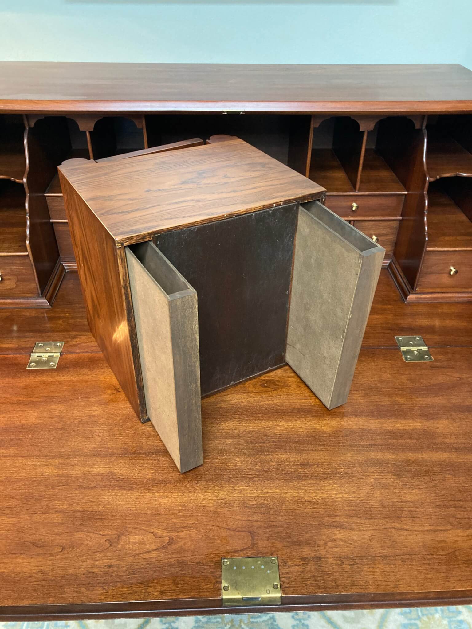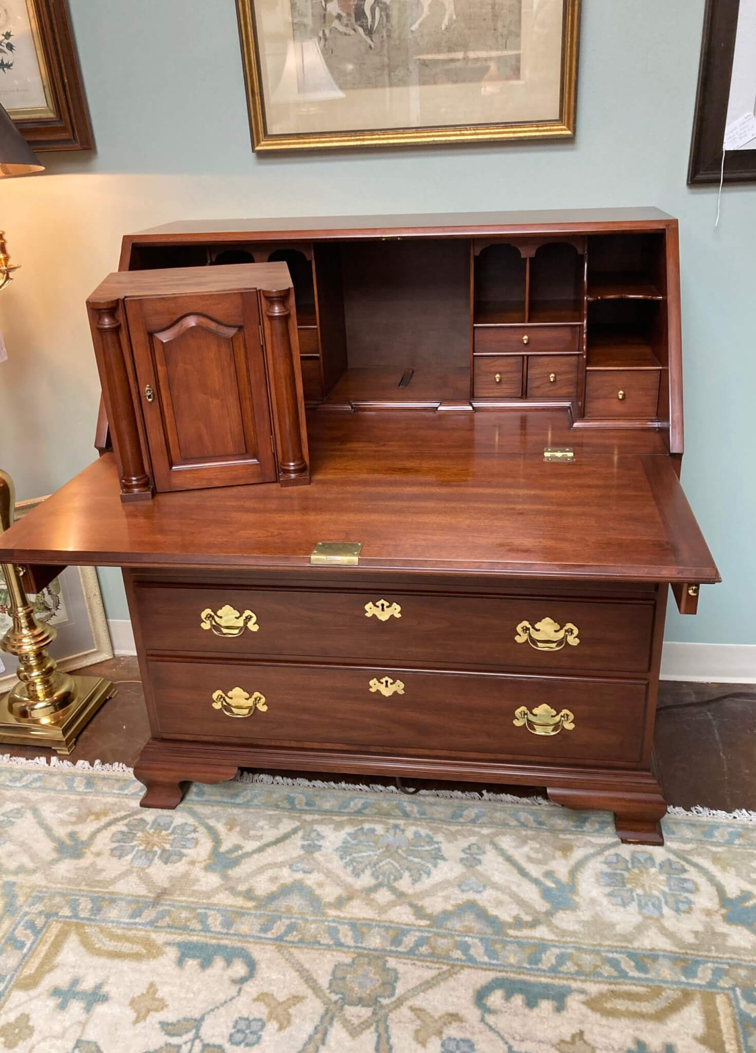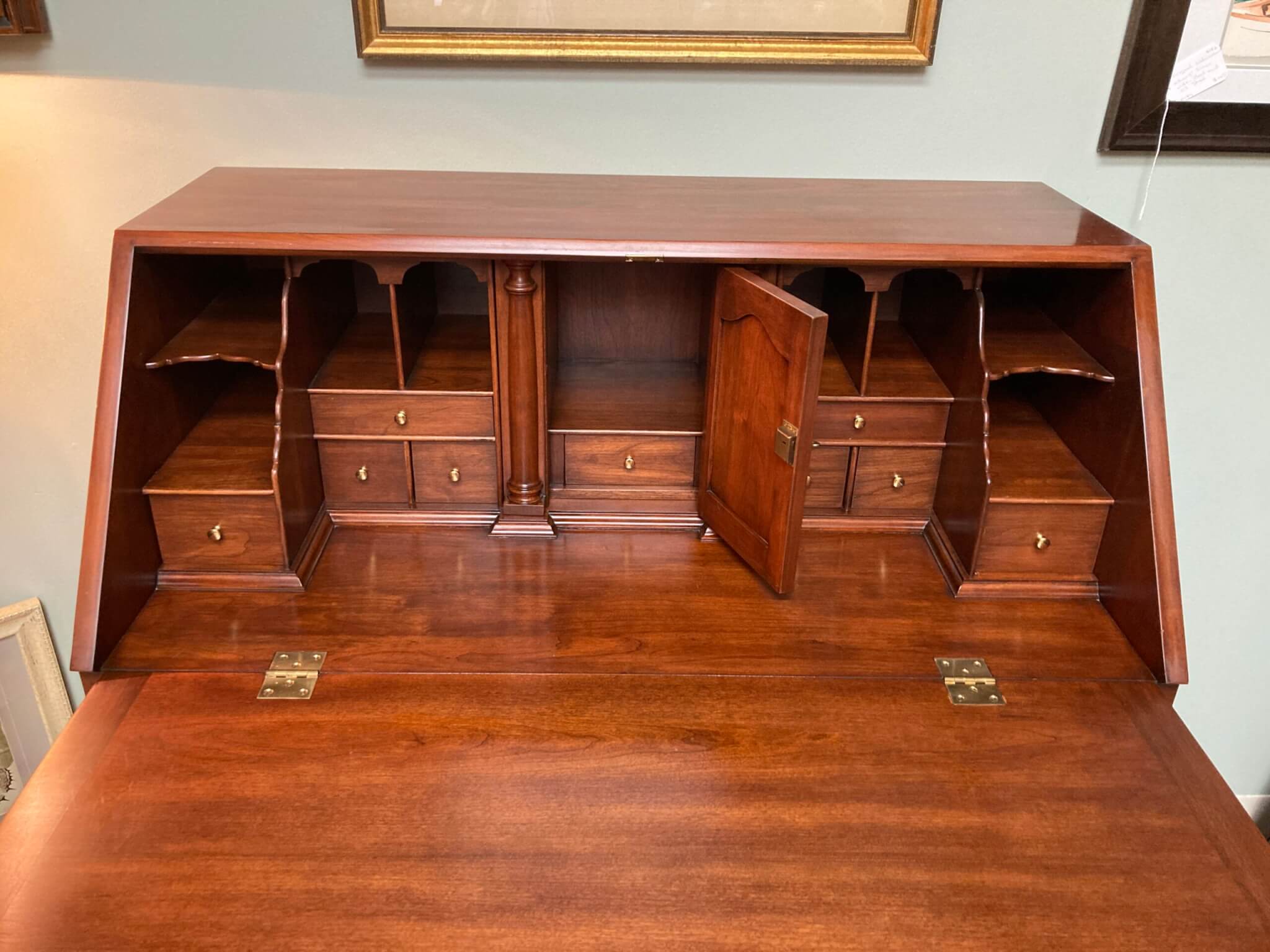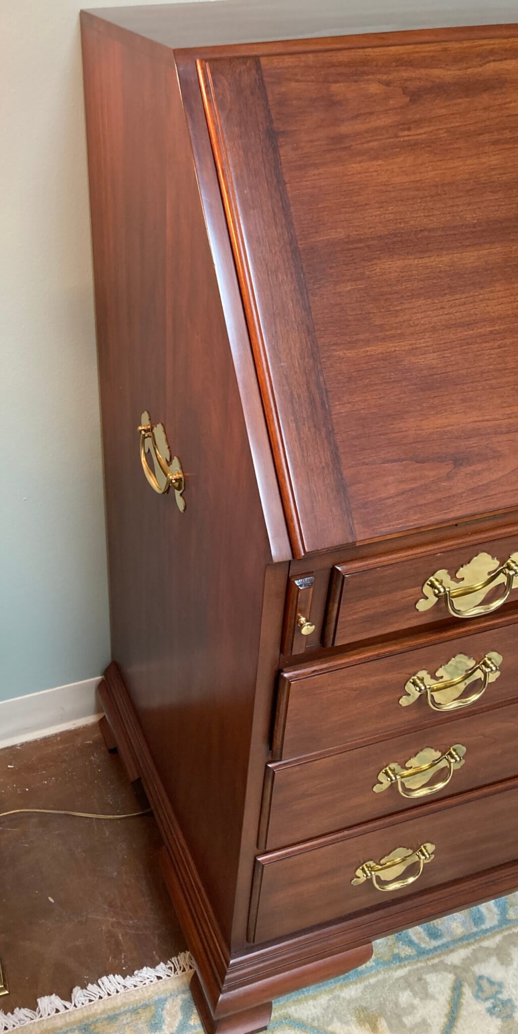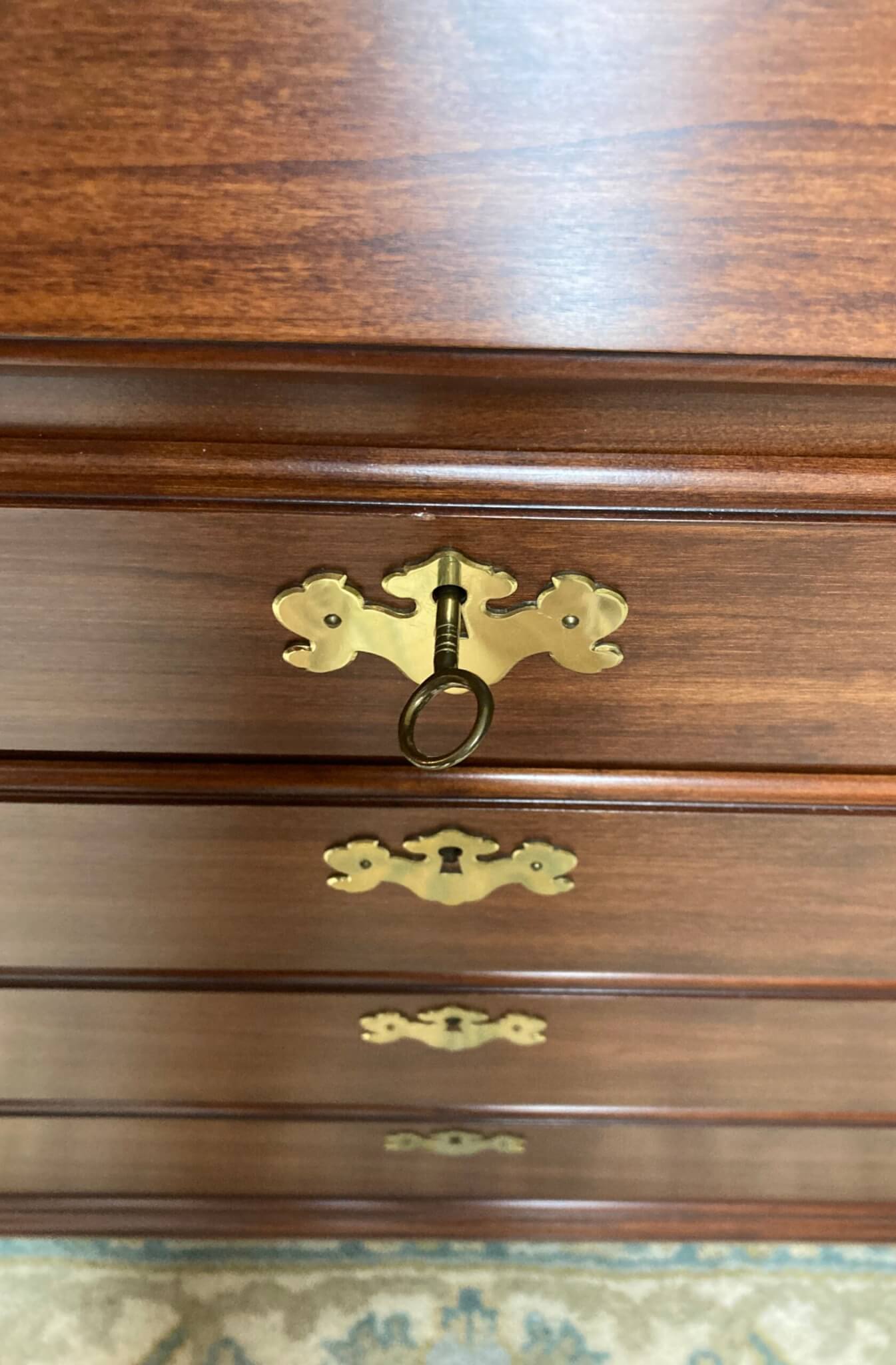 Henkel Harris Solid Wild Black Cherry Slant Drop-Front Desk #6001, in ‘Winchester Cherry’ finish #24. The drop front rests on two pull out slides when opened and reveals several drawers and a door. The interior center section with the door pulls out via a secret latch, and two hidden drawers can then be accessed via yet two other secret latches. Below the slant top are 4 full lockable drawers, all dovetailed and with solid brass hardware. Desk includes one internal working key and two external working keys. The desk has ogee bracket feet and decorative brass side handles.