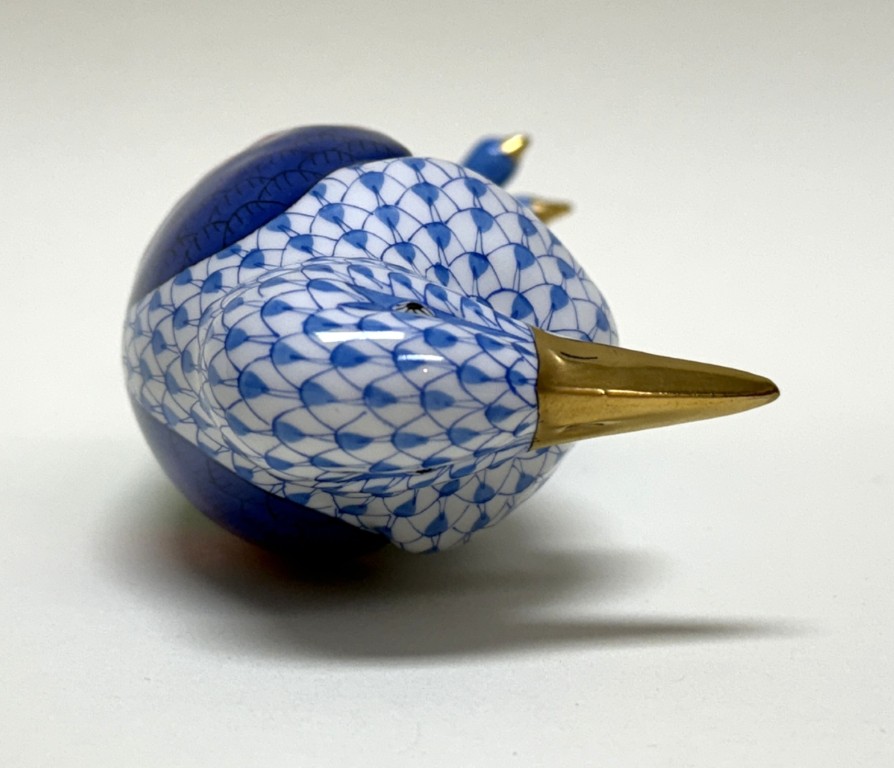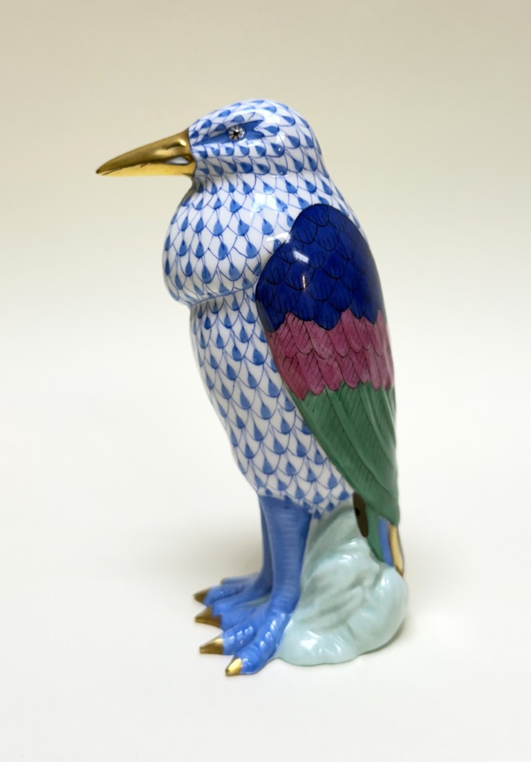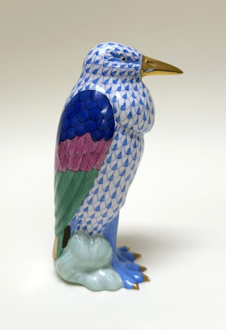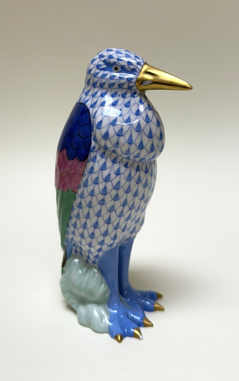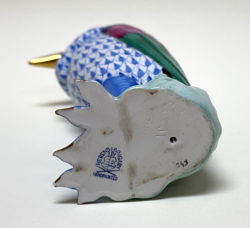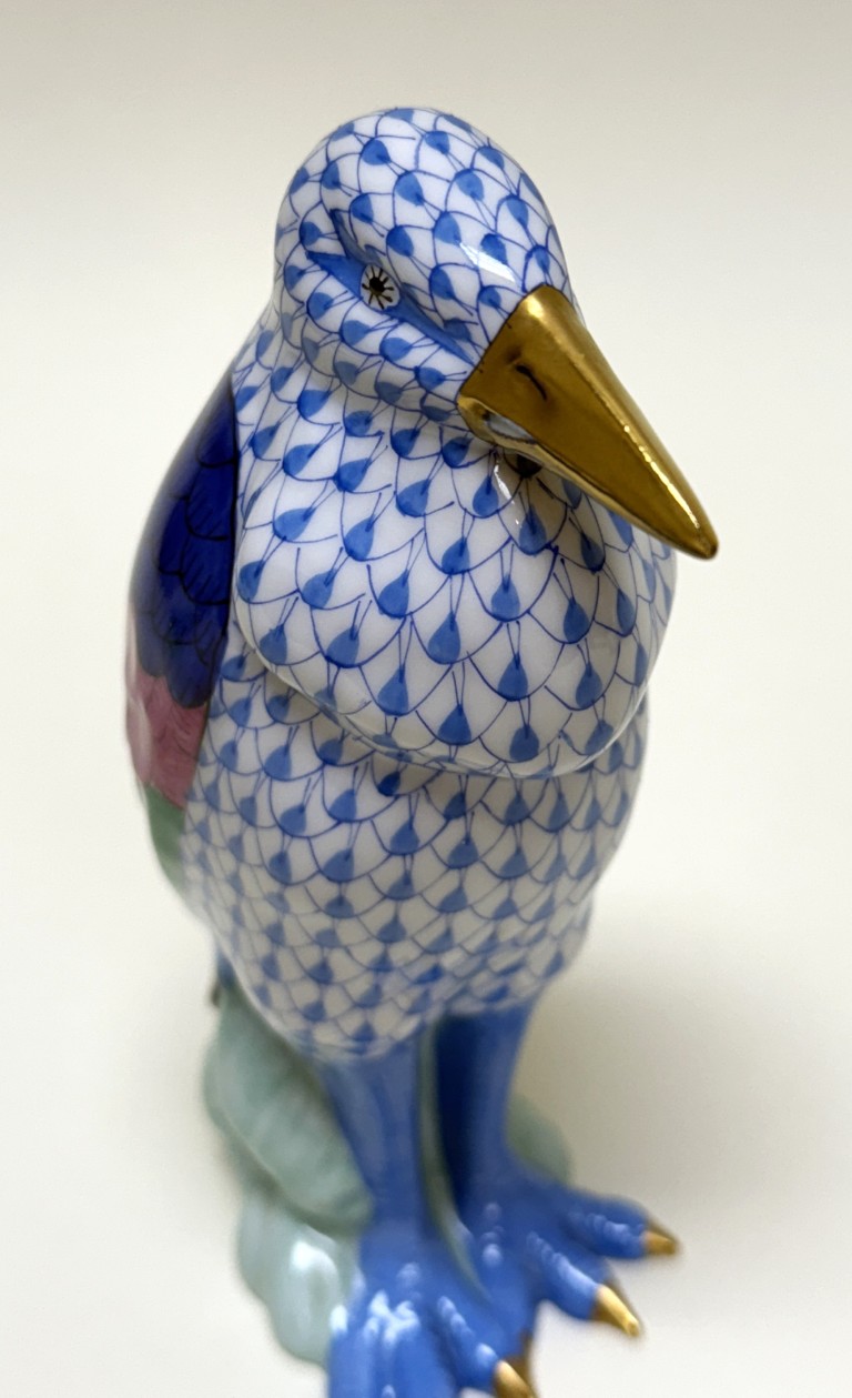 This Herend hand-painted Marabou Bird No. 5317 in blue showcases the brand’s signature fishnet pattern, accented by vibrant green, pink, and cobalt plumage with gleaming 24k gold details. A testament to Herend’s centuries-old artistry and enduring collectability, this exquisite porcelain figure exemplifies the refinement and craftsmanship cherished by collectors worldwide.