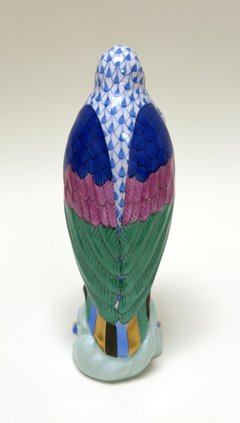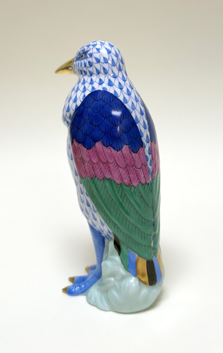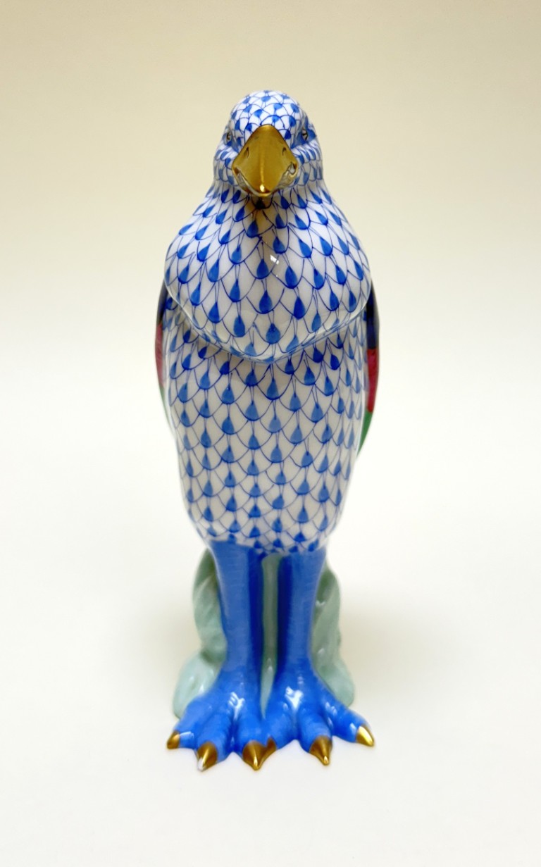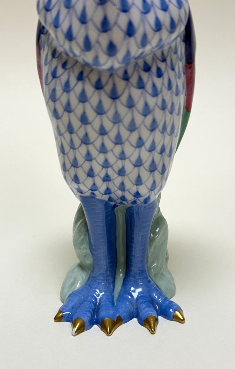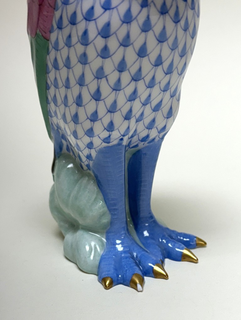 This Herend hand-painted Marabou Bird No. 5317 in blue showcases the brand’s signature fishnet pattern, accented by vibrant green, pink, and cobalt plumage with gleaming 24k gold details. A testament to Herend’s centuries-old artistry and enduring collectability, this exquisite porcelain figure exemplifies the refinement and craftsmanship cherished by collectors worldwide.