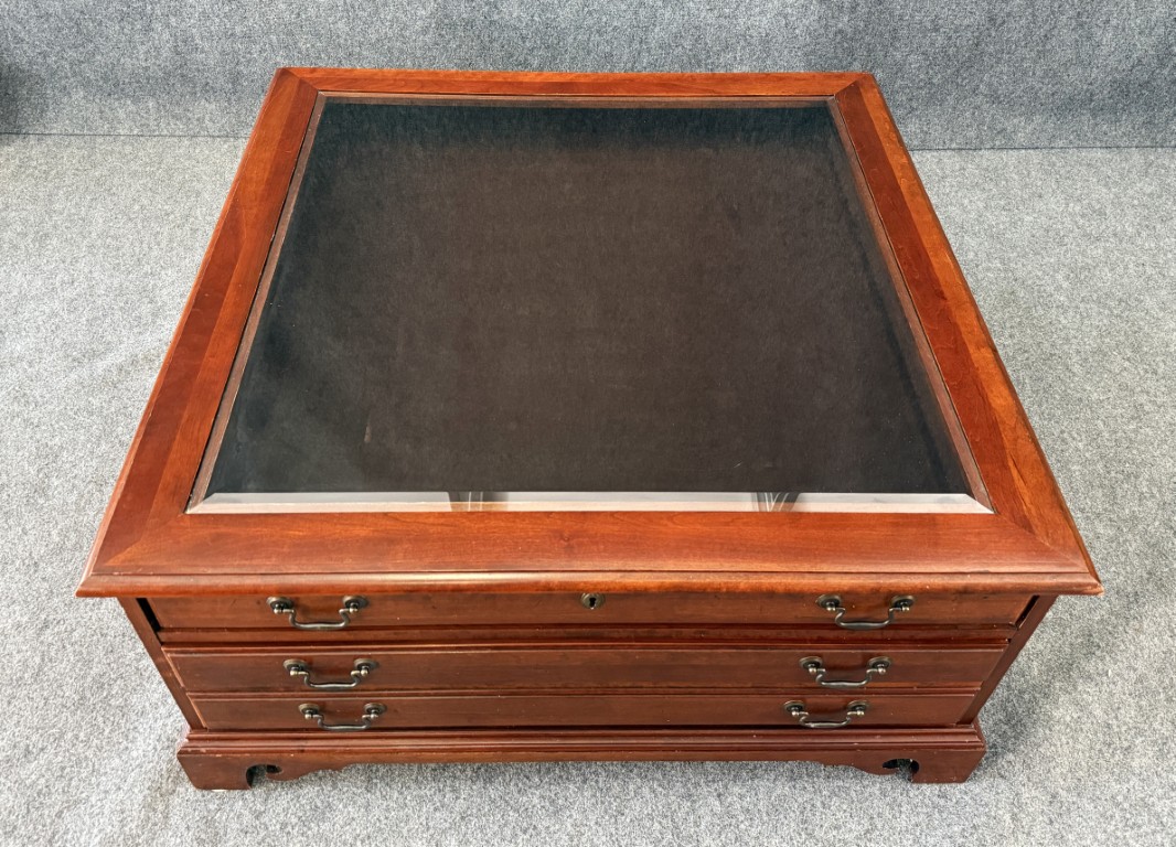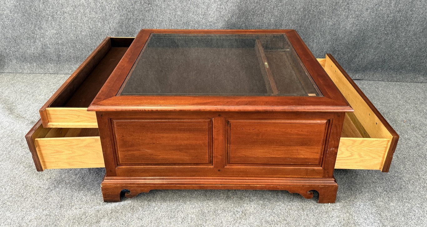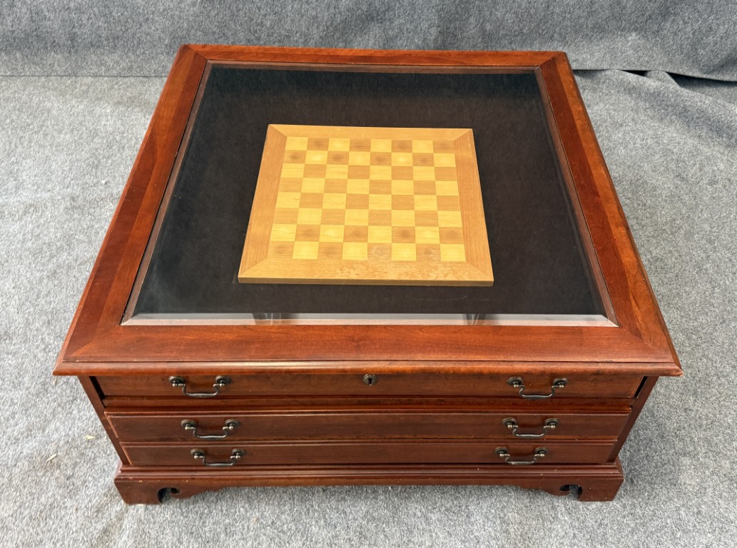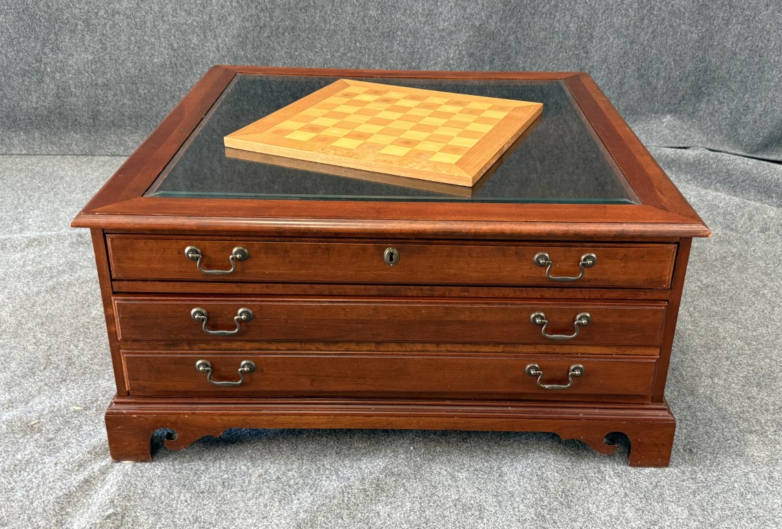 This Hooker Furniture curio coffee table features a glass display top, rich wood finish, and multiple drawers that offer both storage and visual interest. It includes a removable wooden chess board that fits neatly under the glass, making it a functional centerpiece for game nights as well as everyday living.