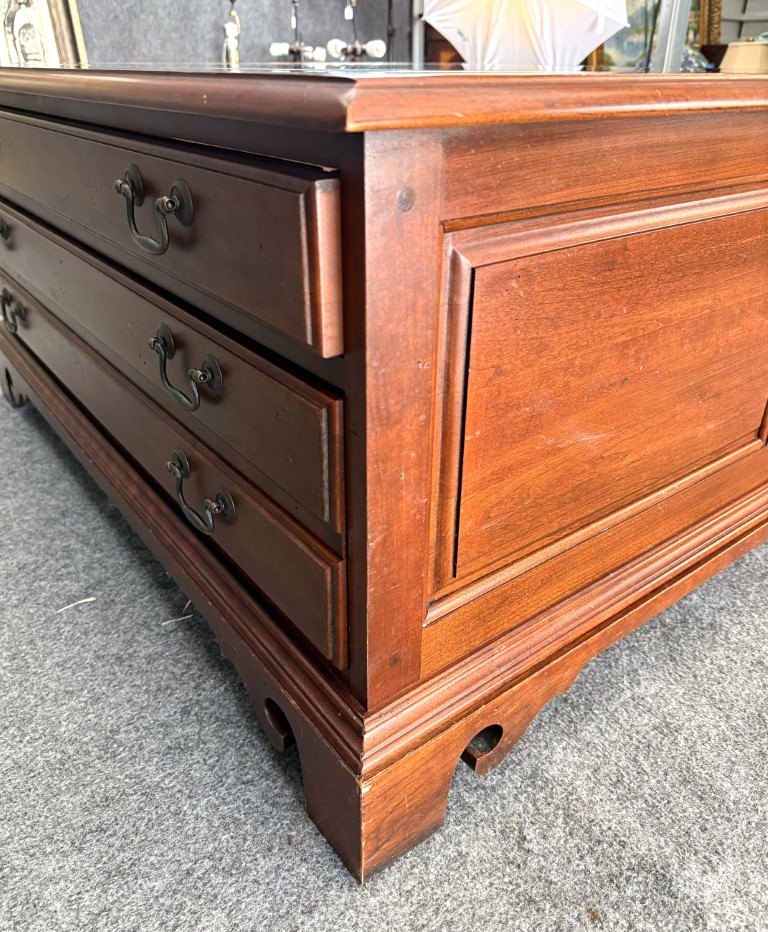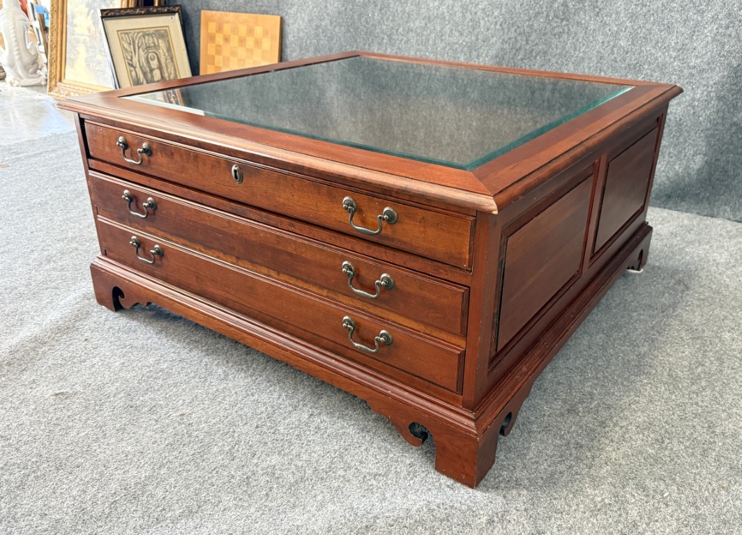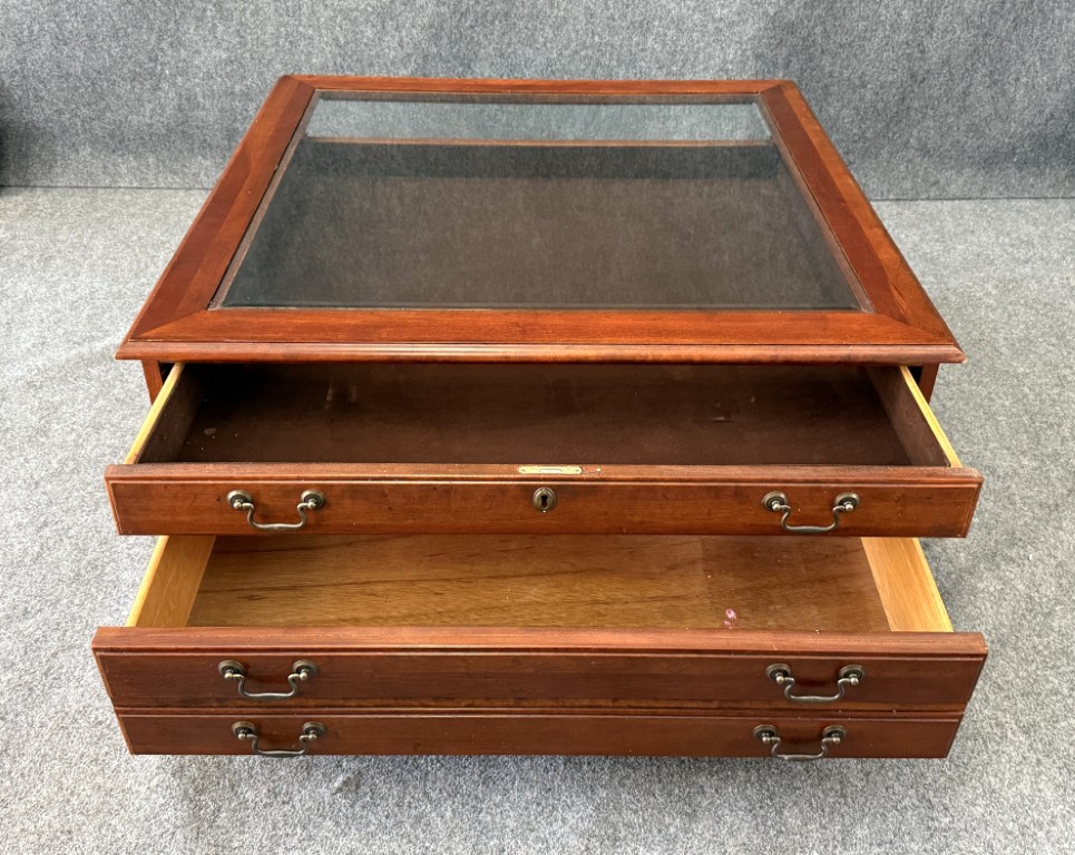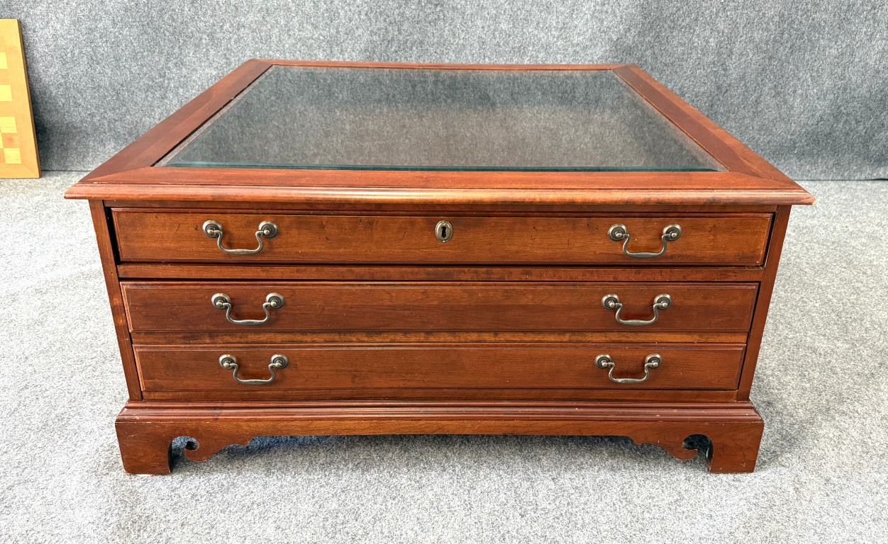 This Hooker Furniture curio coffee table features a glass display top, rich wood finish, and multiple drawers that offer both storage and visual interest. It includes a removable wooden chess board that fits neatly under the glass, making it a functional centerpiece for game nights as well as everyday living.