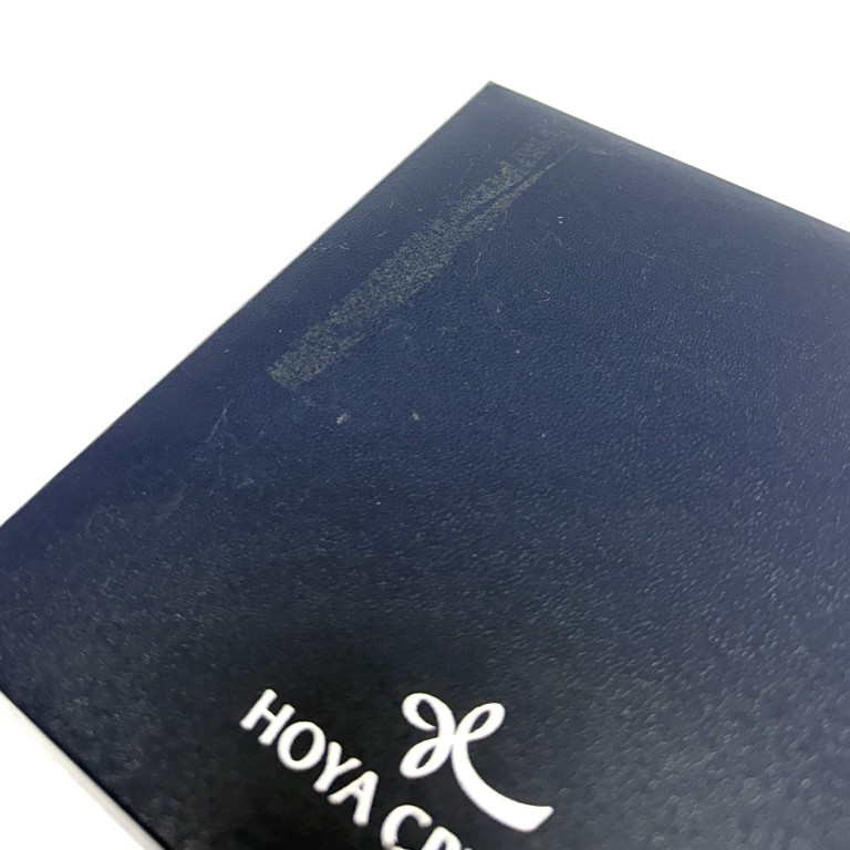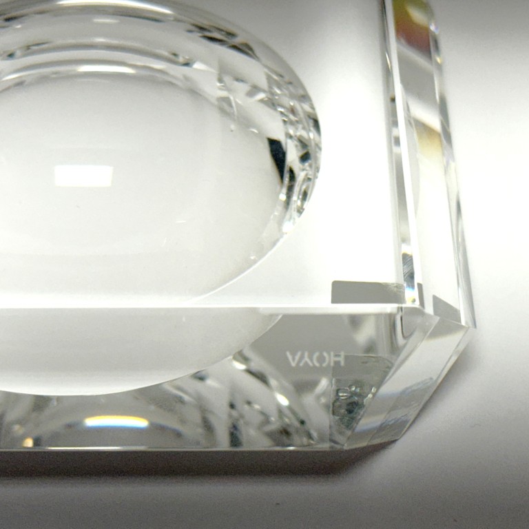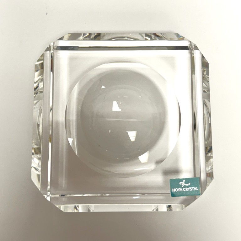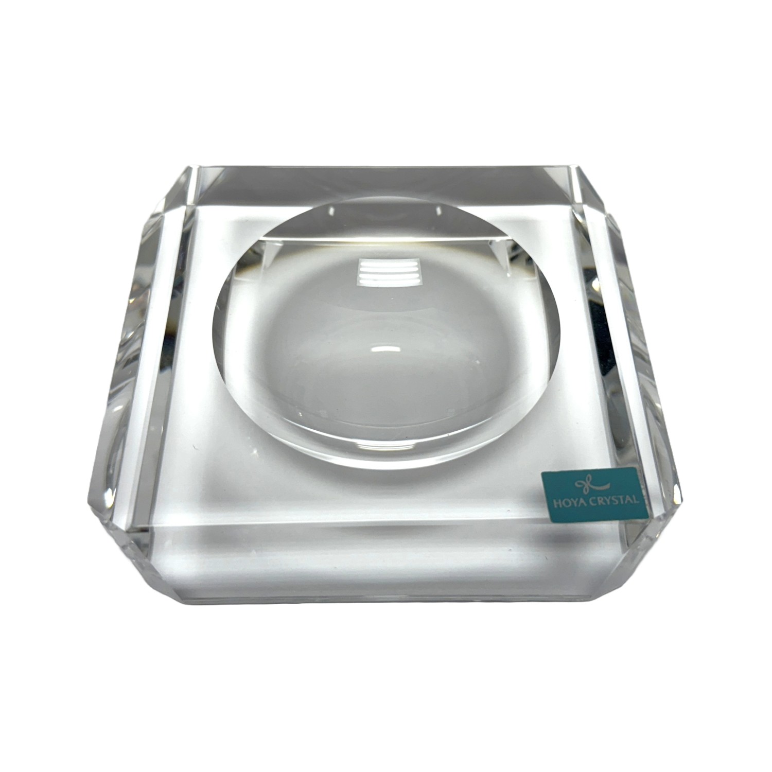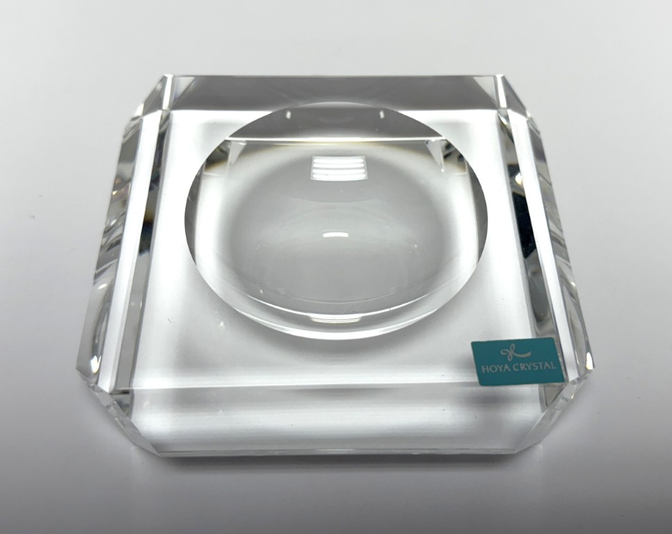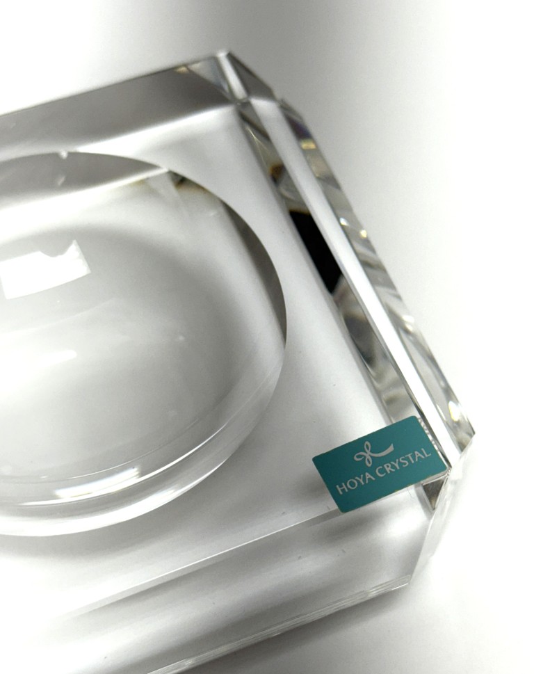 This Hoya Crystal desk accessory features a sleek, architectural design with precision-cut crystal and a recessed circular well, showcasing exceptional clarity and light refraction. New in box, it offers a refined modern accent ideal for a desk, office, or minimalist interior display.
