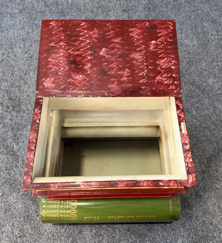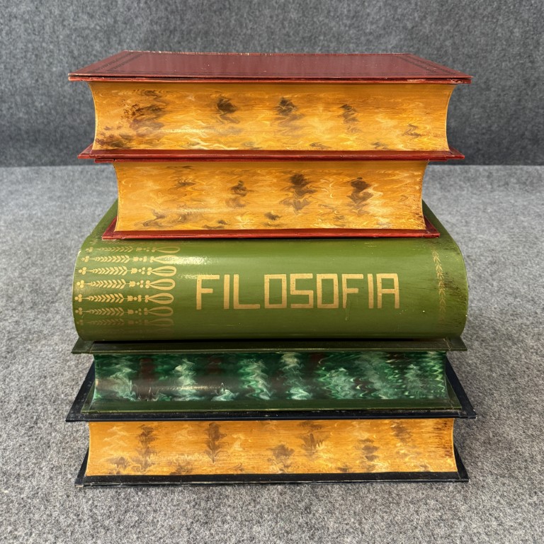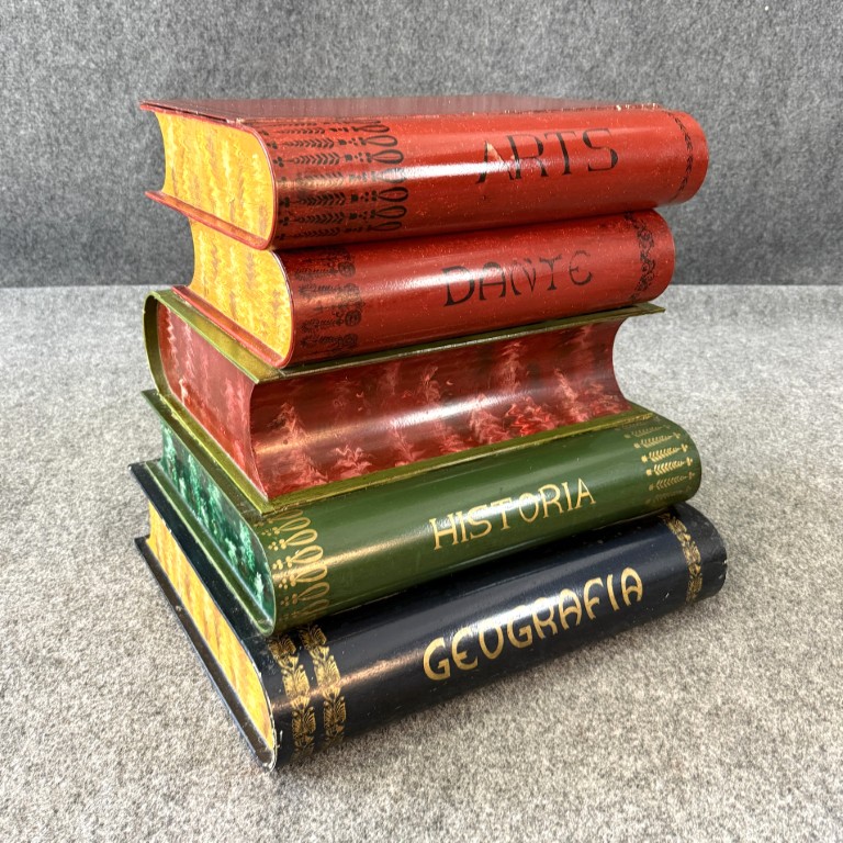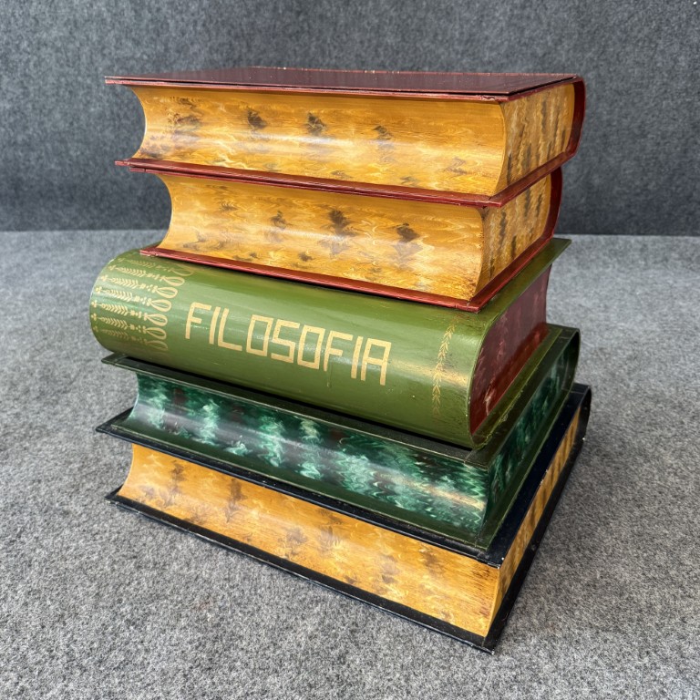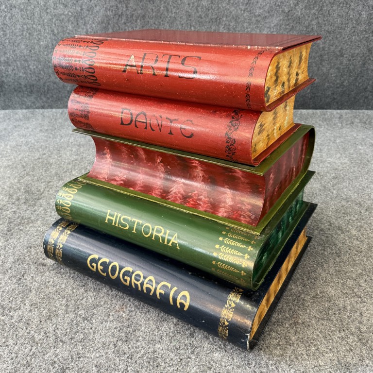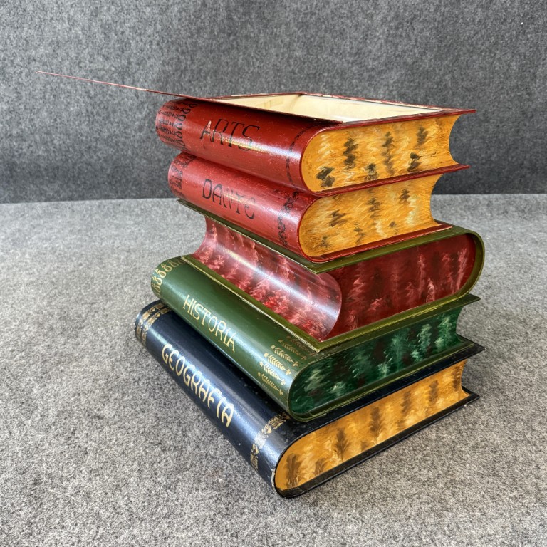This Italian-made metal side table is designed to resemble a stack of colorful, oversized books labeled with subjects such as Filosofia, Historia, and Geografia. The hinged top opens to reveal a hidden storage compartment, making it both decorative and functional. Its hand-painted finish and whimsical literary theme add charm to any eclectic or library-inspired space.