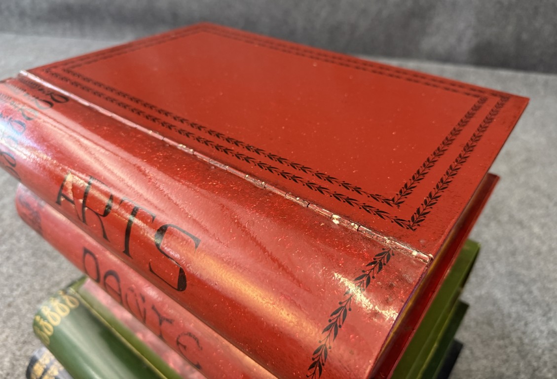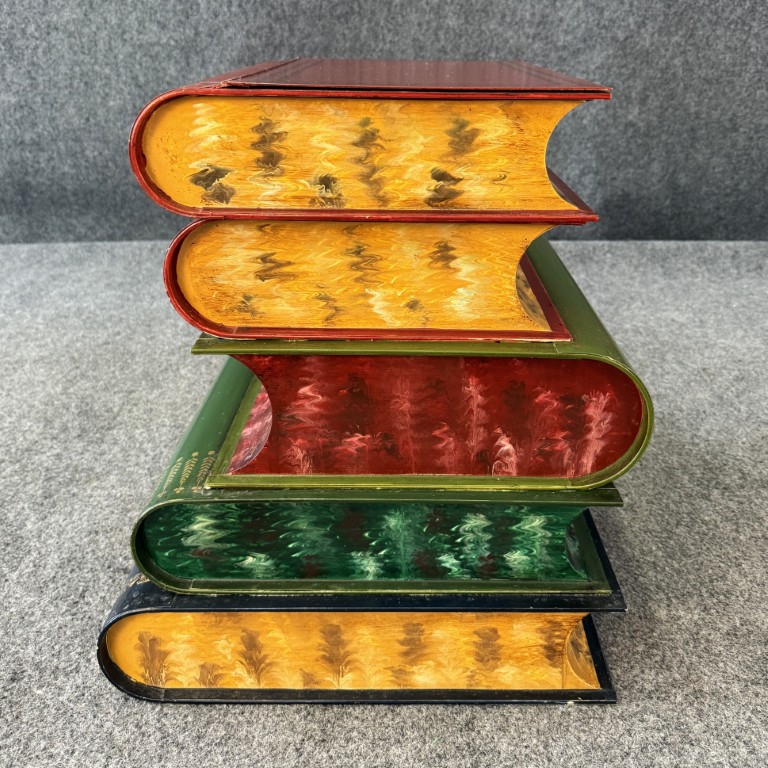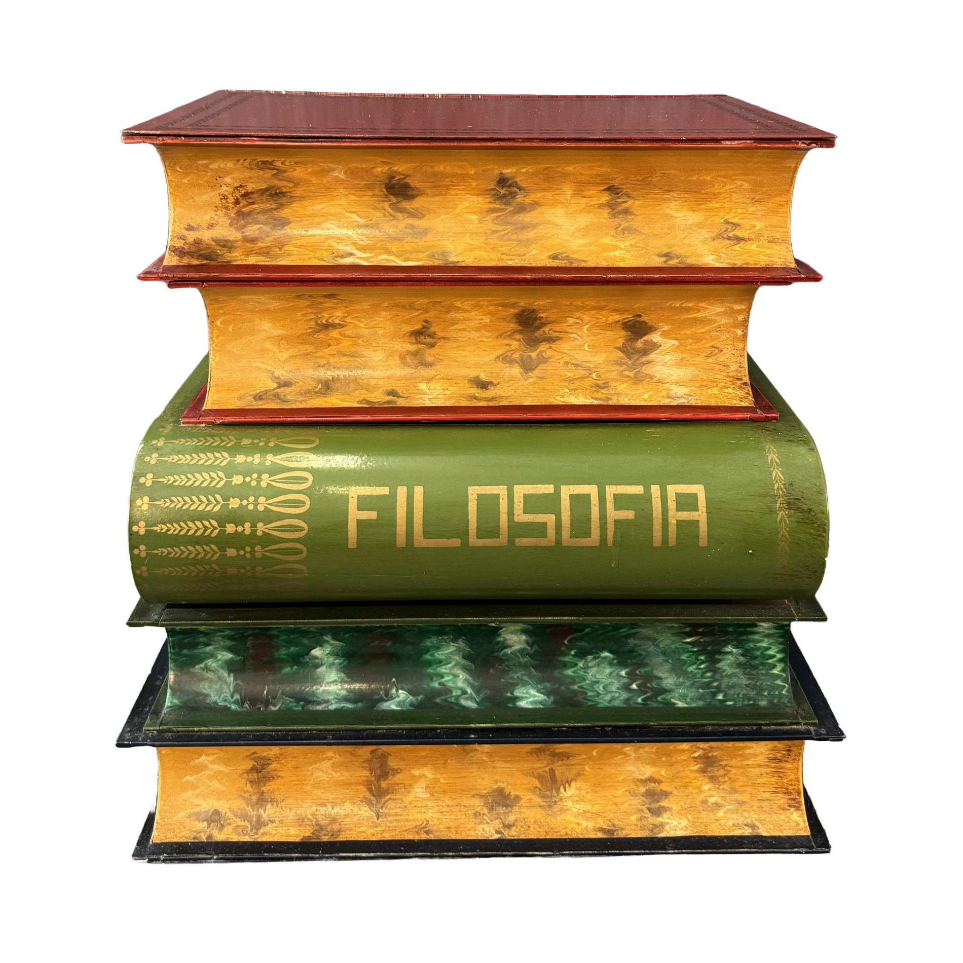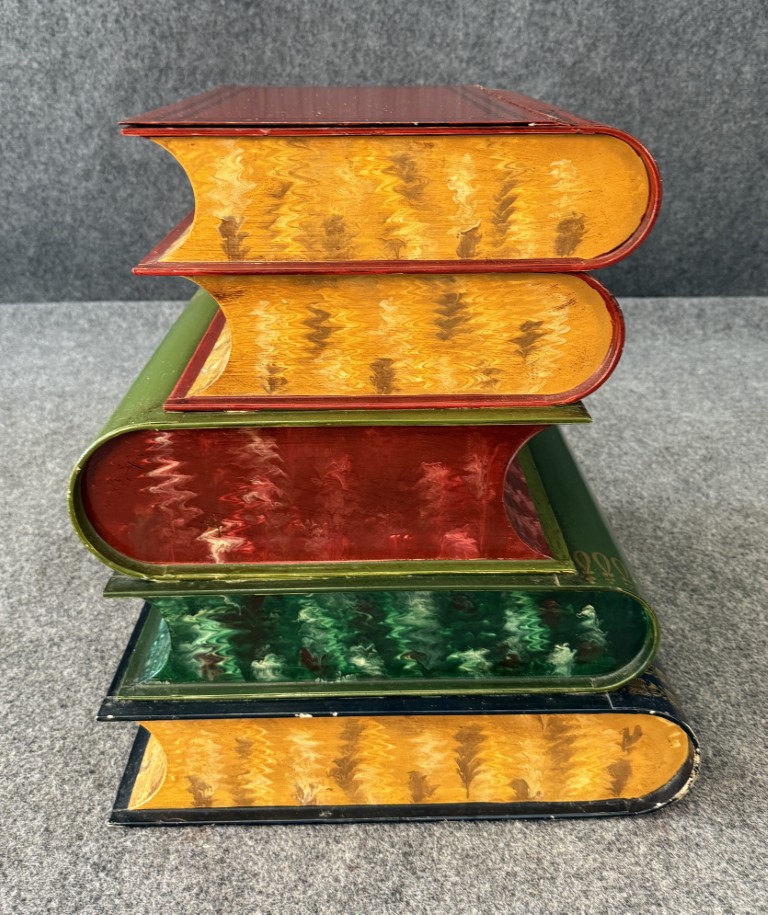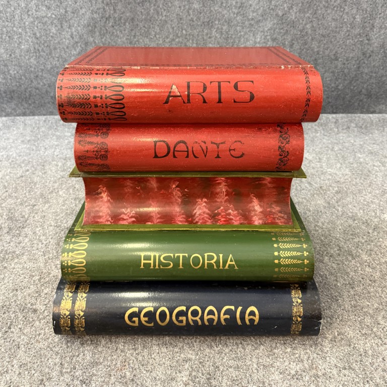 This Italian-made metal side table is designed to resemble a stack of colorful, oversized books labeled with subjects such as Filosofia, Historia, and Geografia. The hinged top opens to reveal a hidden storage compartment, making it both decorative and functional. Its hand-painted finish and whimsical literary theme add charm to any eclectic or library-inspired space.