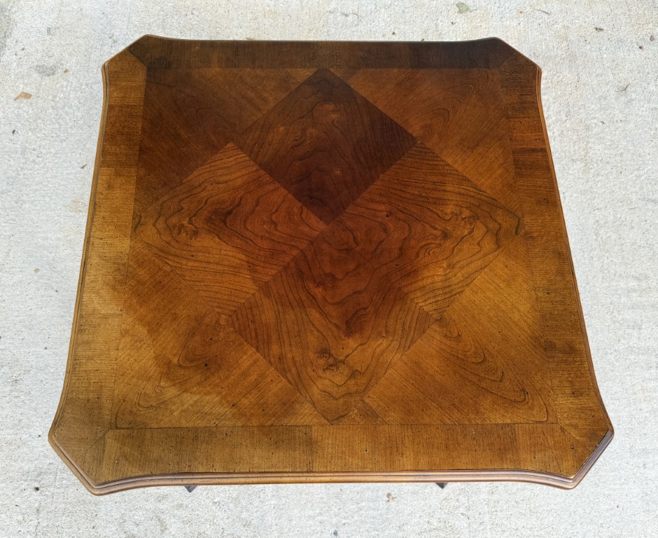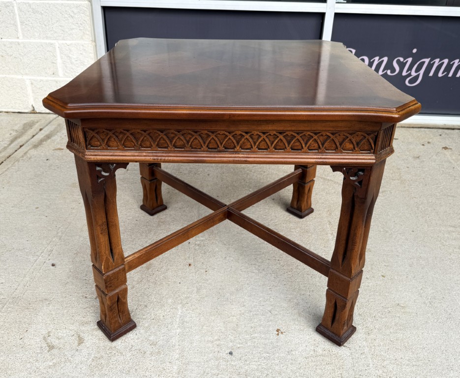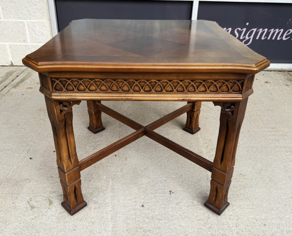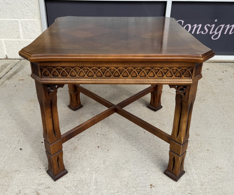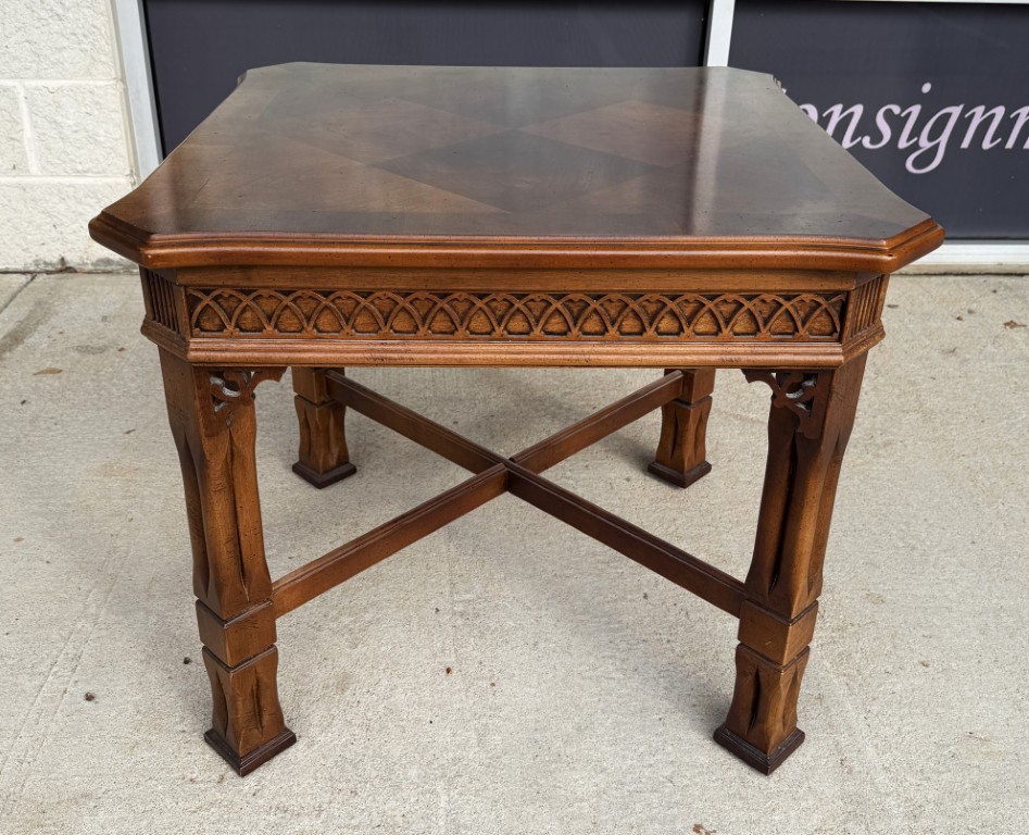This Lane mahogany and walnut side table, No. 1247, features a beautifully figured parquetry top with a diamond-pattern veneer framed by subtly shaped edges. The carved apron, cross-stretcher base, and warm finish reflect the refined craftsmanship and traditional styling for which Lane Furniture is well known.