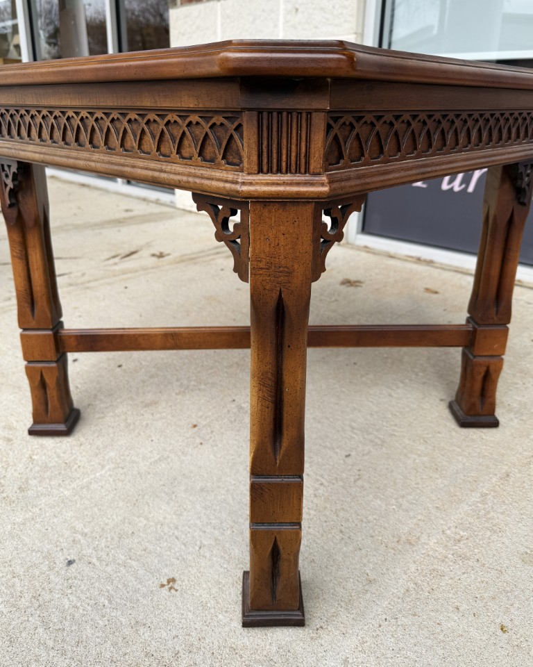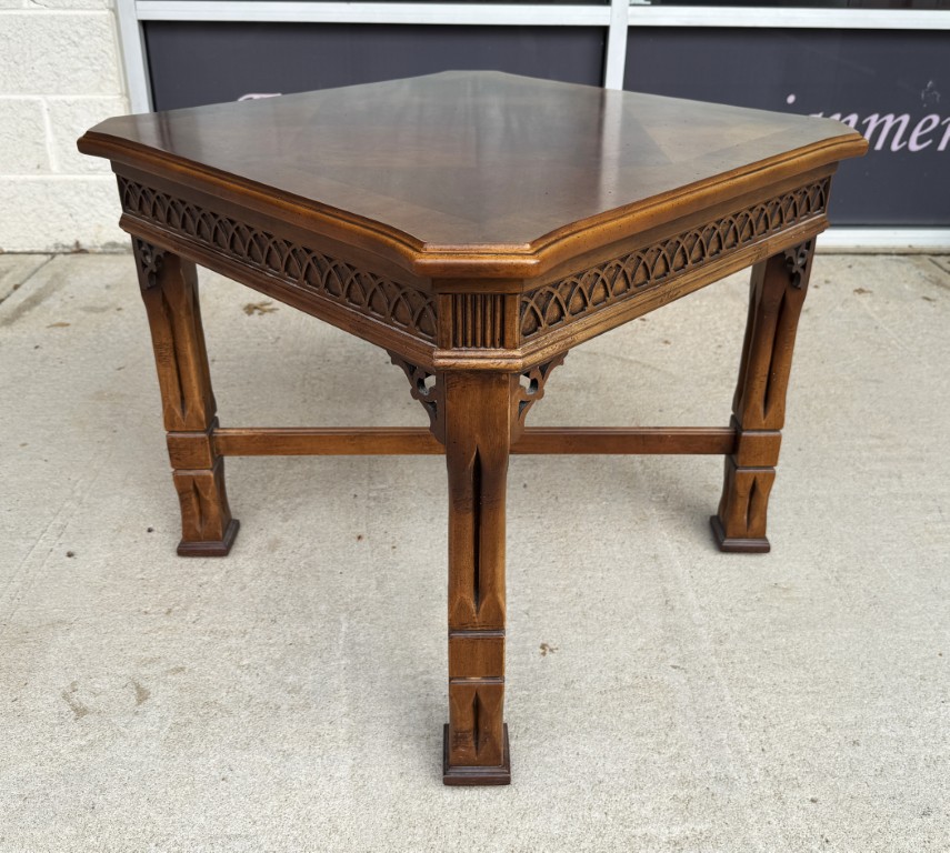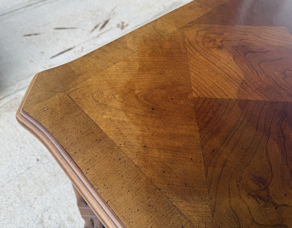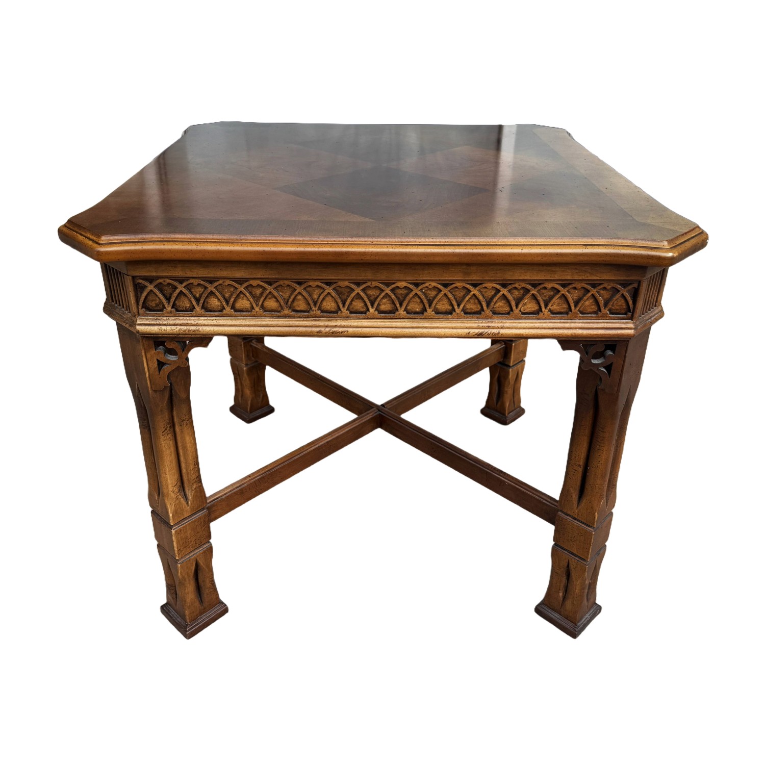 This Lane mahogany and walnut side table, No. 1247, features a beautifully figured parquetry top with a diamond-pattern veneer framed by subtly shaped edges. The carved apron, cross-stretcher base, and warm finish reflect the refined craftsmanship and traditional styling for which Lane Furniture is well known.