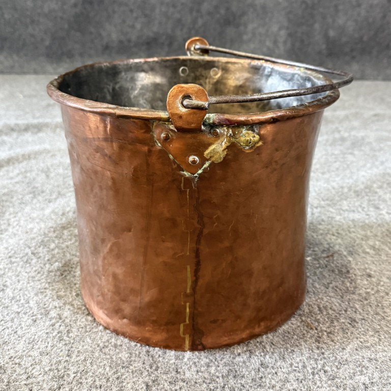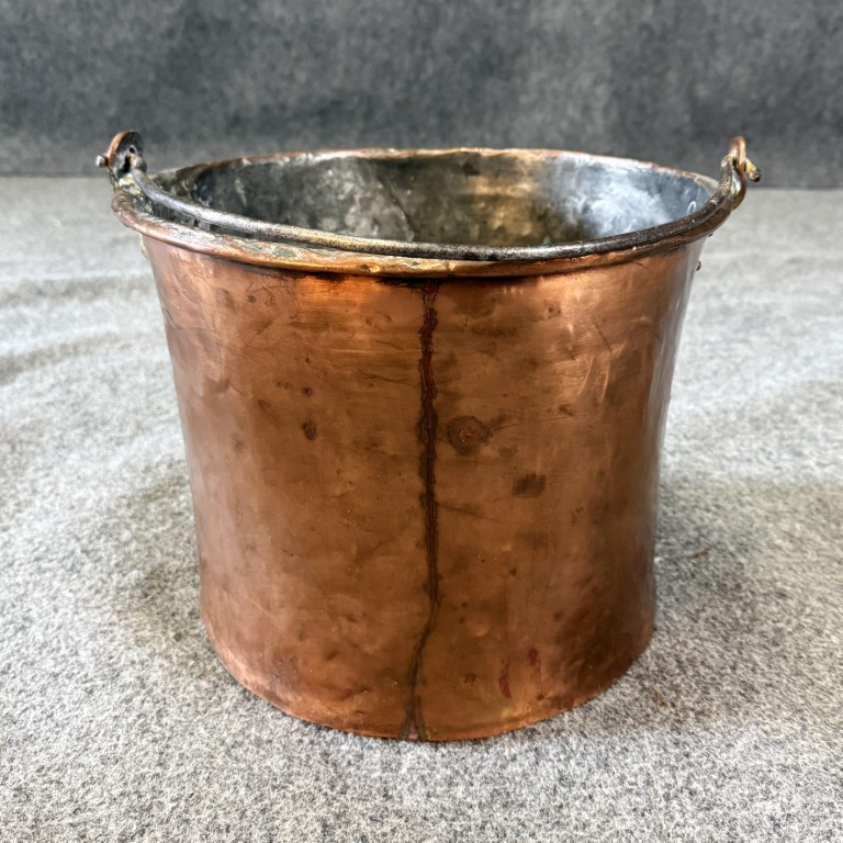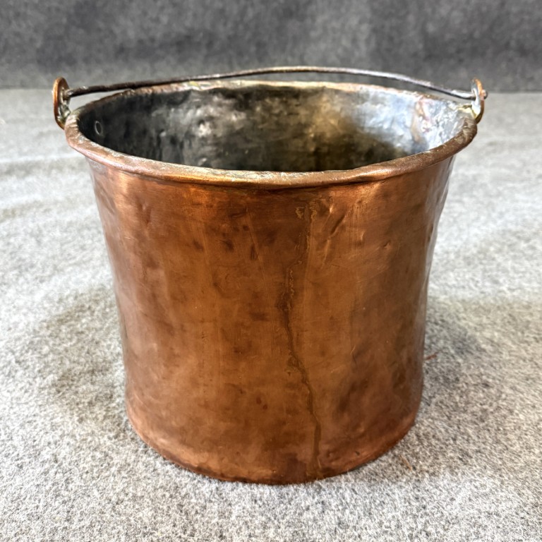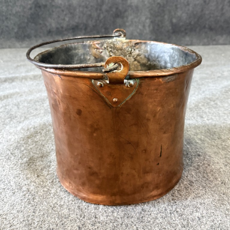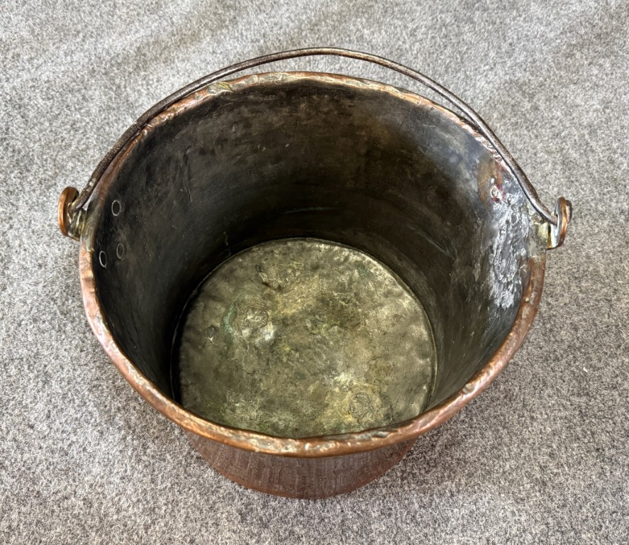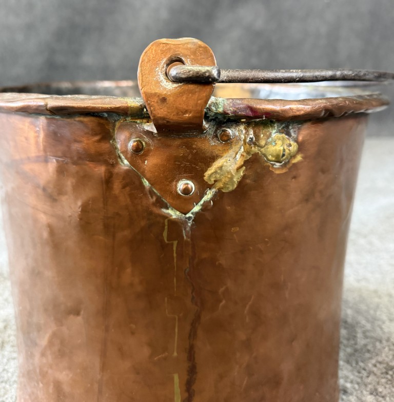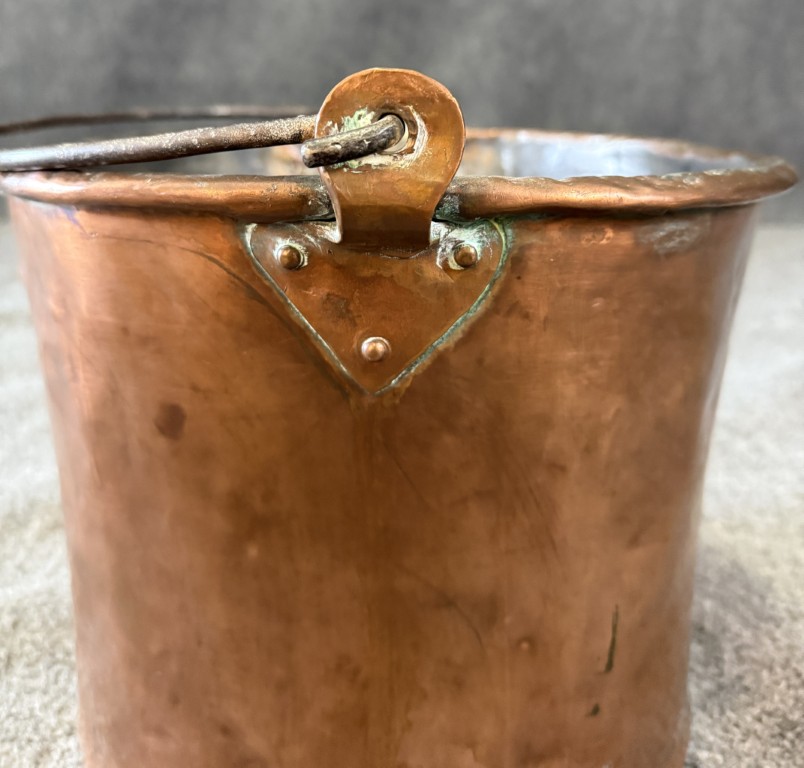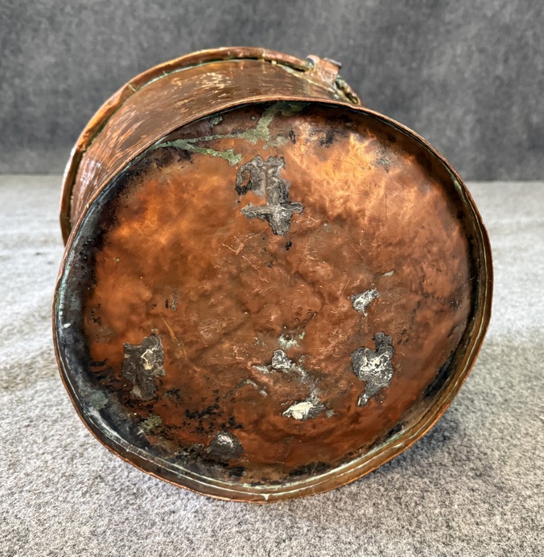 This large antique hammered copper pot features a beautifully aged patina with a durable zinc-lined interior, showcasing both form and function. Accented by a sturdy swing handle and hand-riveted construction, it offers rustic character ideal for decorative or utilitarian use.