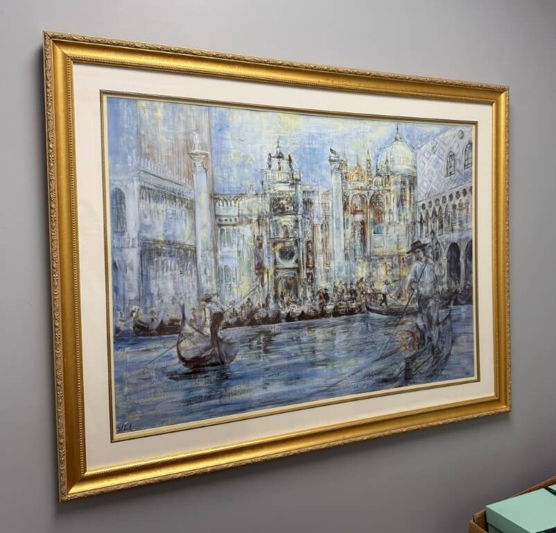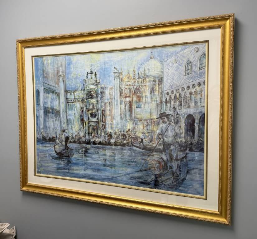 This large limited edition print, number 236 of 1000, of “Venice Lagoon” by Edna Hibel beautifully captures the romance of Venice with softly layered brushwork, shimmering water, and elegant architectural detail. Rendered in her signature impressionistic style, the piece evokes a timeless European atmosphere, making it a refined and visually engaging addition to any space.
