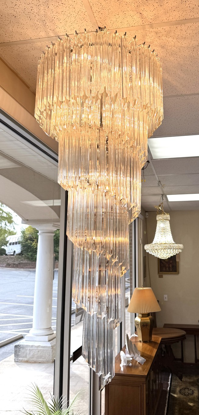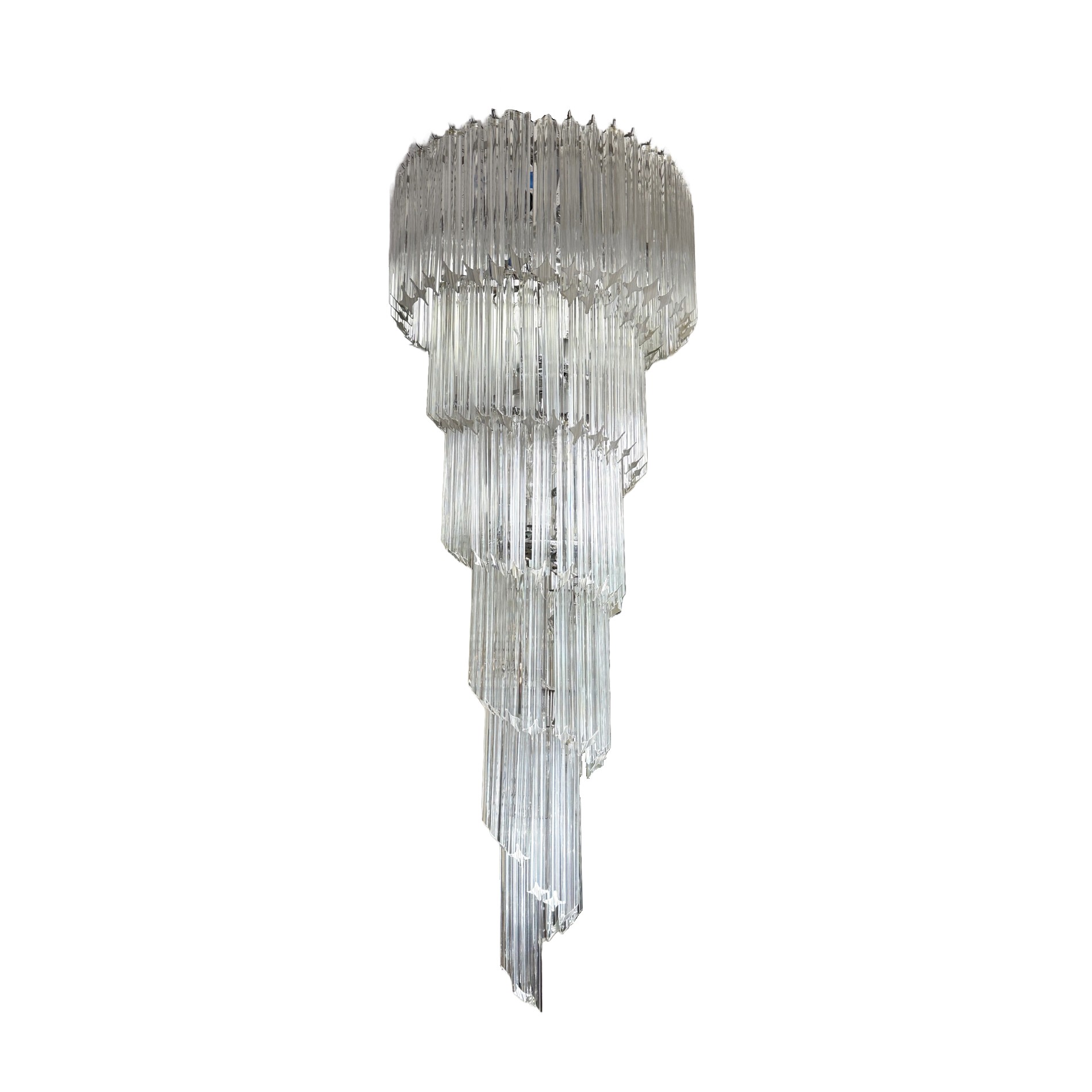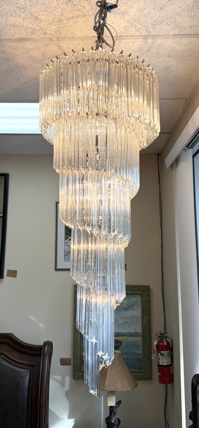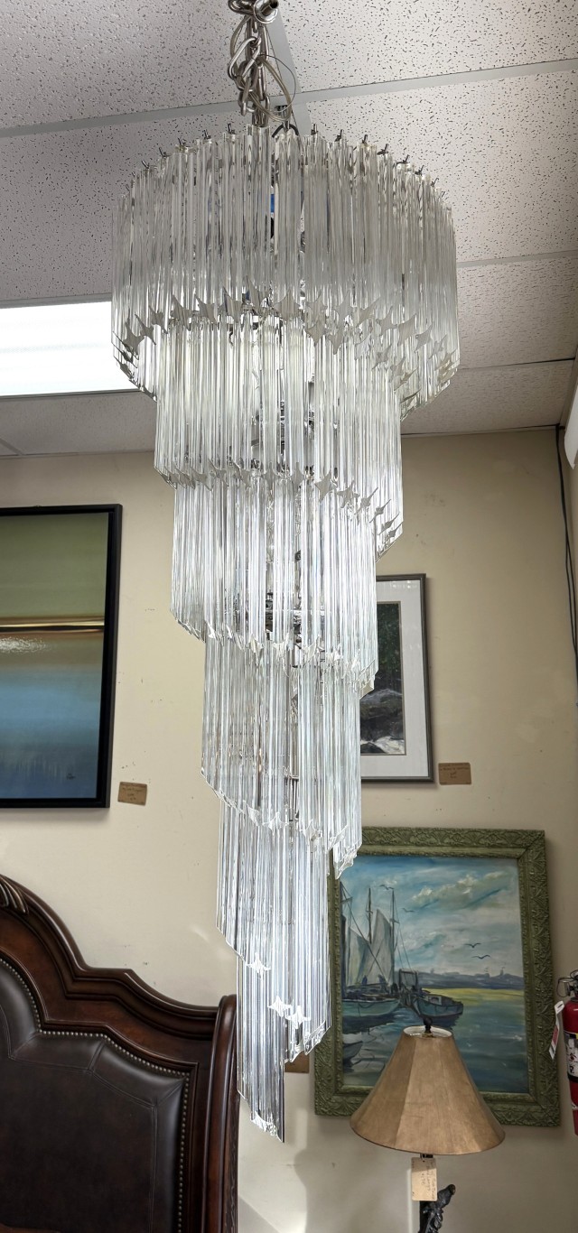 This Large Ornate Spiral Crystal Chandelier features cascading tiers of faceted glass prisms arranged in a dramatic swirling design that captures and reflects light beautifully. The elongated clear crystals create an elegant waterfall effect, producing a stunning play of brilliance from every angle. Perfect for grand entryways or dining spaces, this chandelier combines modern glamour with timeless sophistication.