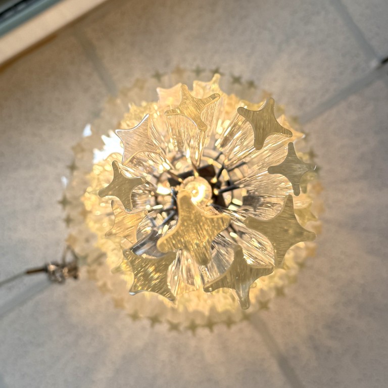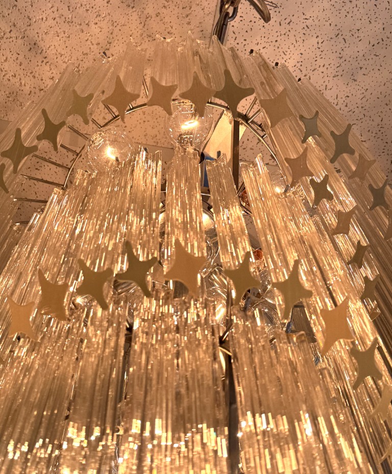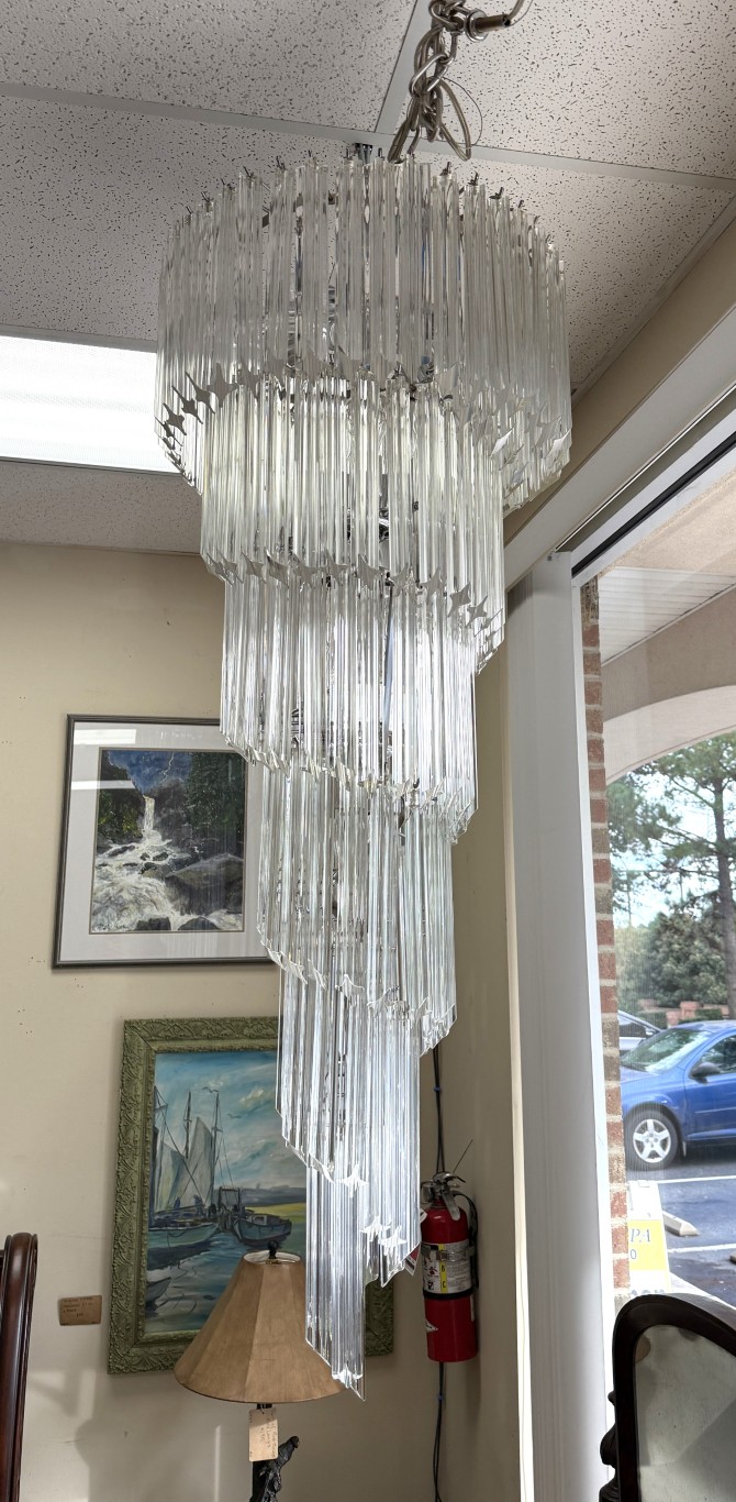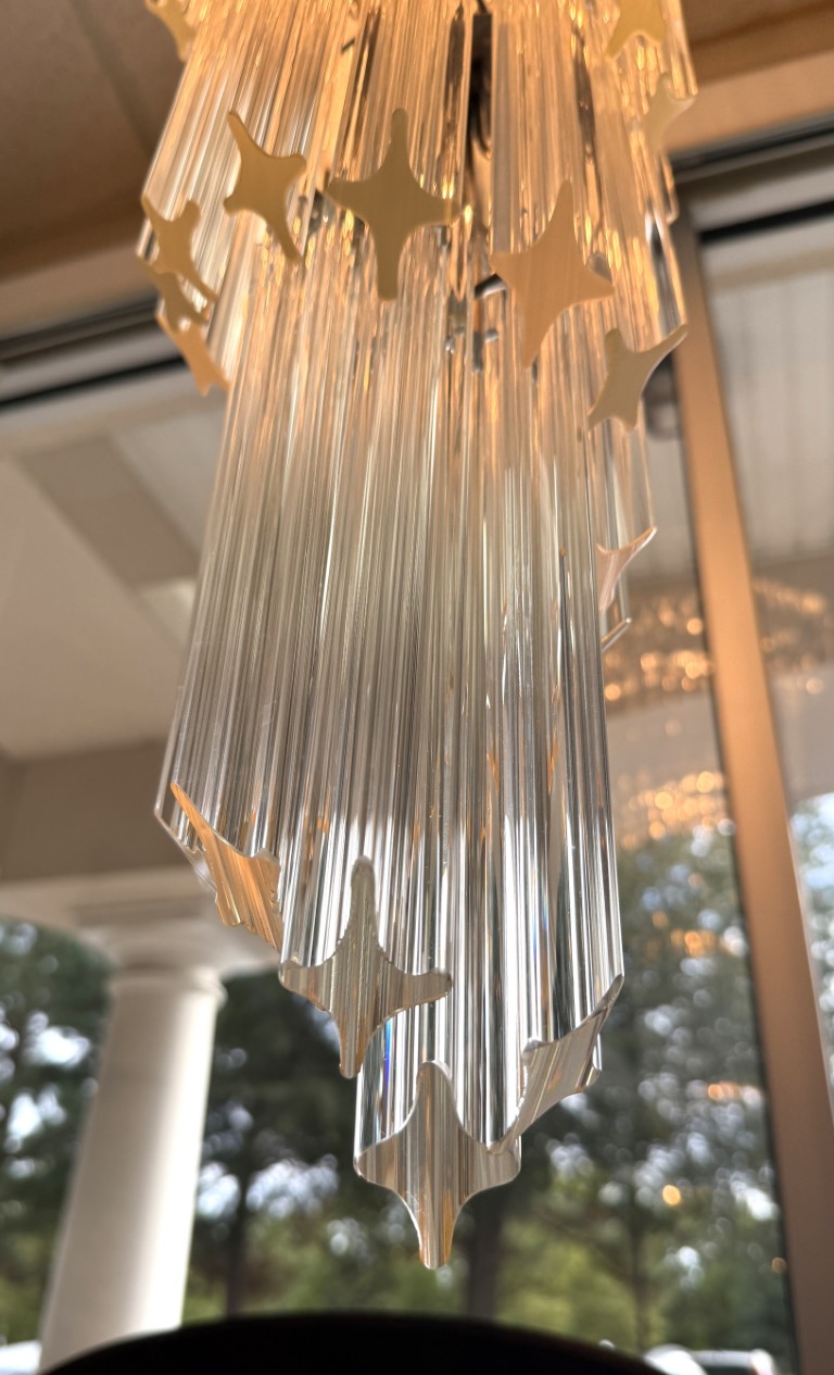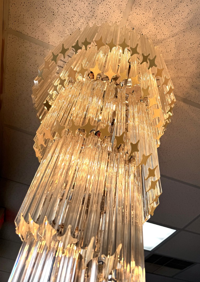 This Large Ornate Spiral Crystal Chandelier features cascading tiers of faceted glass prisms arranged in a dramatic swirling design that captures and reflects light beautifully. The elongated clear crystals create an elegant waterfall effect, producing a stunning play of brilliance from every angle. Perfect for grand entryways or dining spaces, this chandelier combines modern glamour with timeless sophistication.